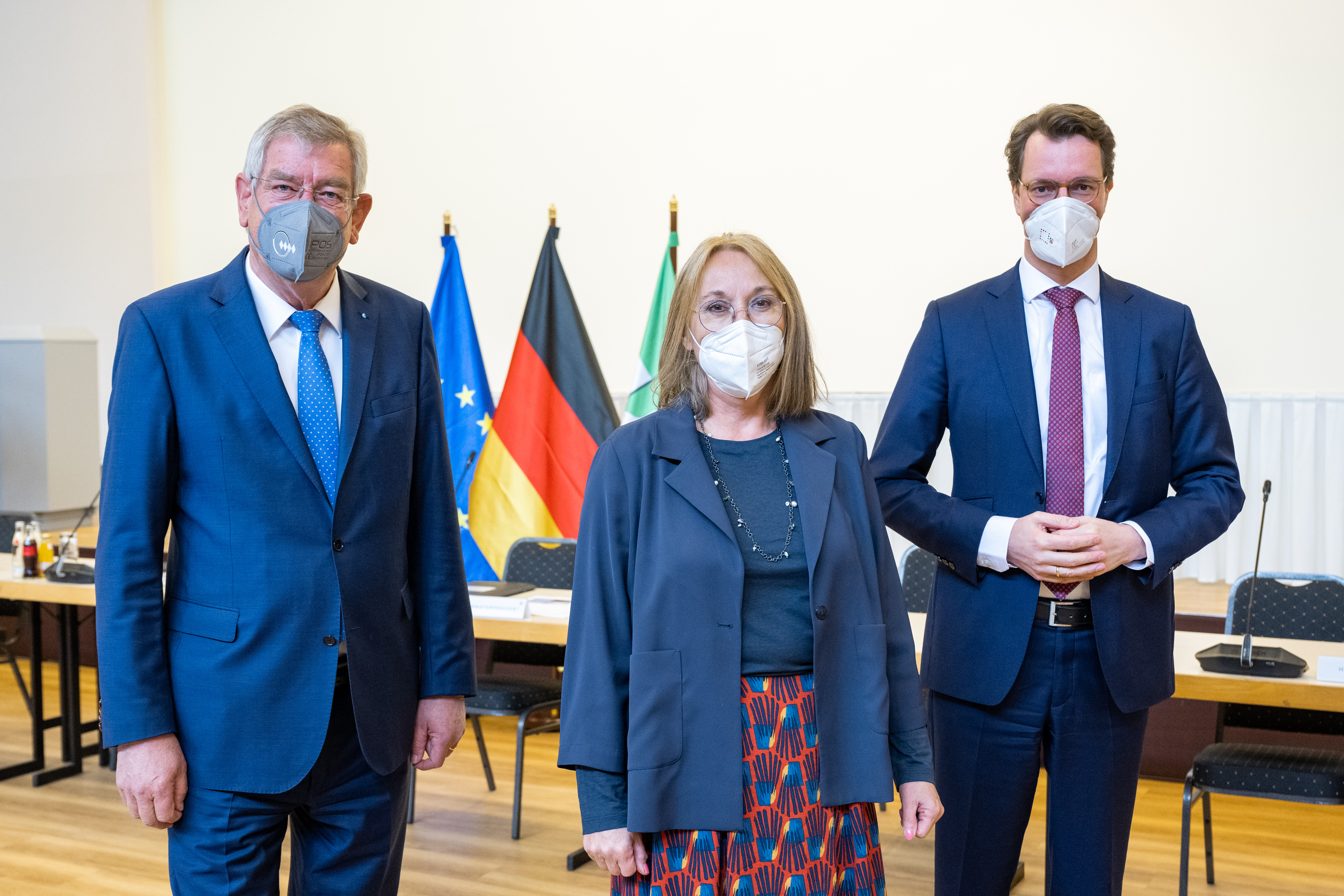 Ministerpräsident Hendrik Wüst, die Vorsitzende des Deutschen Gewerkschaftsbundes, Anja Weber, und Arndt G. Kirchhoff, Präsident der Landesvereinigung der Unternehmensverbände Nordrhein-Westfalen, informieren im Nachgang des Spitzengesprächs zu den Folgen des Angriffs Russlands auf die Ukraine für Versorgungssicherheit und Arbeitsplätze in Nordrhein-Westfalen in einer Pressekonferenz.