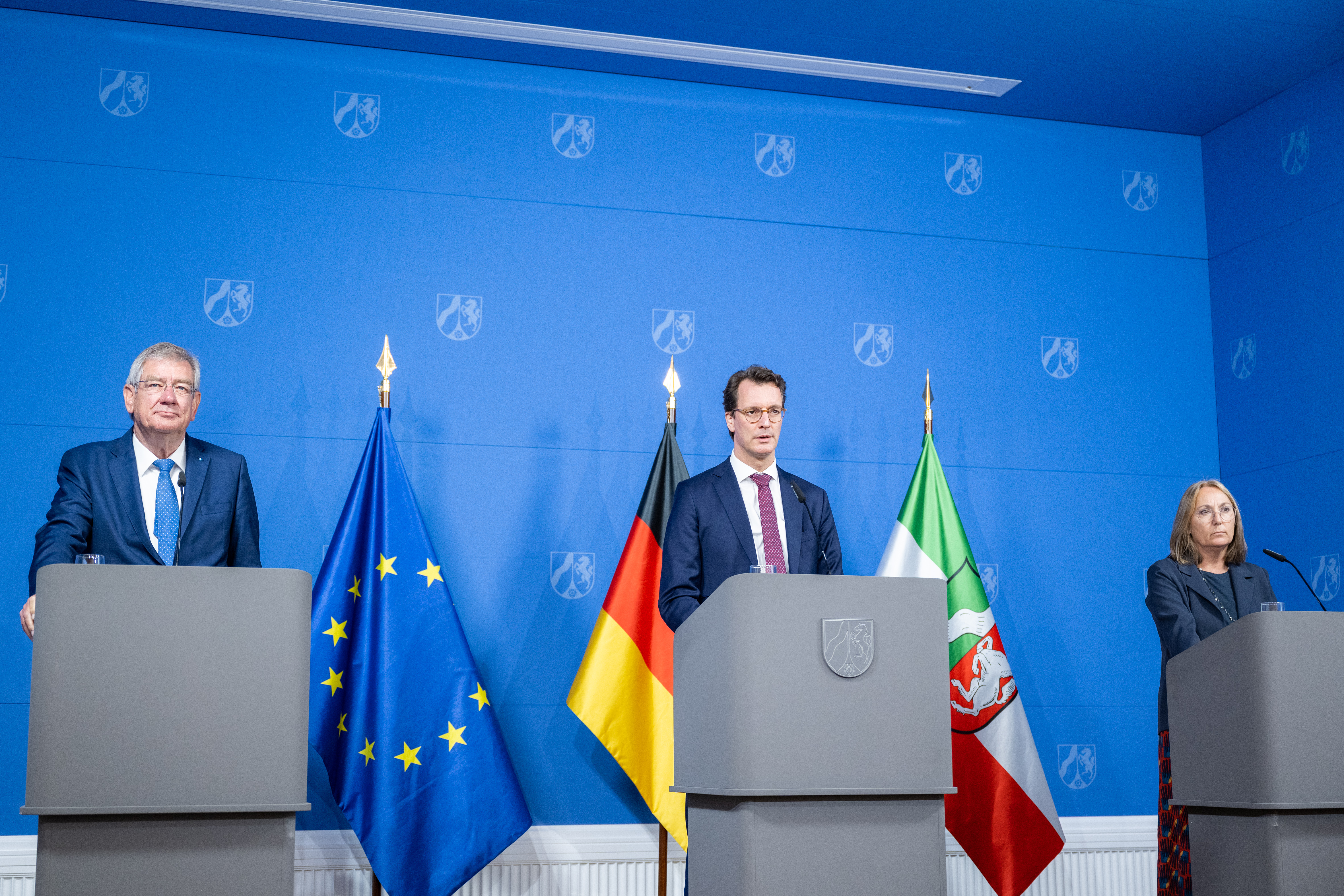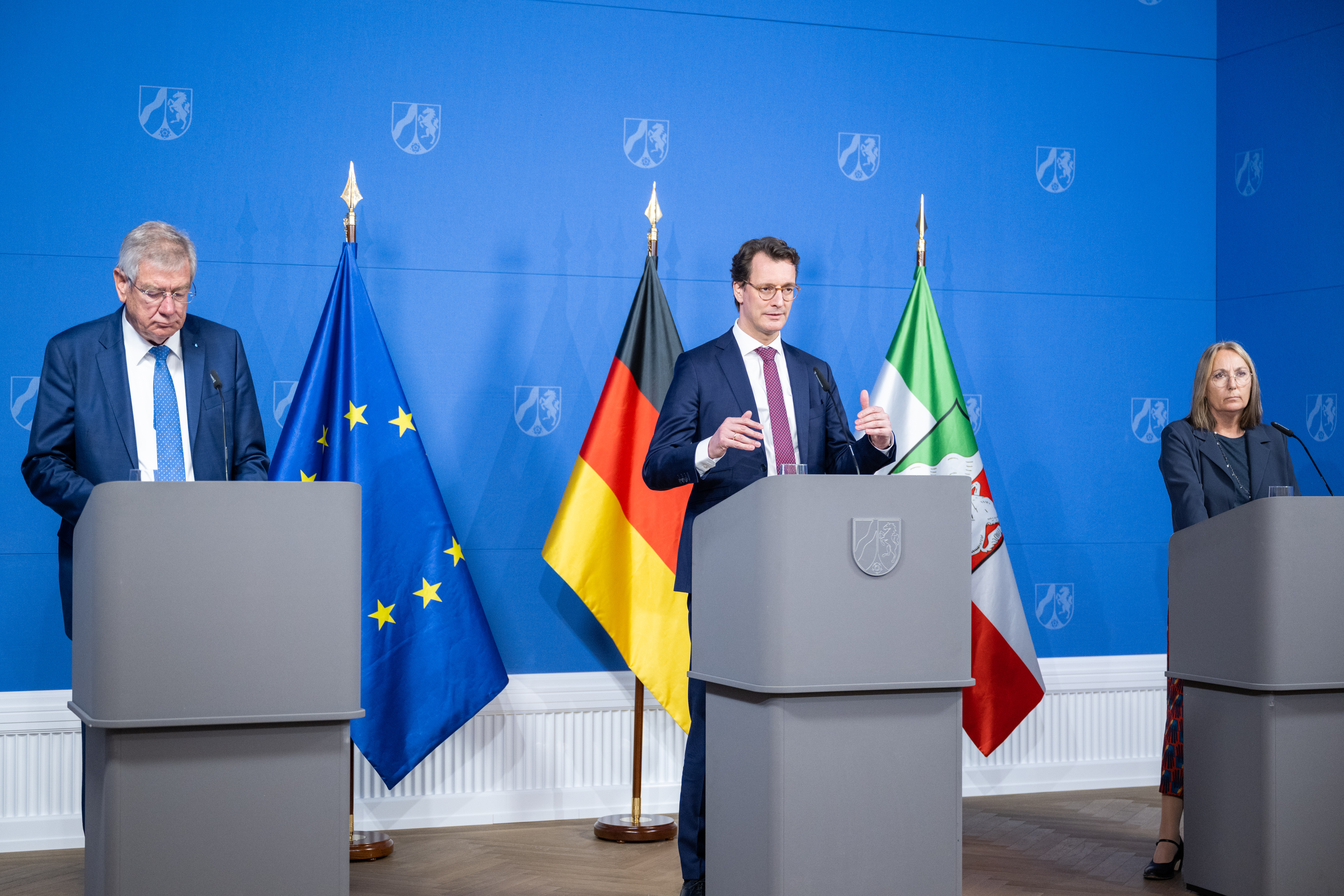 Ministerpräsident Hendrik Wüst, die Vorsitzende des Deutschen Gewerkschaftsbundes, Anja Weber, und Arndt G. Kirchhoff, Präsident der Landesvereinigung der Unternehmensverbände Nordrhein-Westfalen, informieren im Nachgang des Spitzengesprächs zu den Folgen des Angriffs Russlands auf die Ukraine für Versorgungssicherheit und Arbeitsplätze in Nordrhein-Westfalen in einer Pressekonferenz.