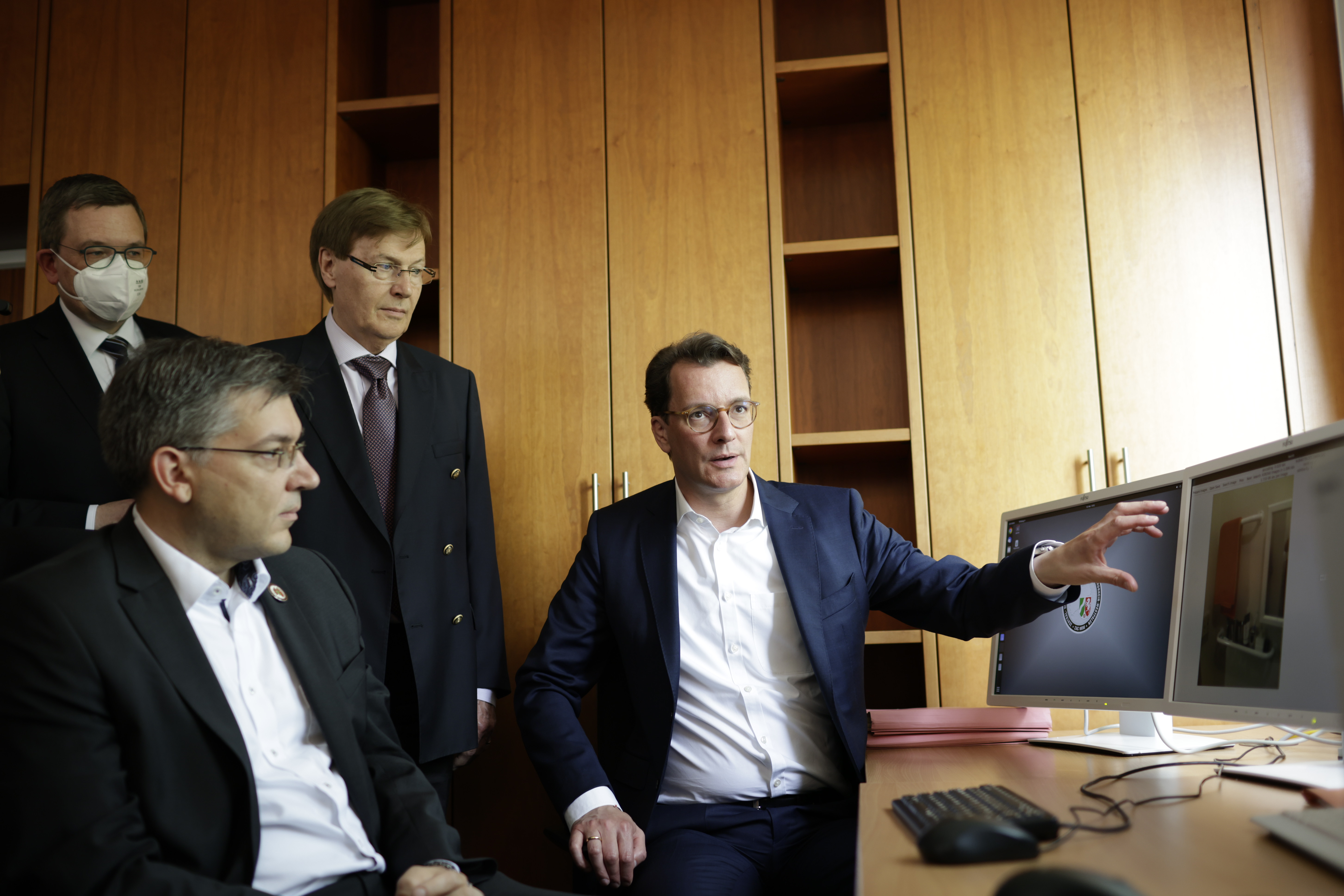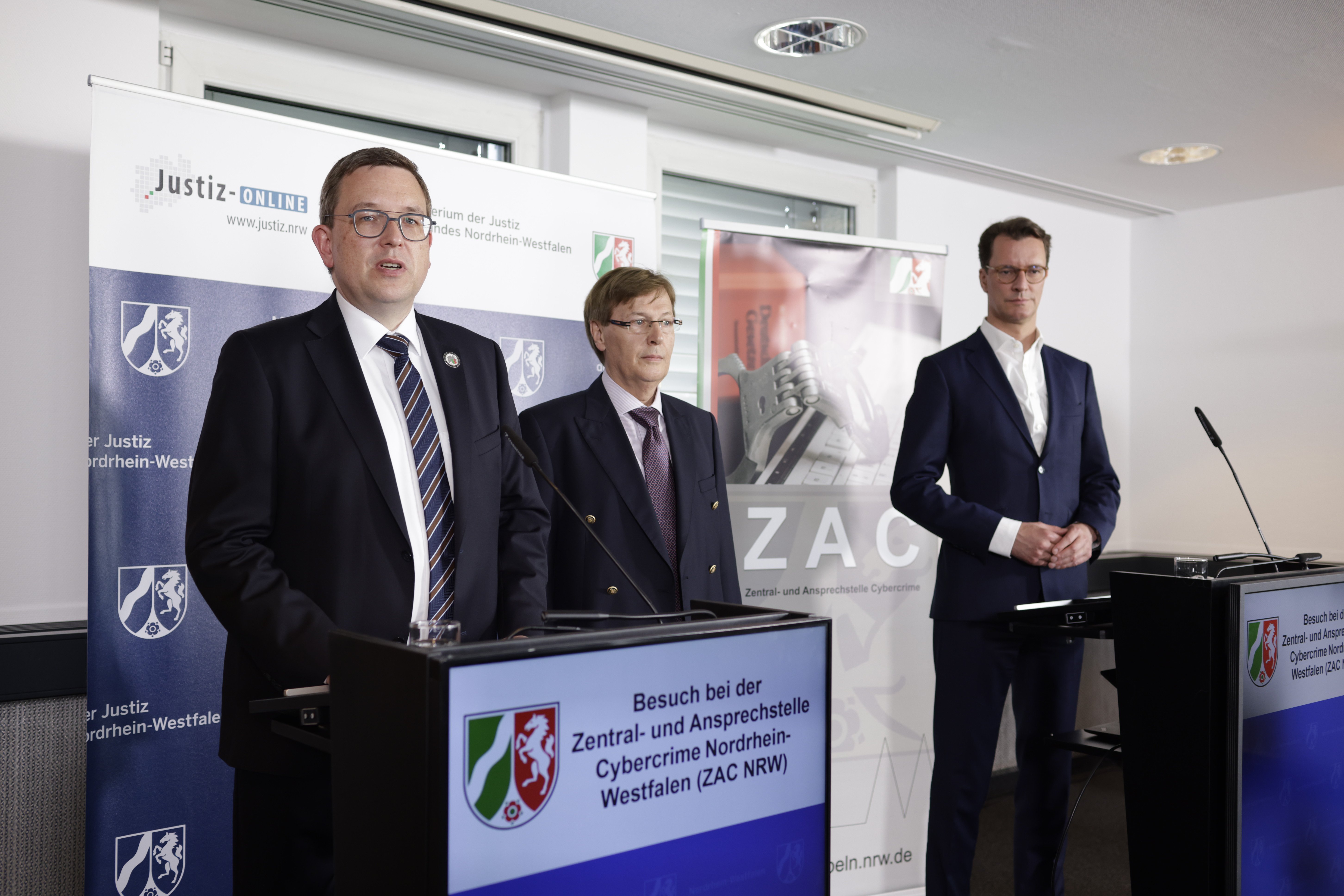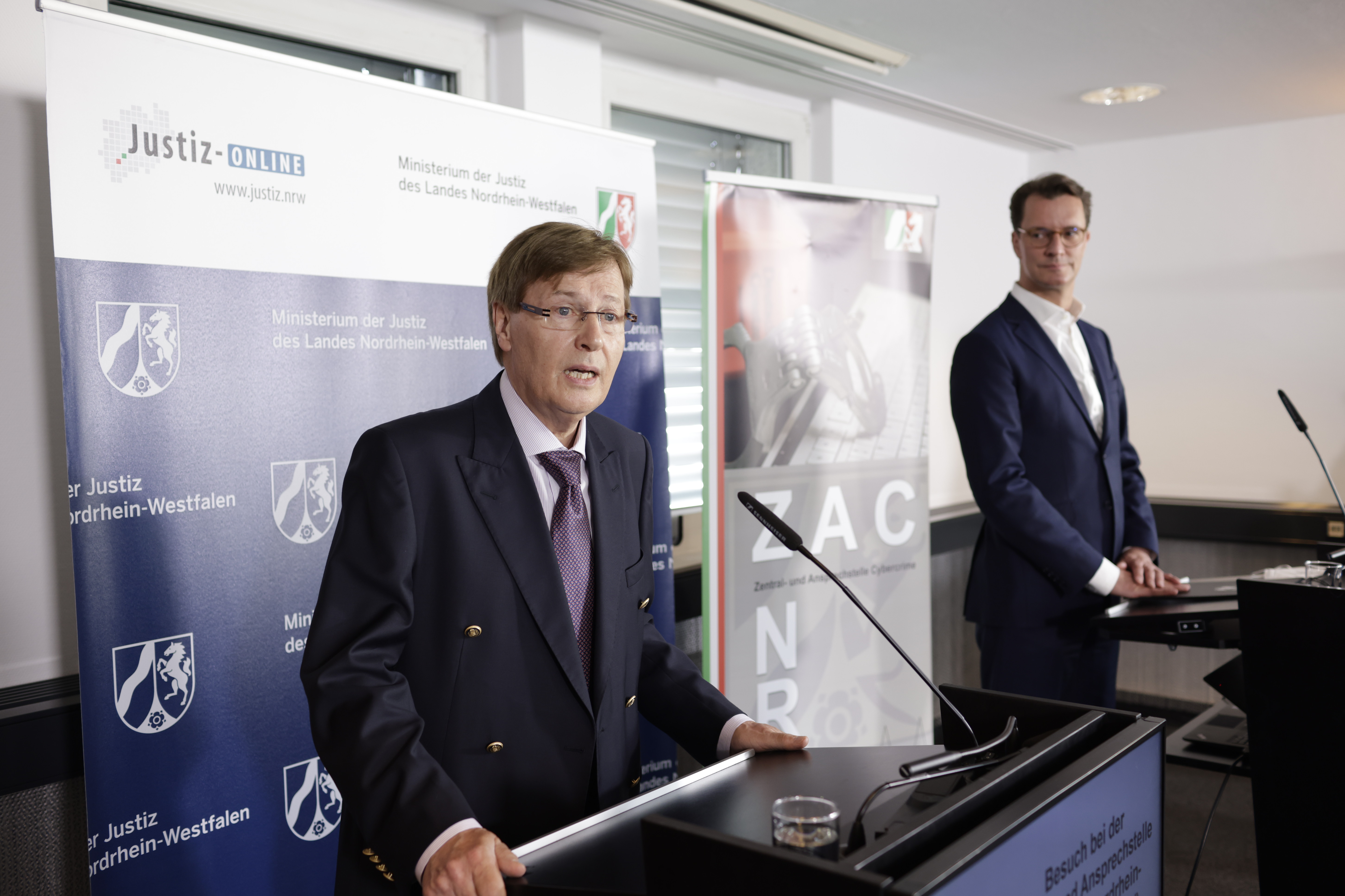 Ministerpräsident Hendrik Wüst und Justizminister Peter Biesenbach haben sich am Dienstag (10. Mai 2022) bei der Zentral- und Ansprechstelle Cybercrime Nordrhein-Westfalen (ZAC NRW) in Köln über die Bekämpfung der Cyberkriminalität informiert. Sie trafen mit Staatsanwältinnen und Staatsanwälten aus unterschiedlichen Bereichen der digitalen Strafverfolgung zusammen und erhielten aktuelle Einblicke in deren Arbeit.