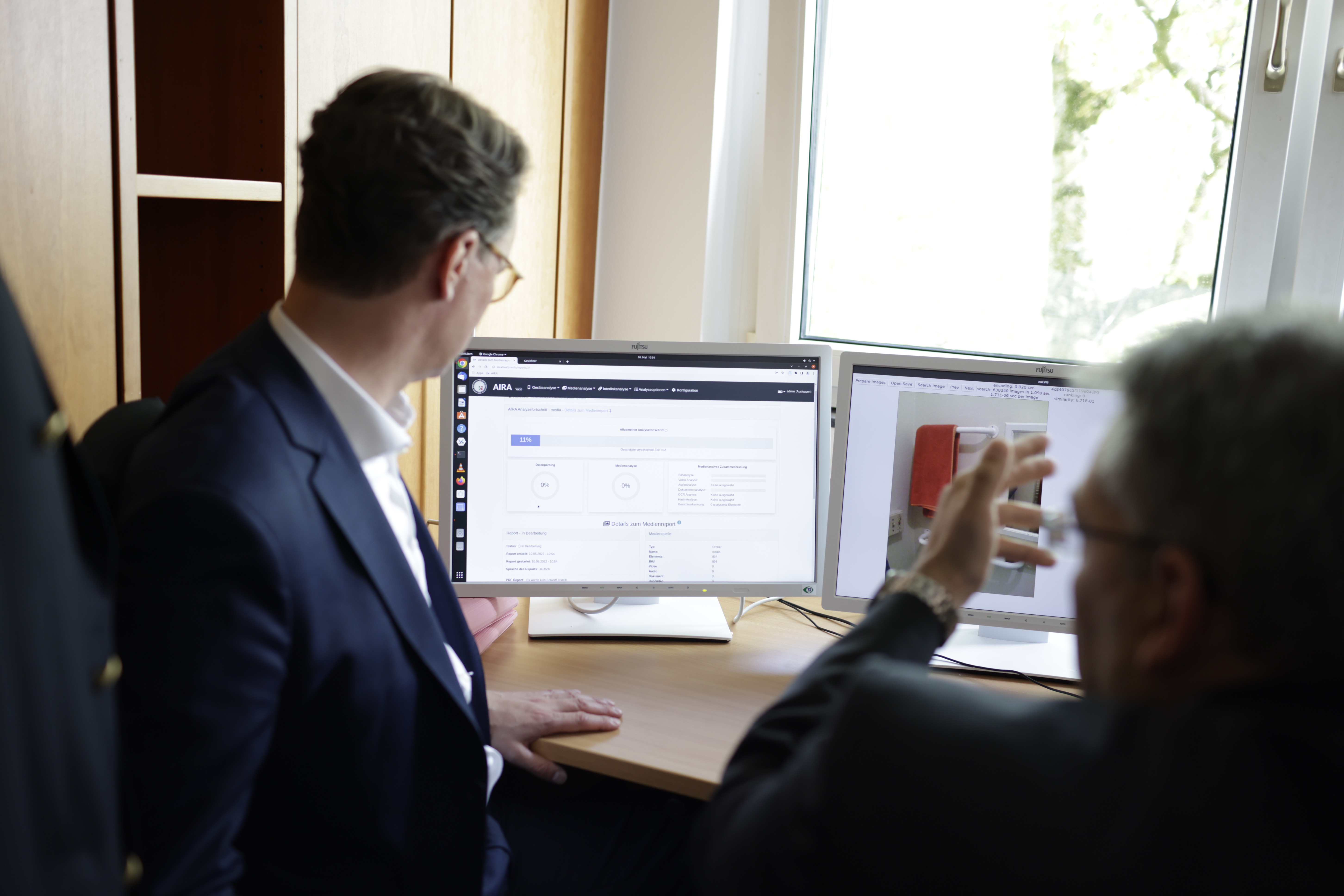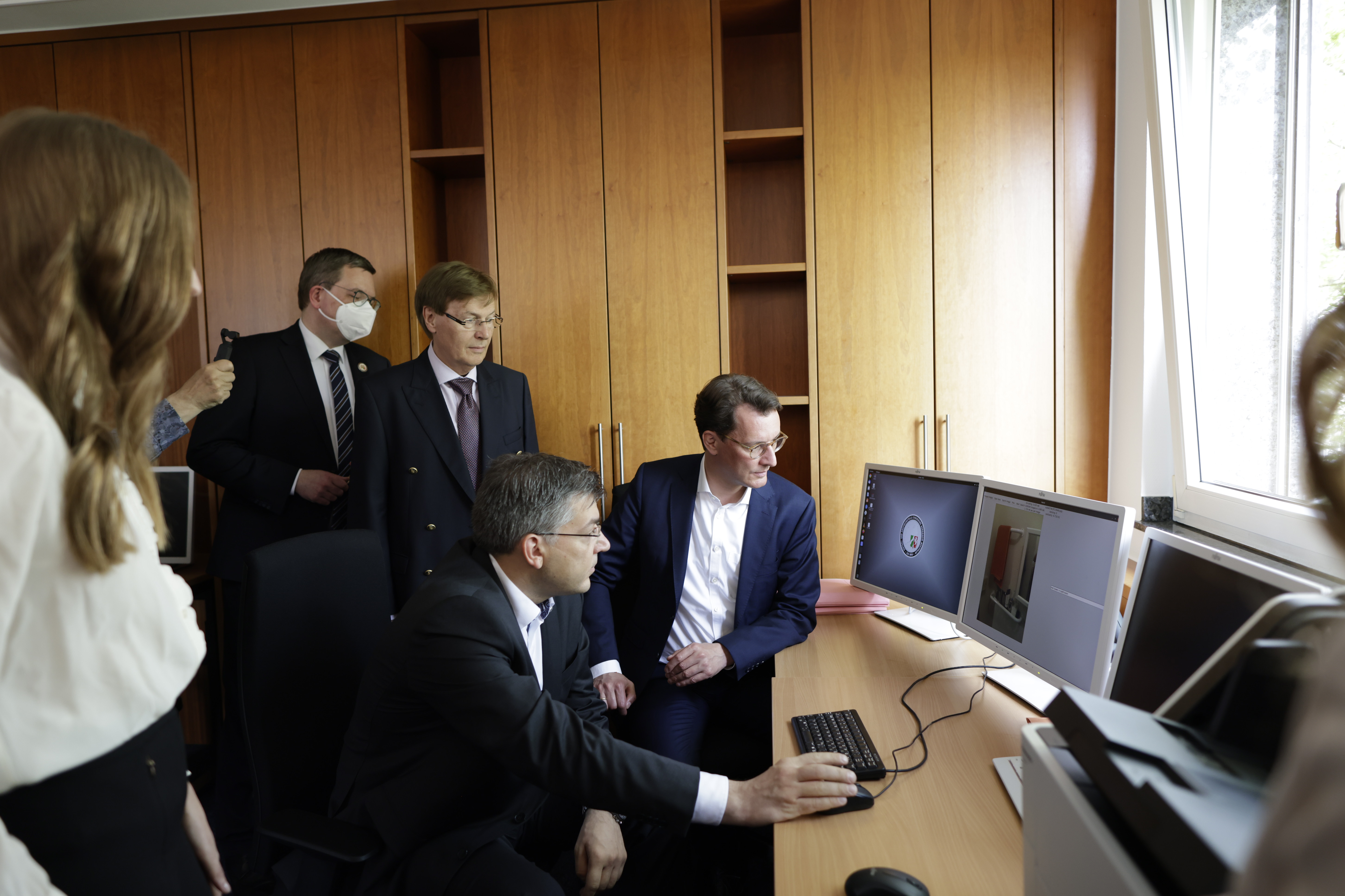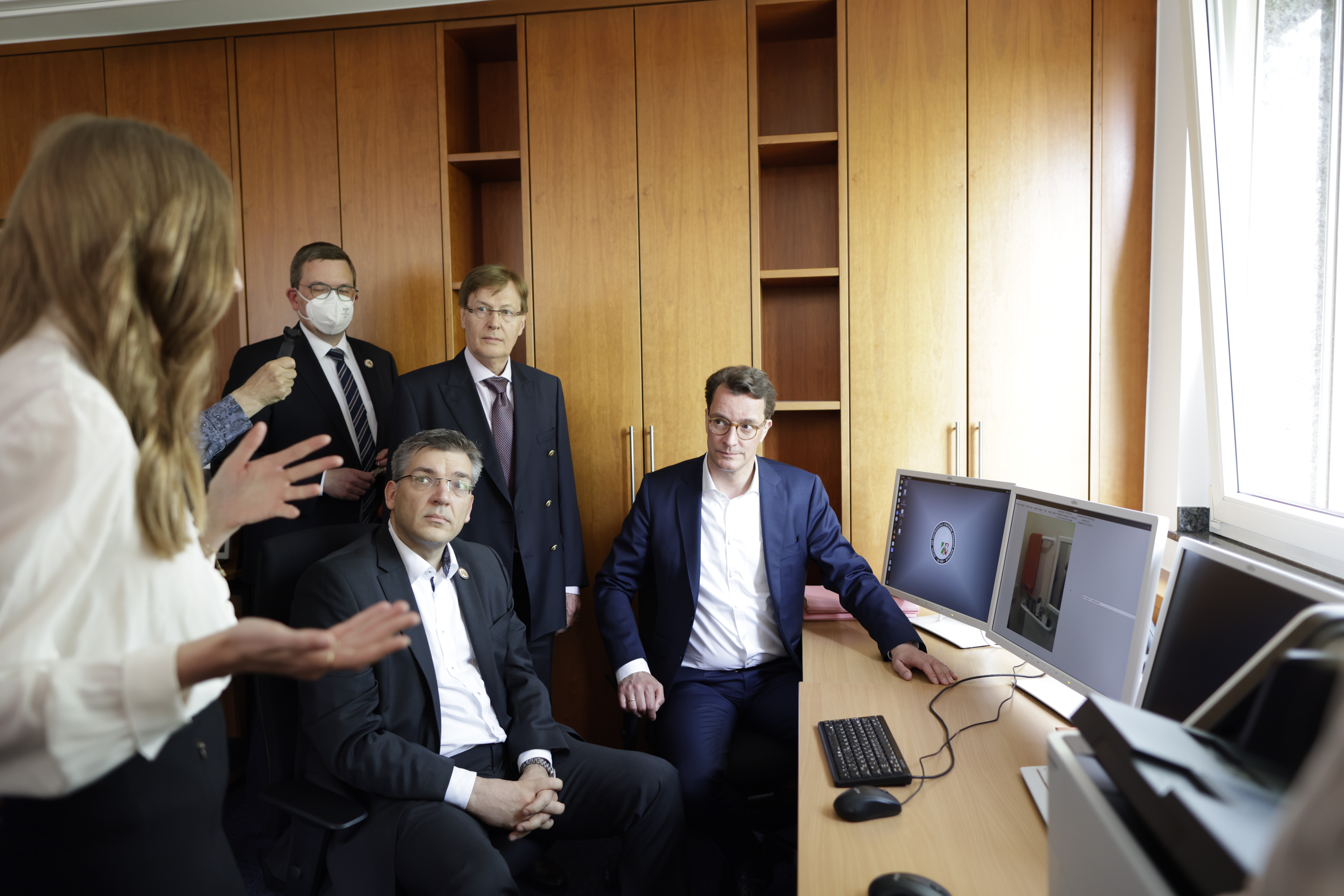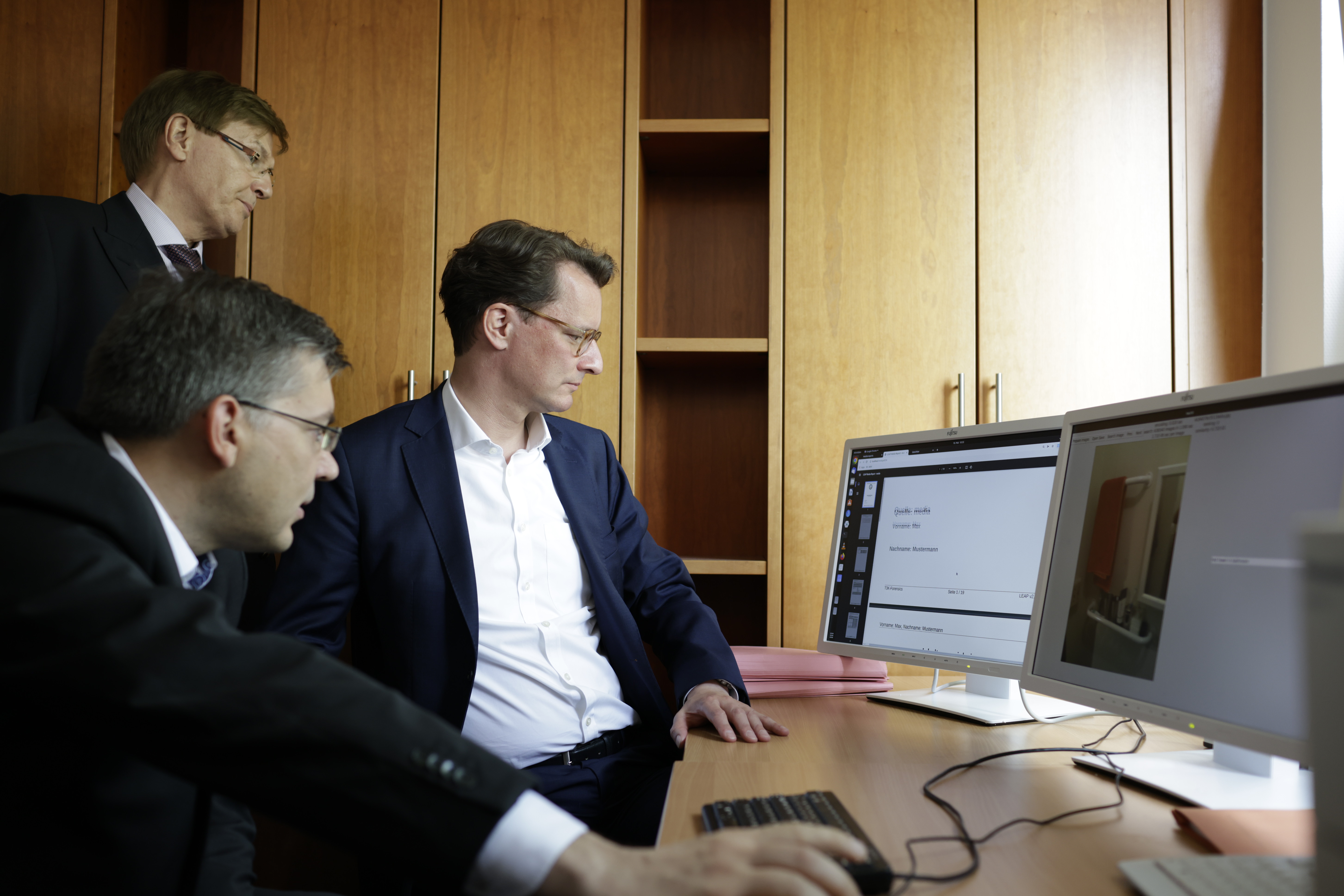 Ministerpräsident Hendrik Wüst und Justizminister Peter Biesenbach haben sich am Dienstag (10. Mai 2022) bei der Zentral- und Ansprechstelle Cybercrime Nordrhein-Westfalen (ZAC NRW) in Köln über die Bekämpfung der Cyberkriminalität informiert. Sie trafen mit Staatsanwältinnen und Staatsanwälten aus unterschiedlichen Bereichen der digitalen Strafverfolgung zusammen und erhielten aktuelle Einblicke in deren Arbeit.