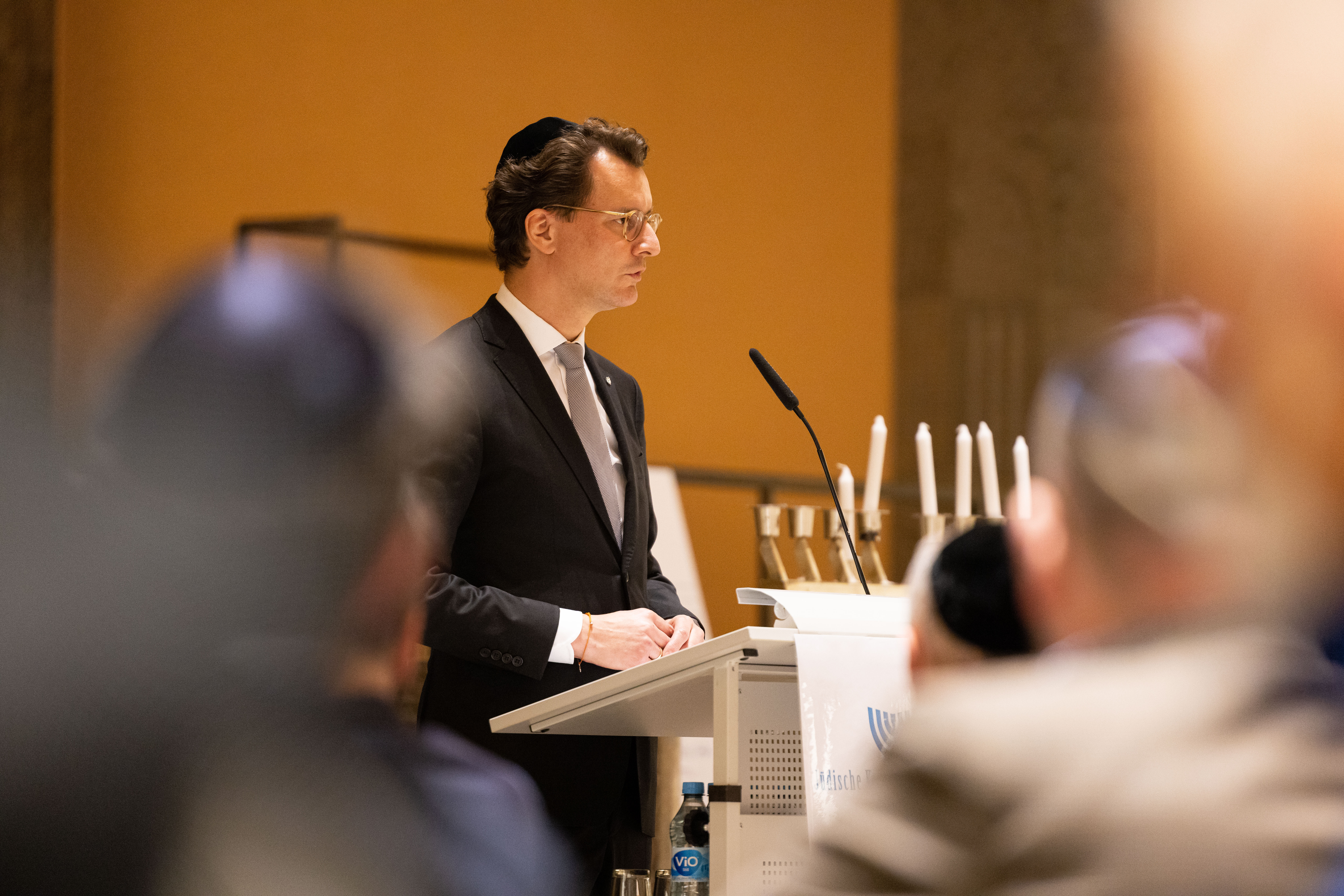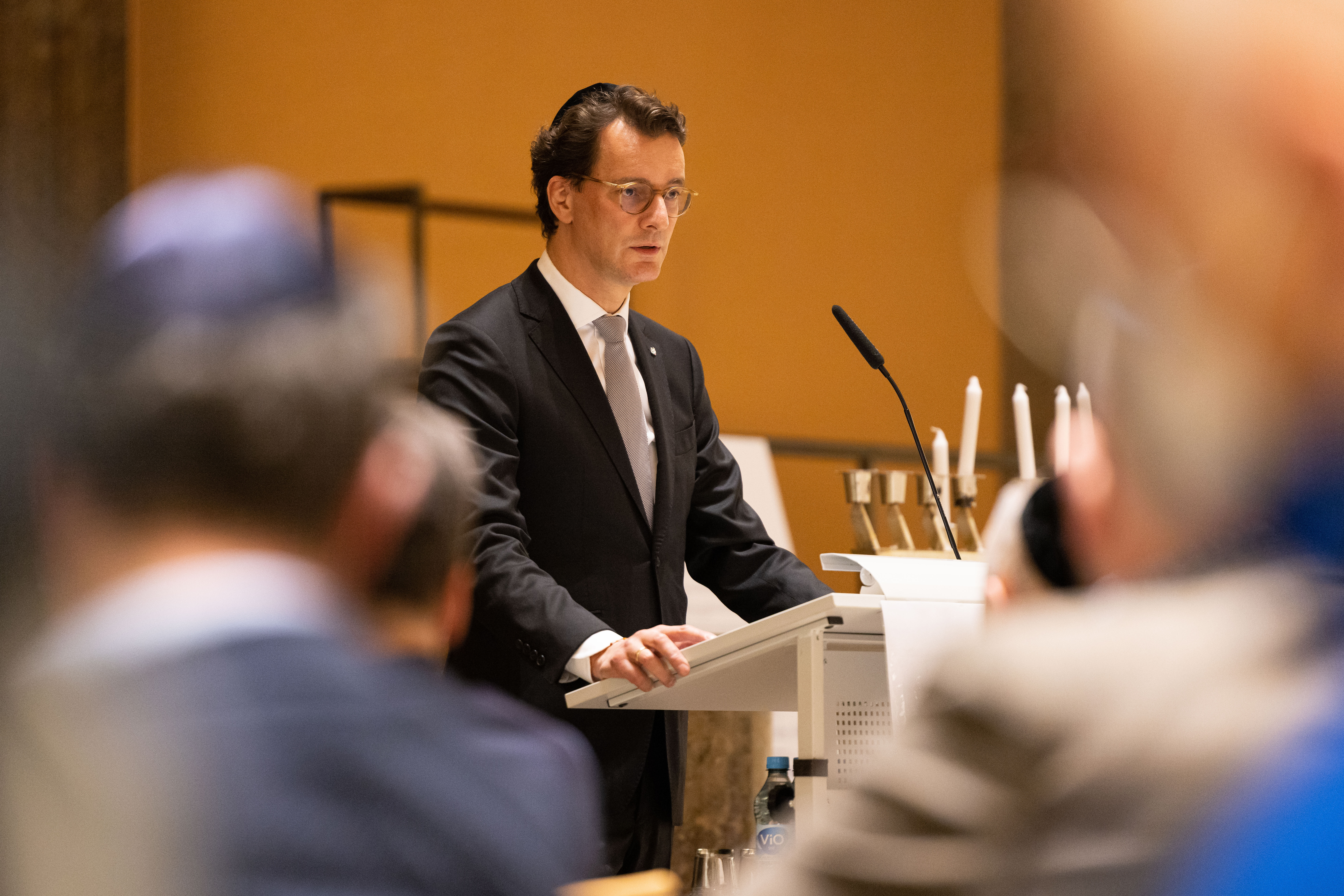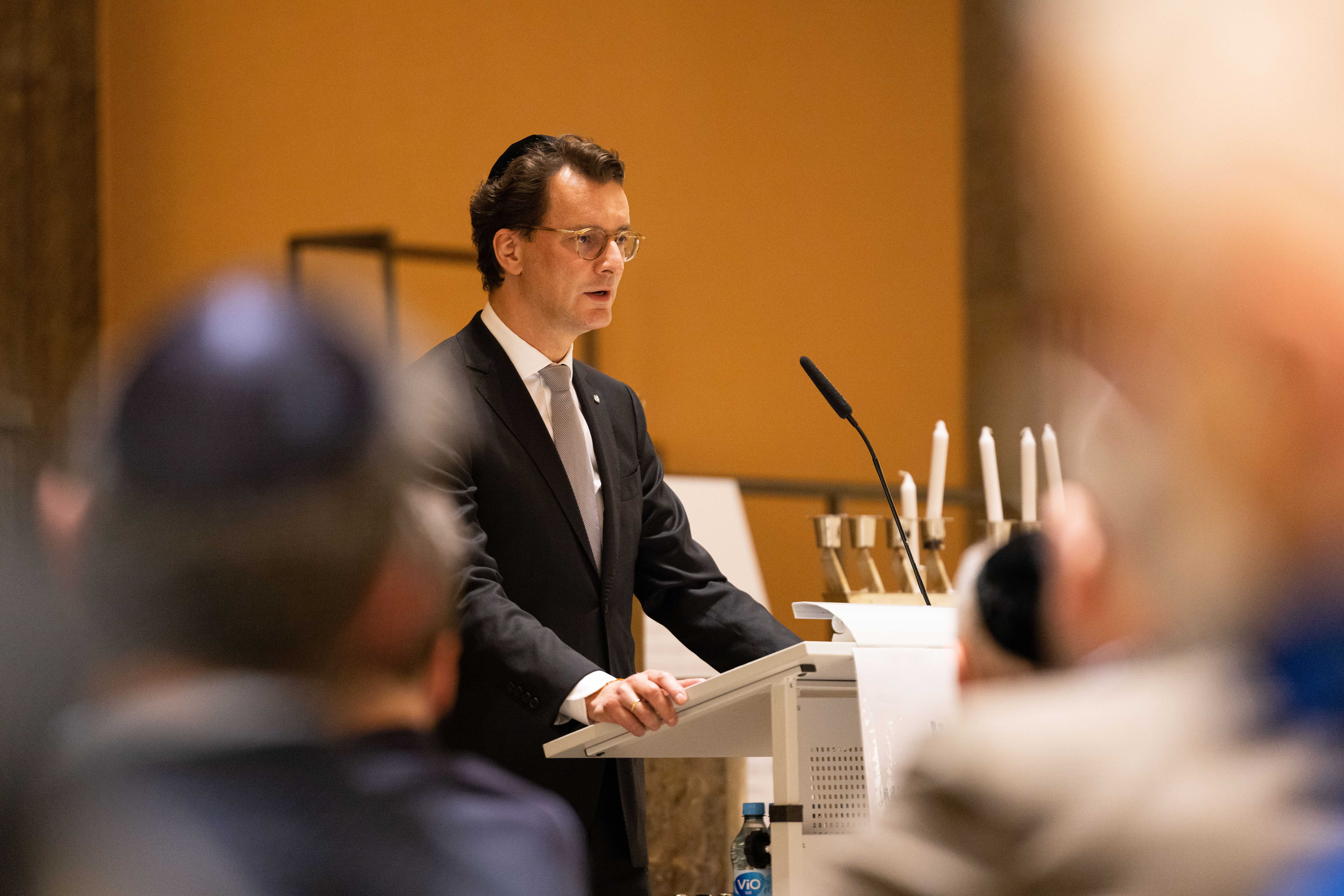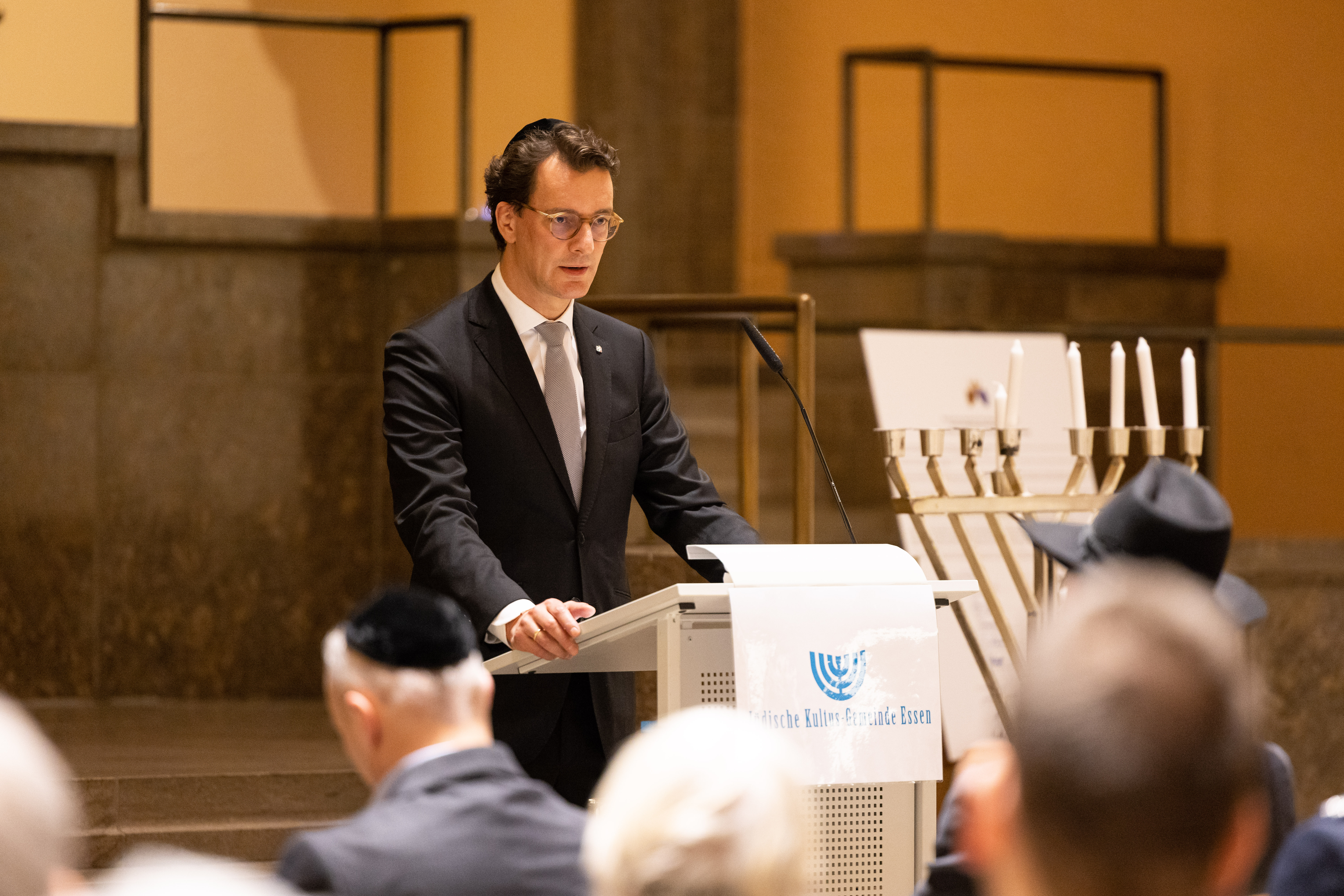 Ministerpräsident Hendrik Wüst nimmt am Festakt zum Entzünden der fünften Chanukka-Kerze in der Alten Synagoge Essen teil