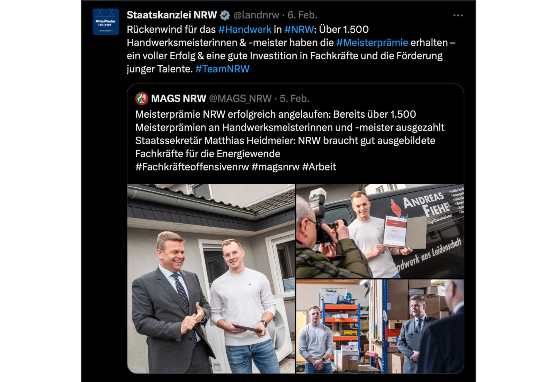 Sie sind hier:StartseiteNRW informierenMediathek 1 / 4 Social Media Posts aus der Woche vom 5. bis 11. Februar 2024 Mediendetails Datum 13.02.2024 Dateityp Galerie Anzahl Medien 4