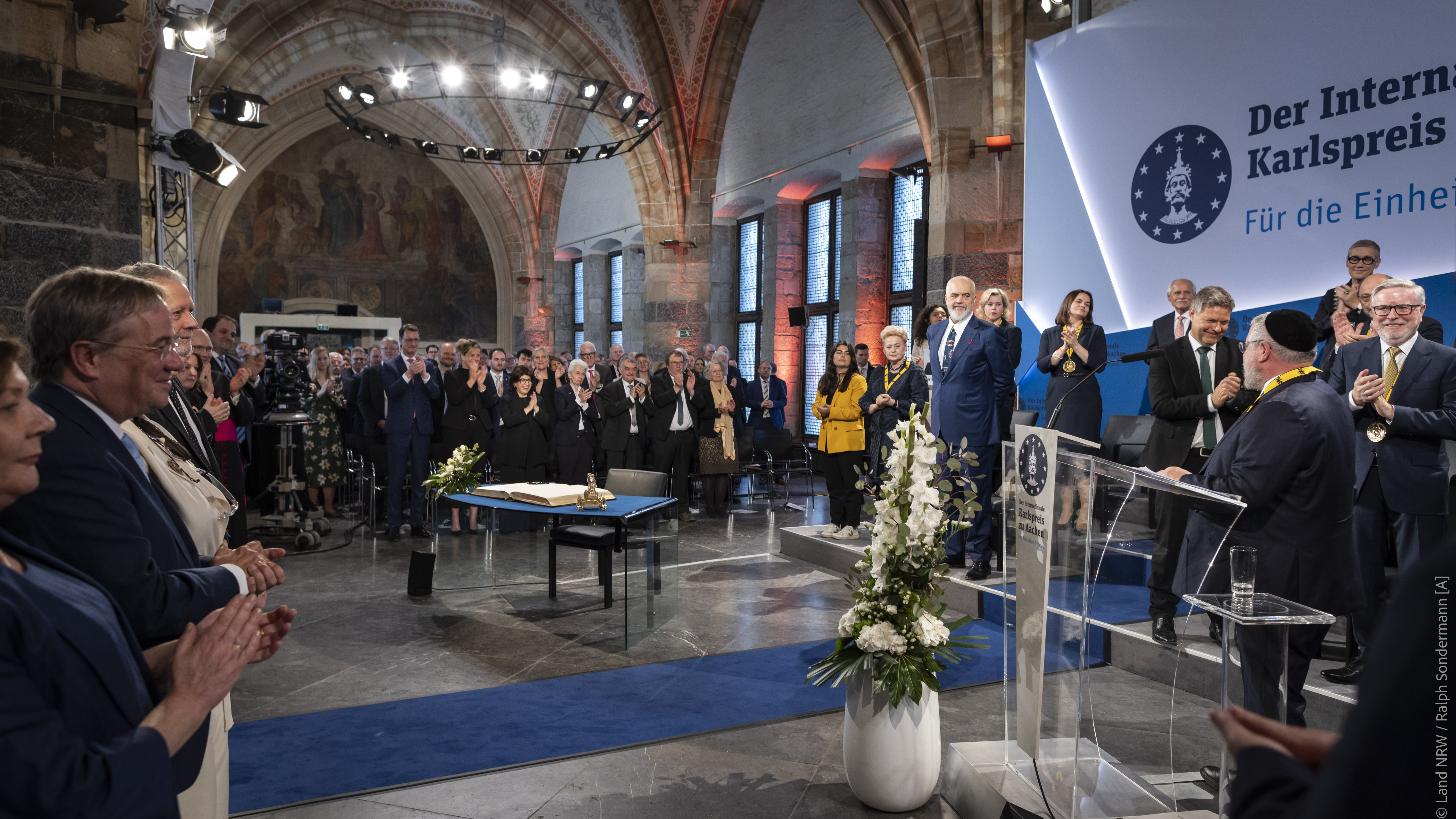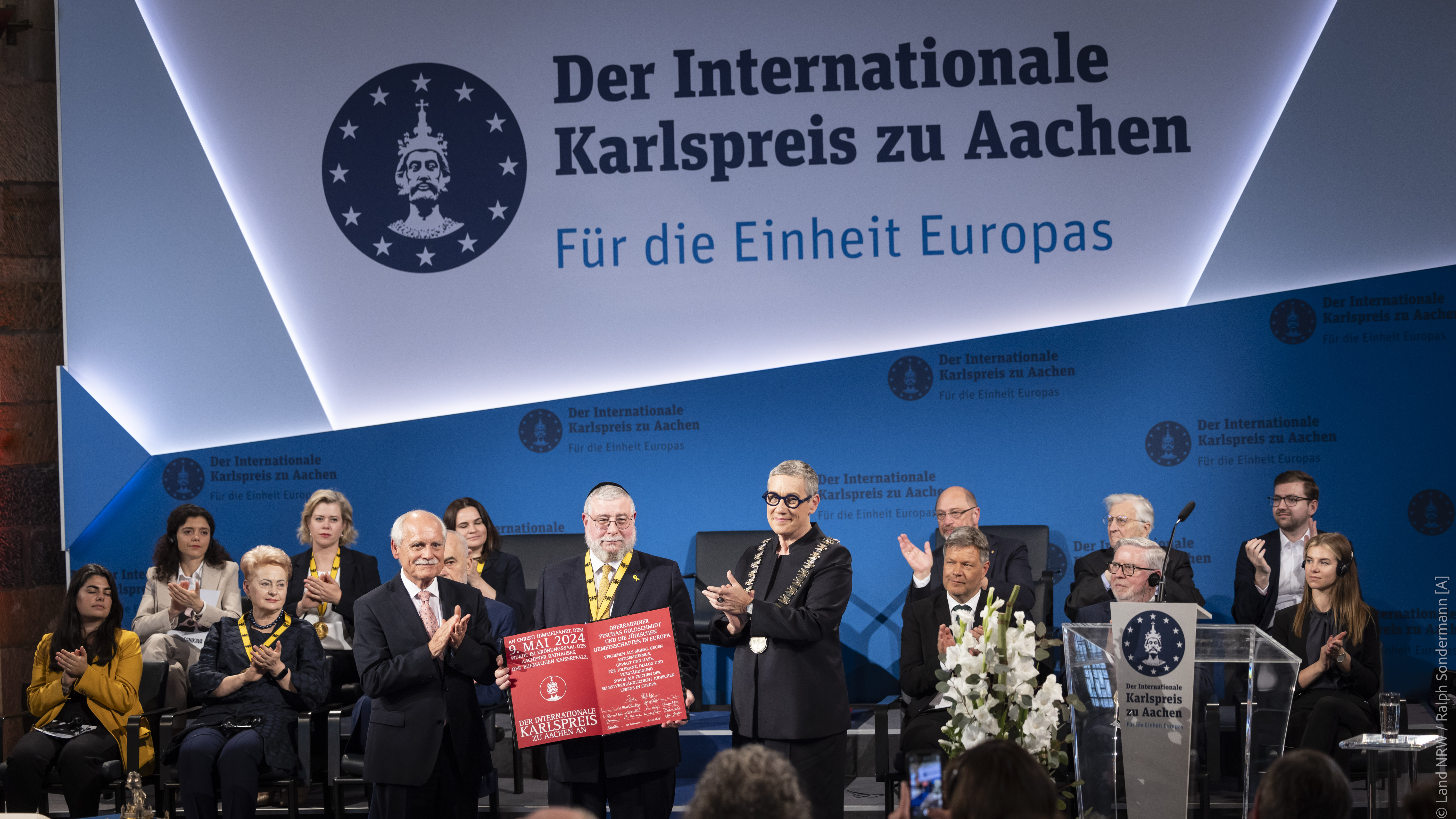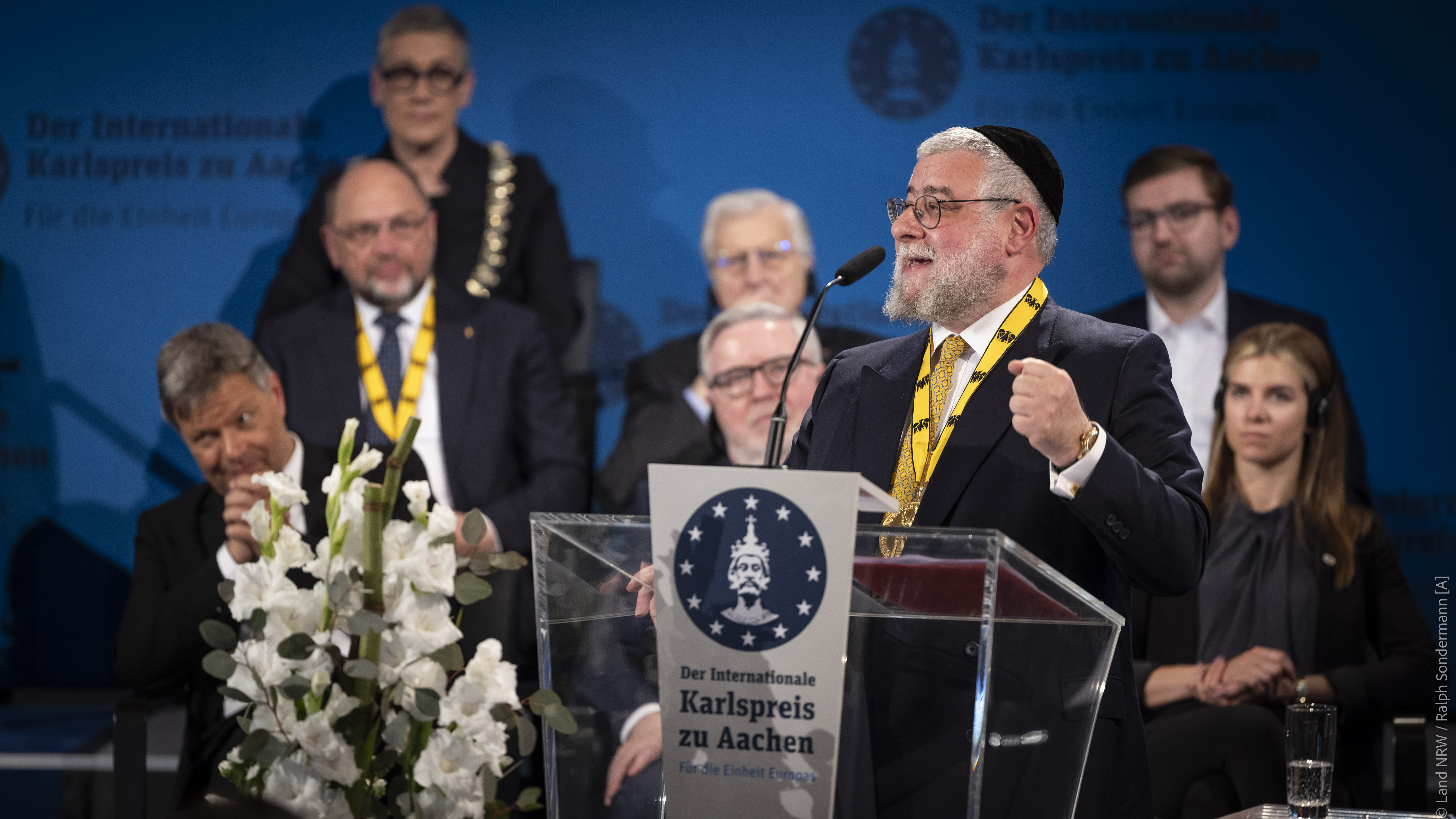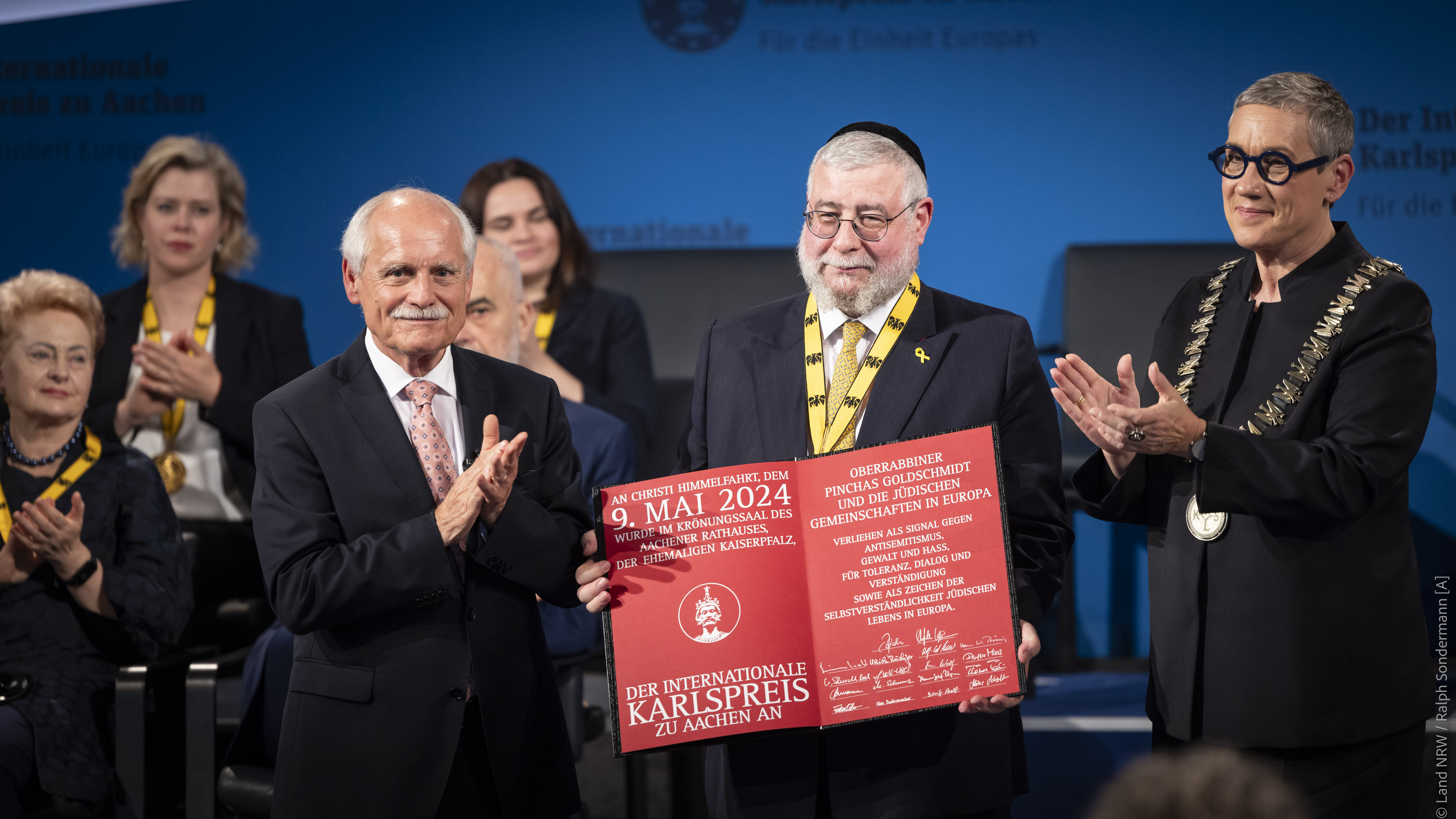 Ministerpräsident Hendrik Wüst gratuliert Pinchas Goldschmidt, Preisträger des Internationalen Karlspreis zu Aachen 2024