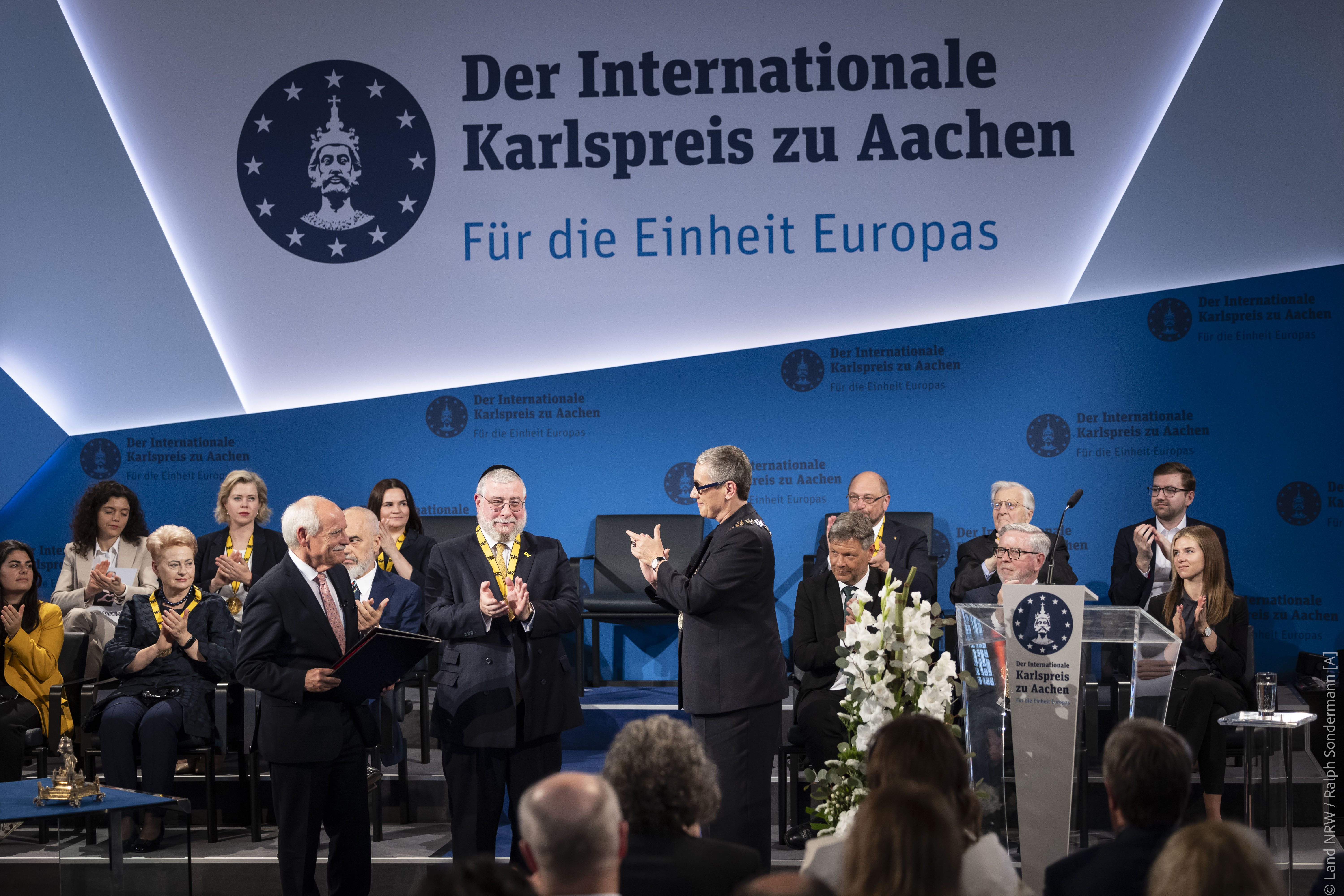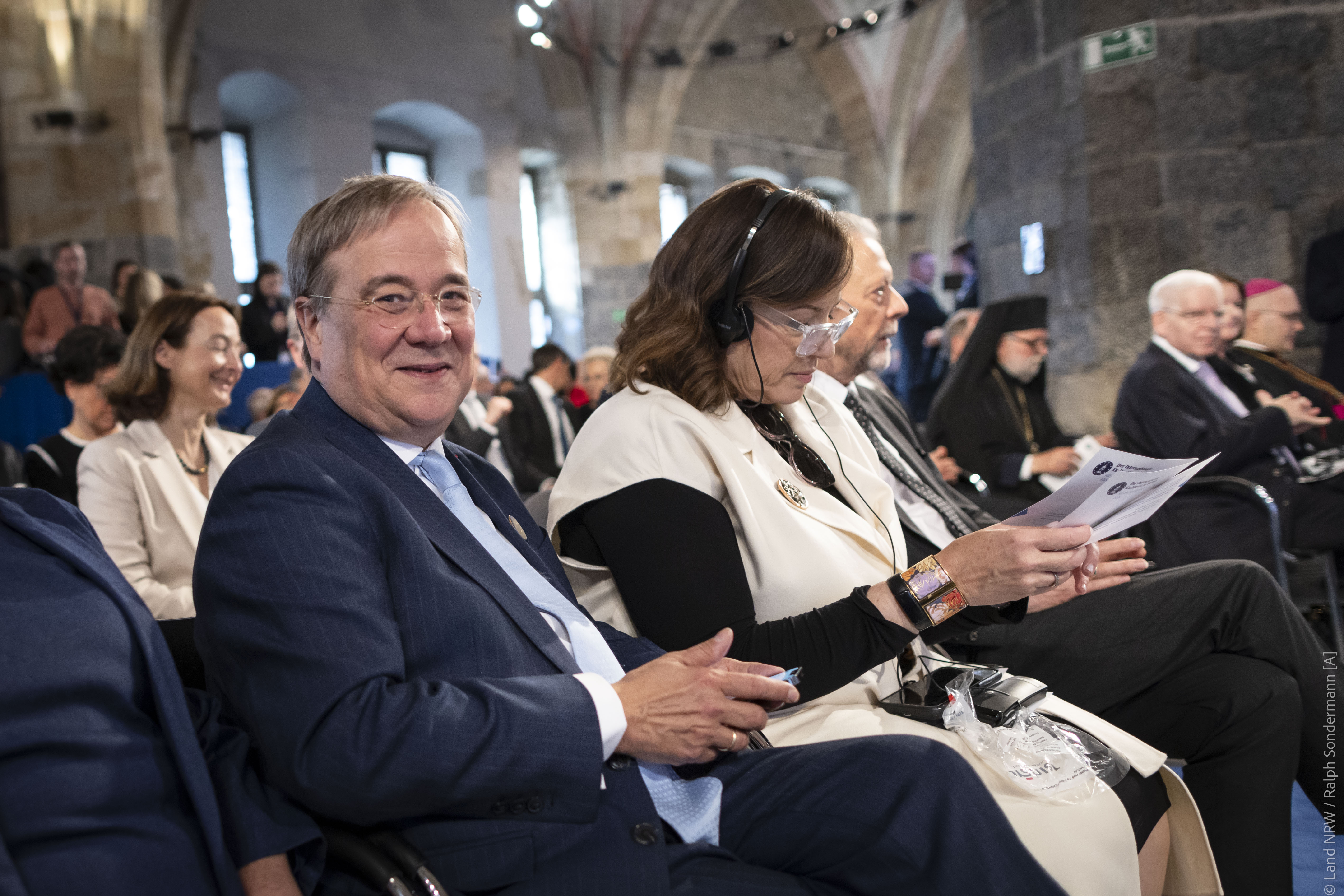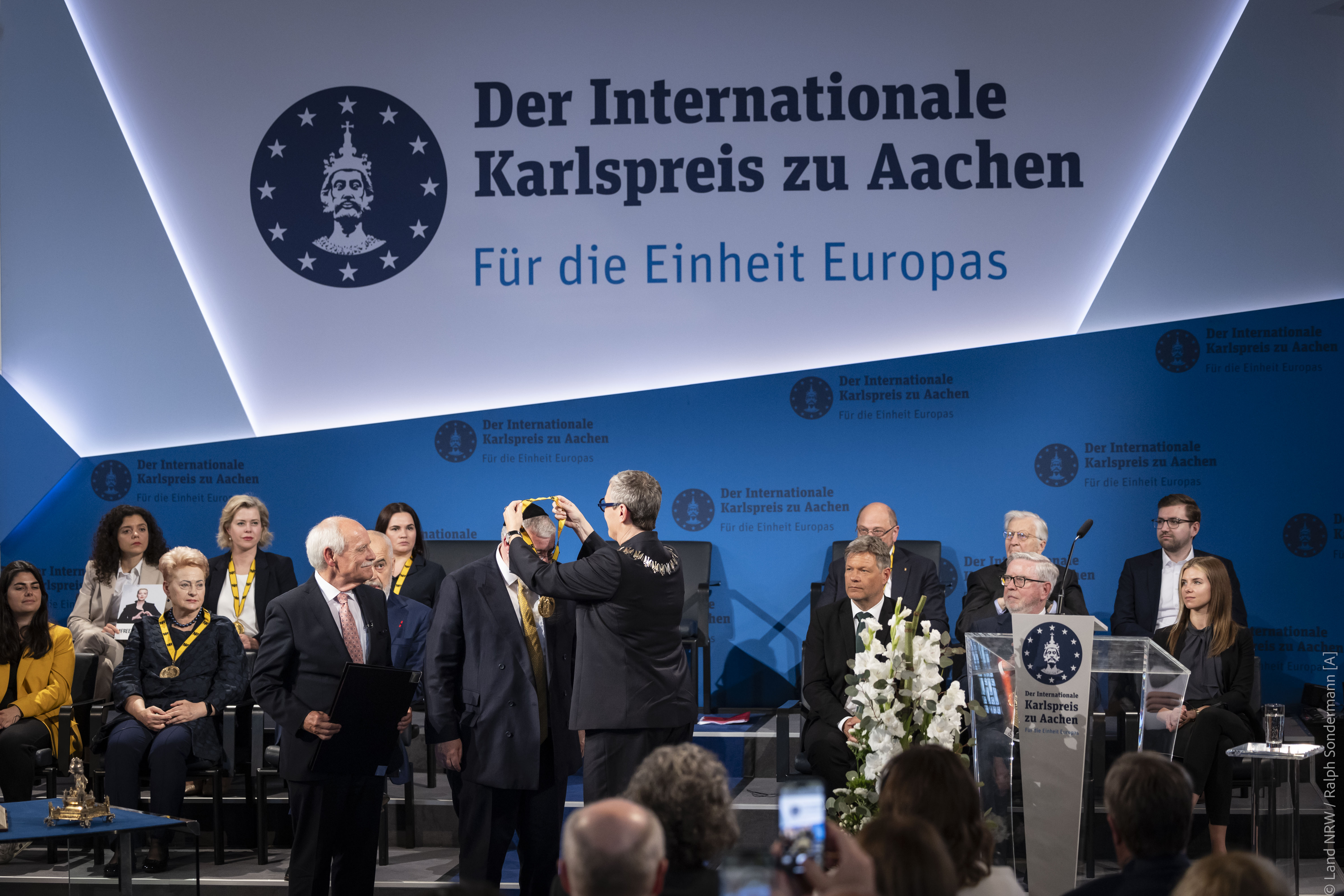 Ministerpräsident Hendrik Wüst gratuliert Pinchas Goldschmidt, Preisträger des Internationalen Karlspreis zu Aachen 2024