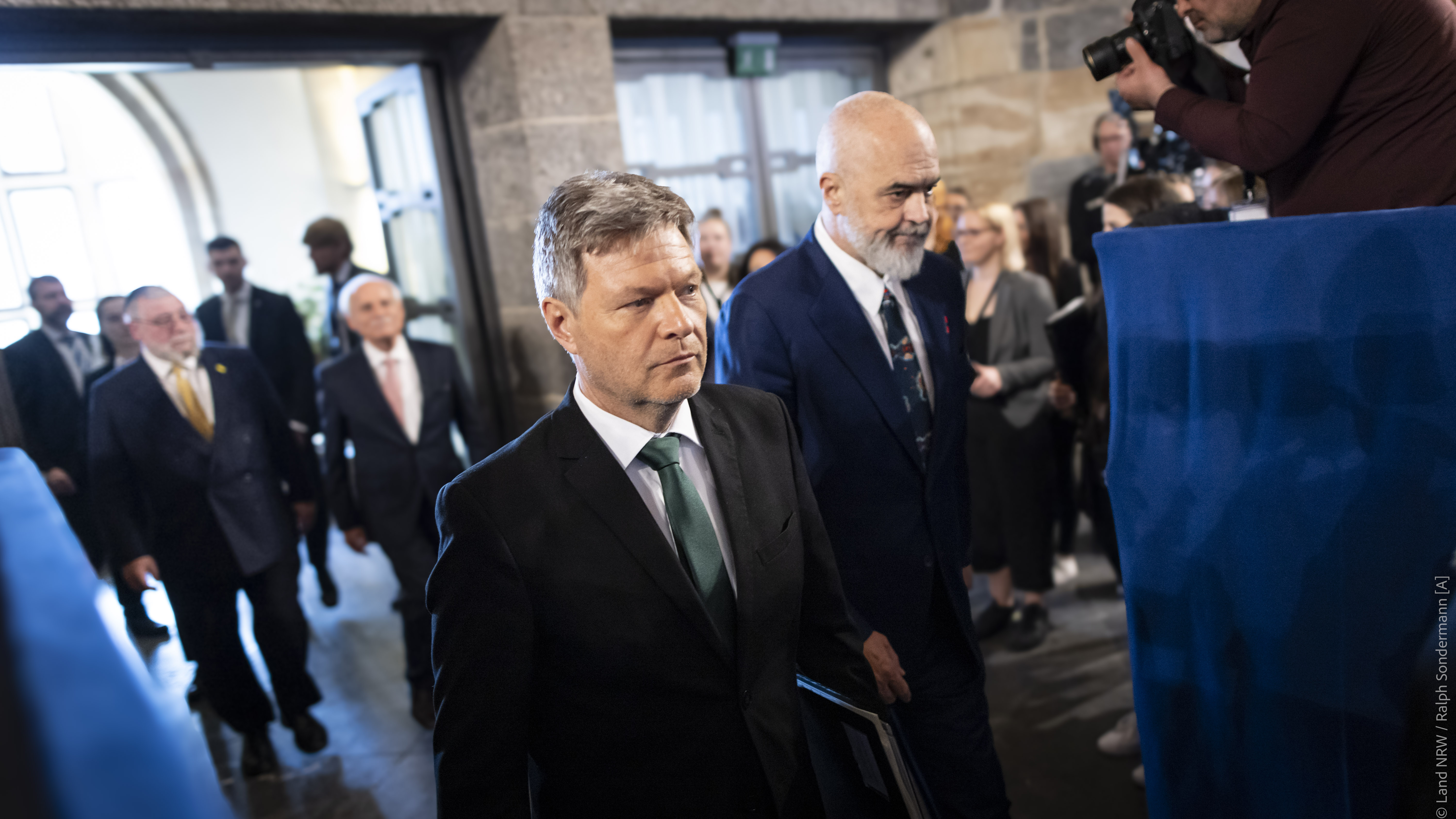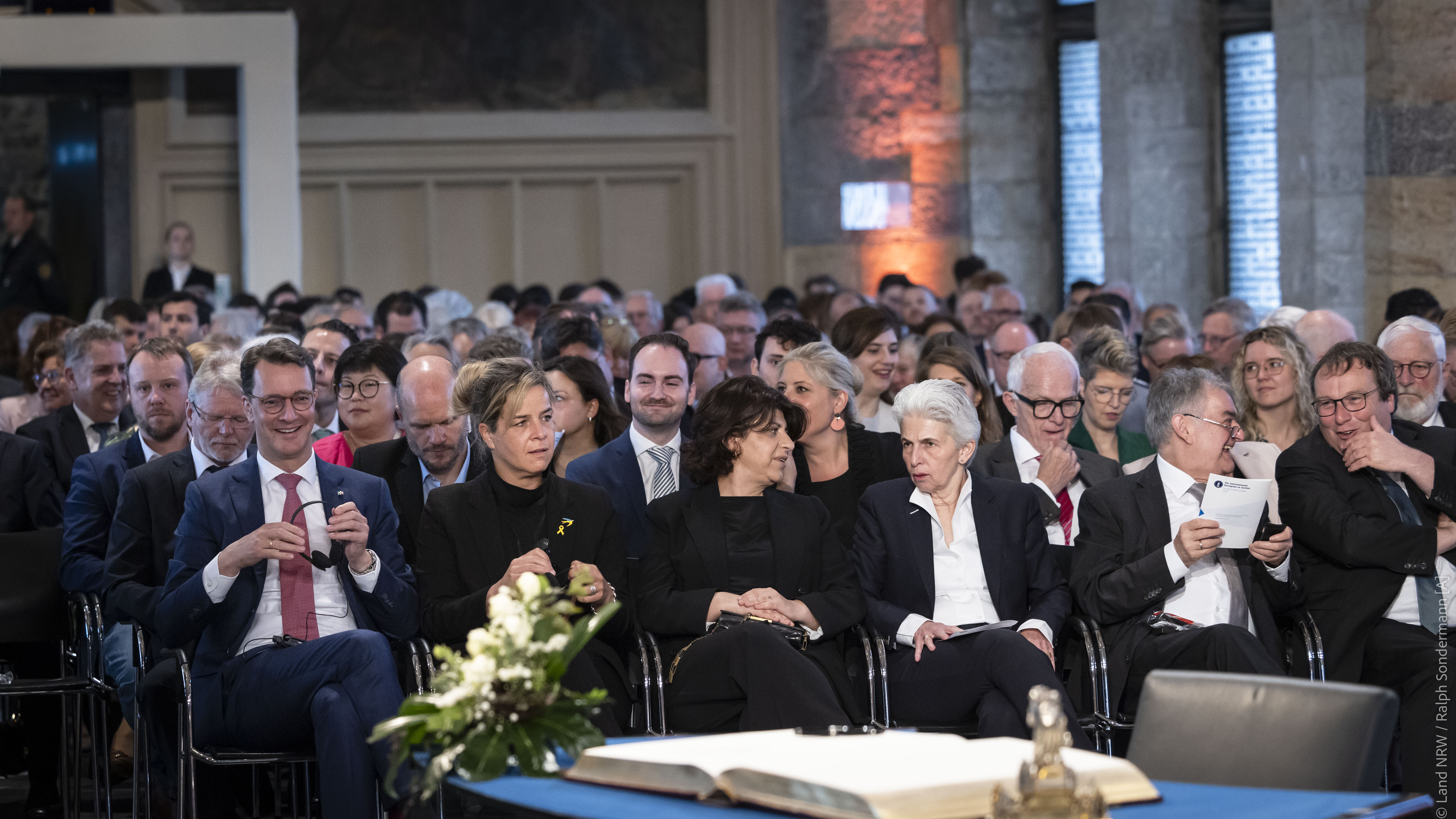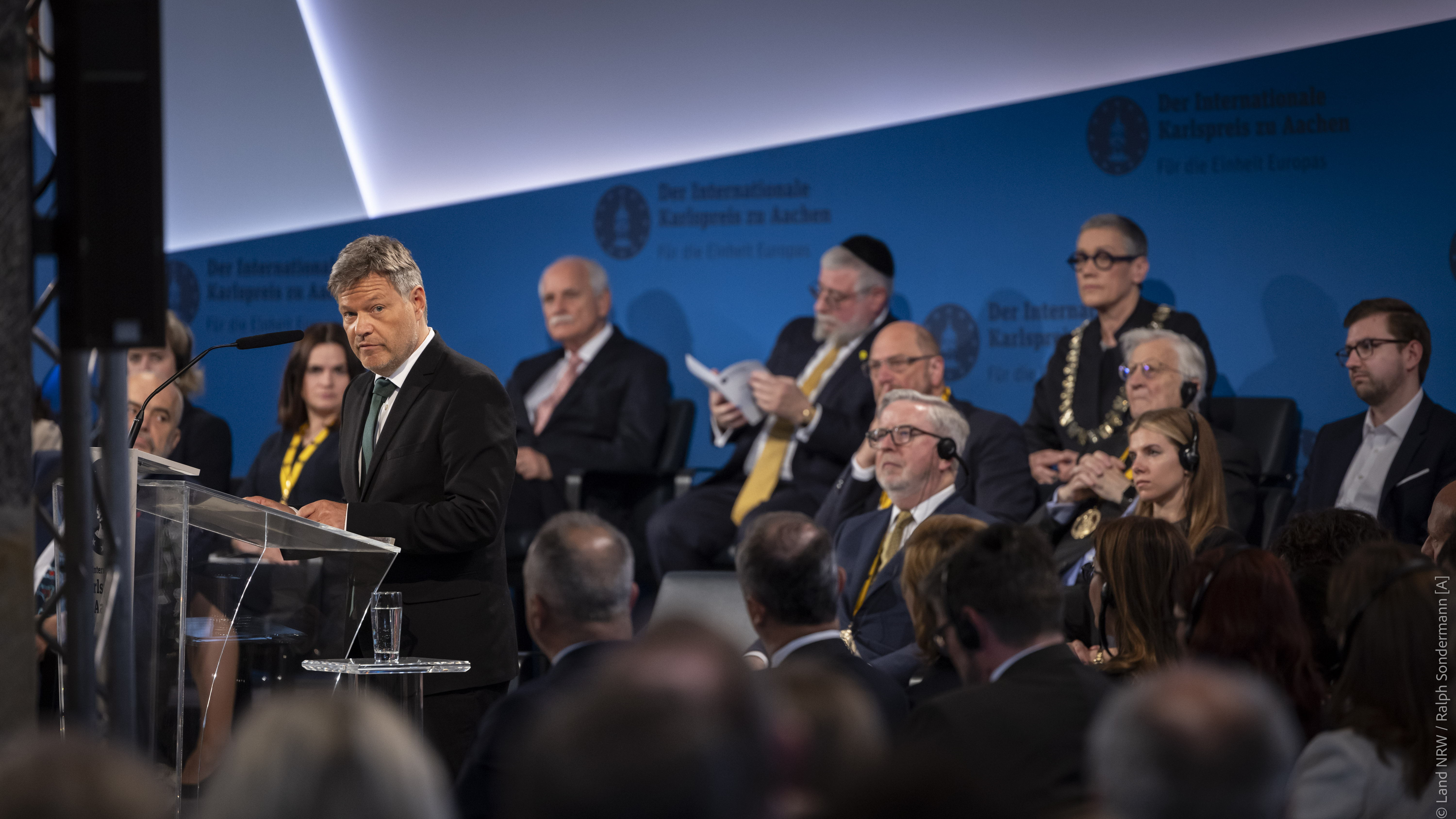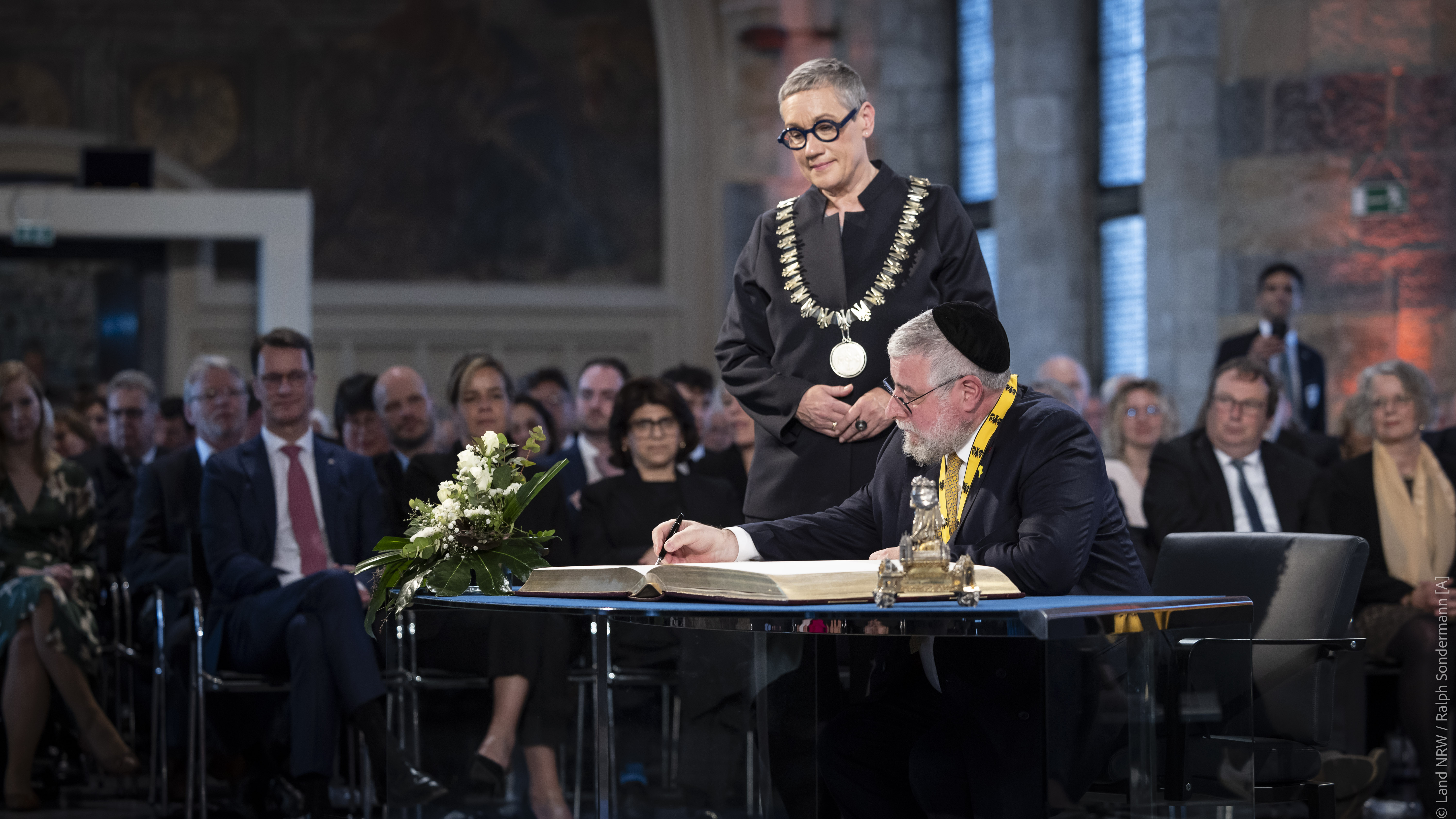 Ministerpräsident Hendrik Wüst gratuliert Pinchas Goldschmidt, Preisträger des Internationalen Karlspreis zu Aachen 2024