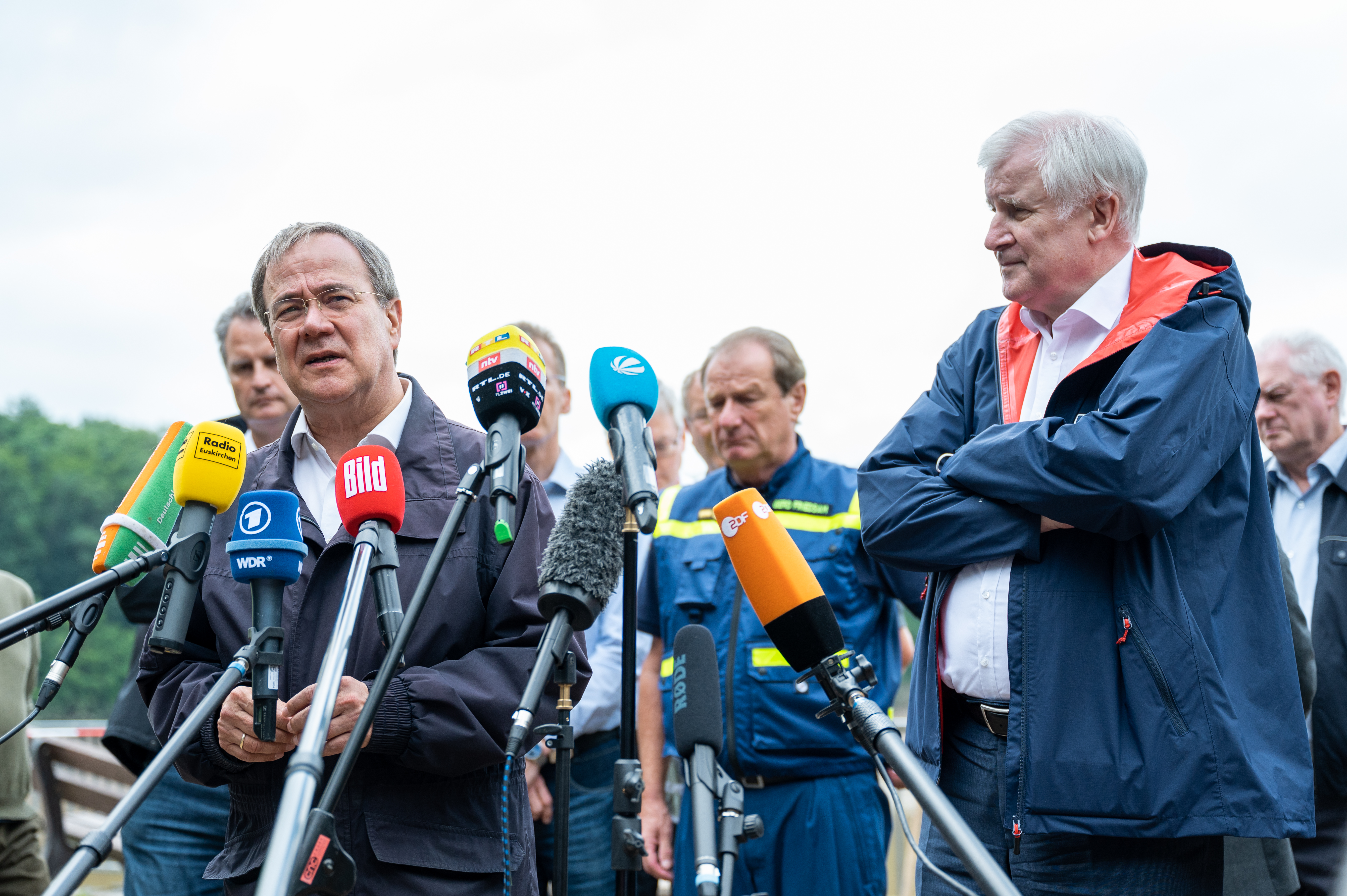 Bundesinnenminister Horst Seehofer ist am Montag, 19. Juli 2021, im Kreis Euskirchen, um sich mit Ministerpräsident Armin Laschet ein Bild von der Lage an der Steinbachtalsperre bei Euskirchen zu machen. Sie tauschen sich gemeinsam mit Markus Ramers, Landrat des Kreises Euskirchen, und Sebastian Schuster, Landrat des Rhein-Sieg-Kreises, mit Einsatzkräften von Technischem Hilfswerk und Bundespolizei aus, und danken den Helferinnen und Helfern für den seit Tagen andauernden Einsatz.