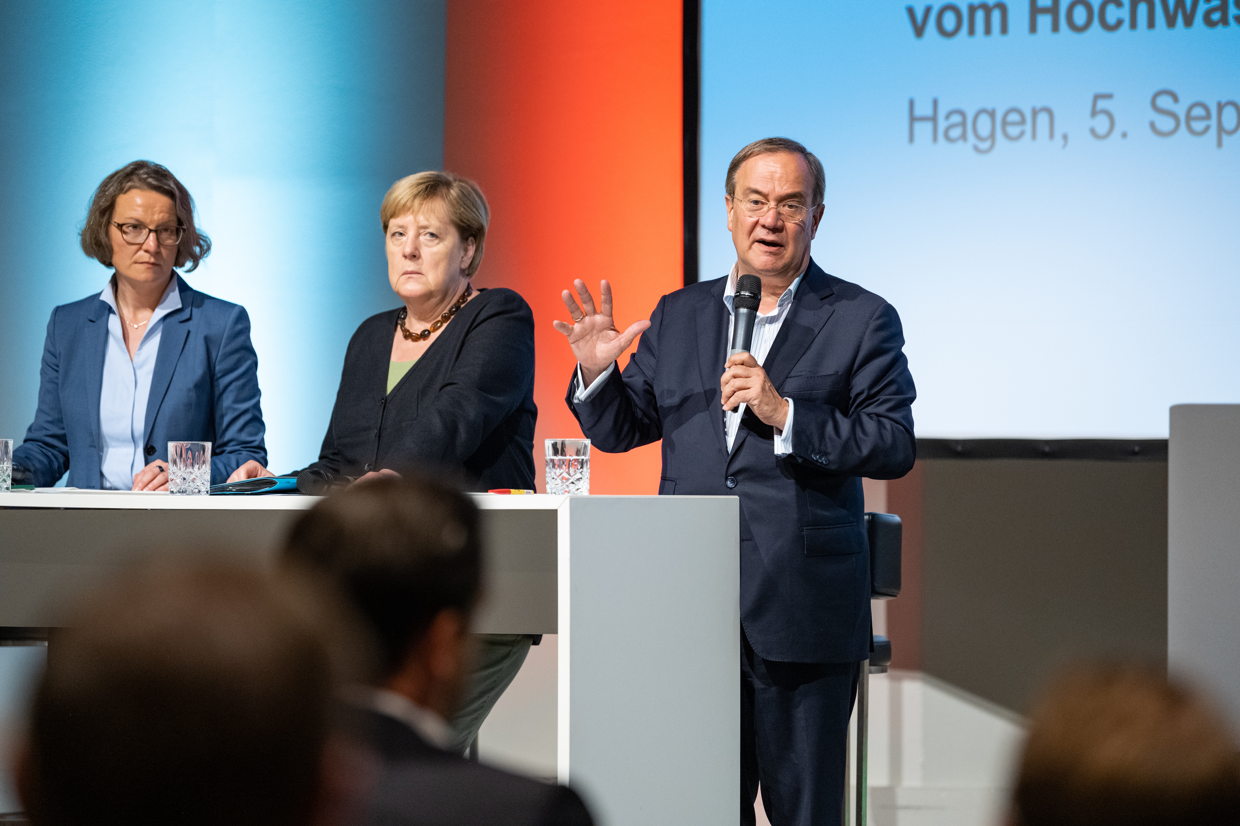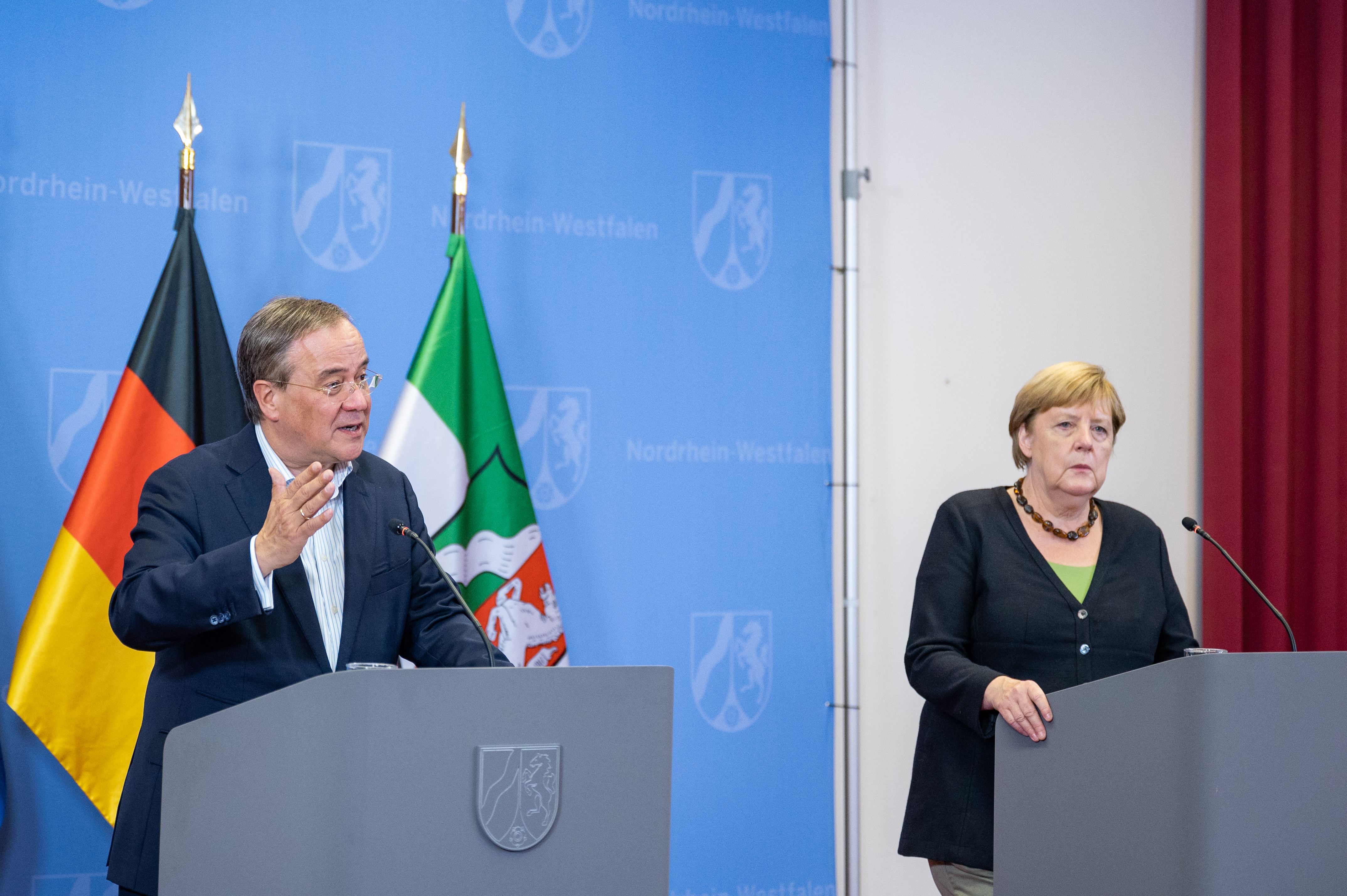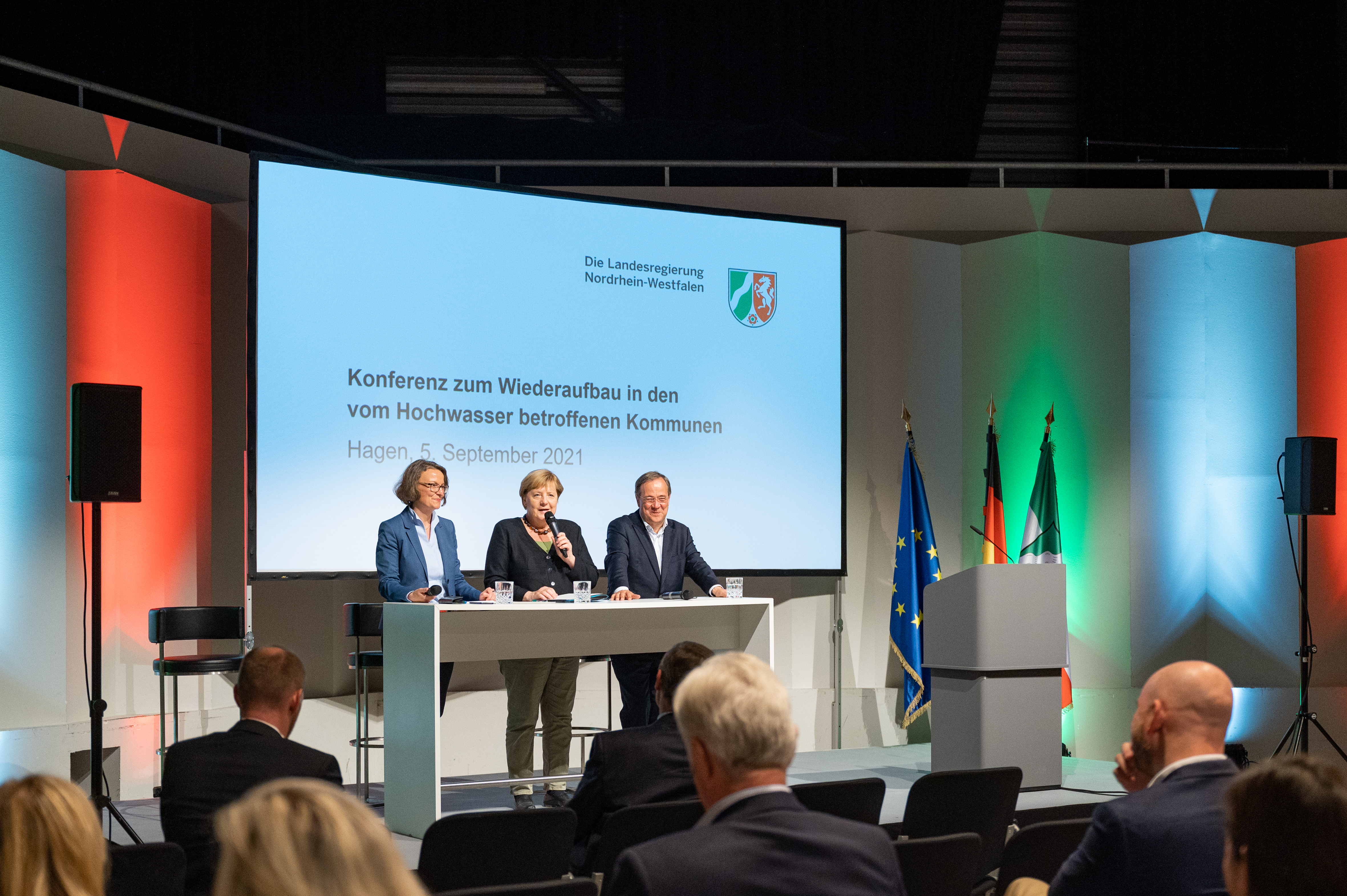 Bundeskanzlerin Angela Merkel und Ministerpräsident Armin Laschet besuchten erneut besonders von der Unwetterkatastrophe betroffene Gebiete in Nordrhein-Westfalen. Gemeinsam mit dem Wiederaufbau-Beauftragten des Landes Dr. Fritz Jaeckel reisten beide am Sonntag, 5. September 2021, ab 13.00 Uhr in den Märkischen Kreis und nach Hagen. Dort informierten sie sich über den Stand der Aufräum- und Wiederaufbauarbeiten und sprachen unter anderem mit Einsatzkräften. Anschließend nahmen die Bundeskanzlerin und der Ministerpräsident an einer Kommunalkonferenz zum Wiederaufbau in Hagen teil, zu der Vertreterinnen und Vertreter der Kommunen in den betroffenen Regionen eingeladen waren. Im Anschluss fand eine Pressekonferenz von Bundeskanzlerin und Ministerpräsident statt.