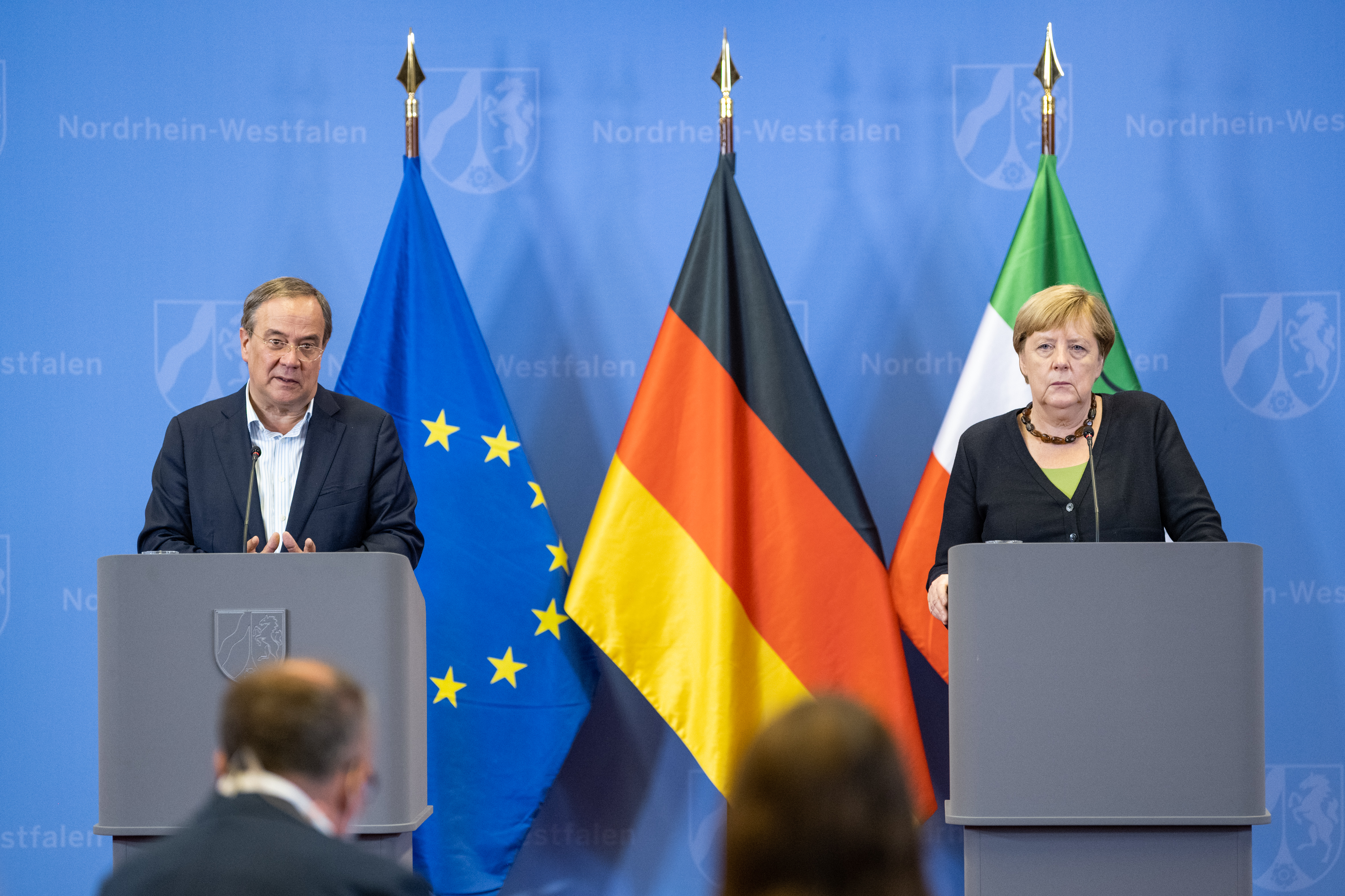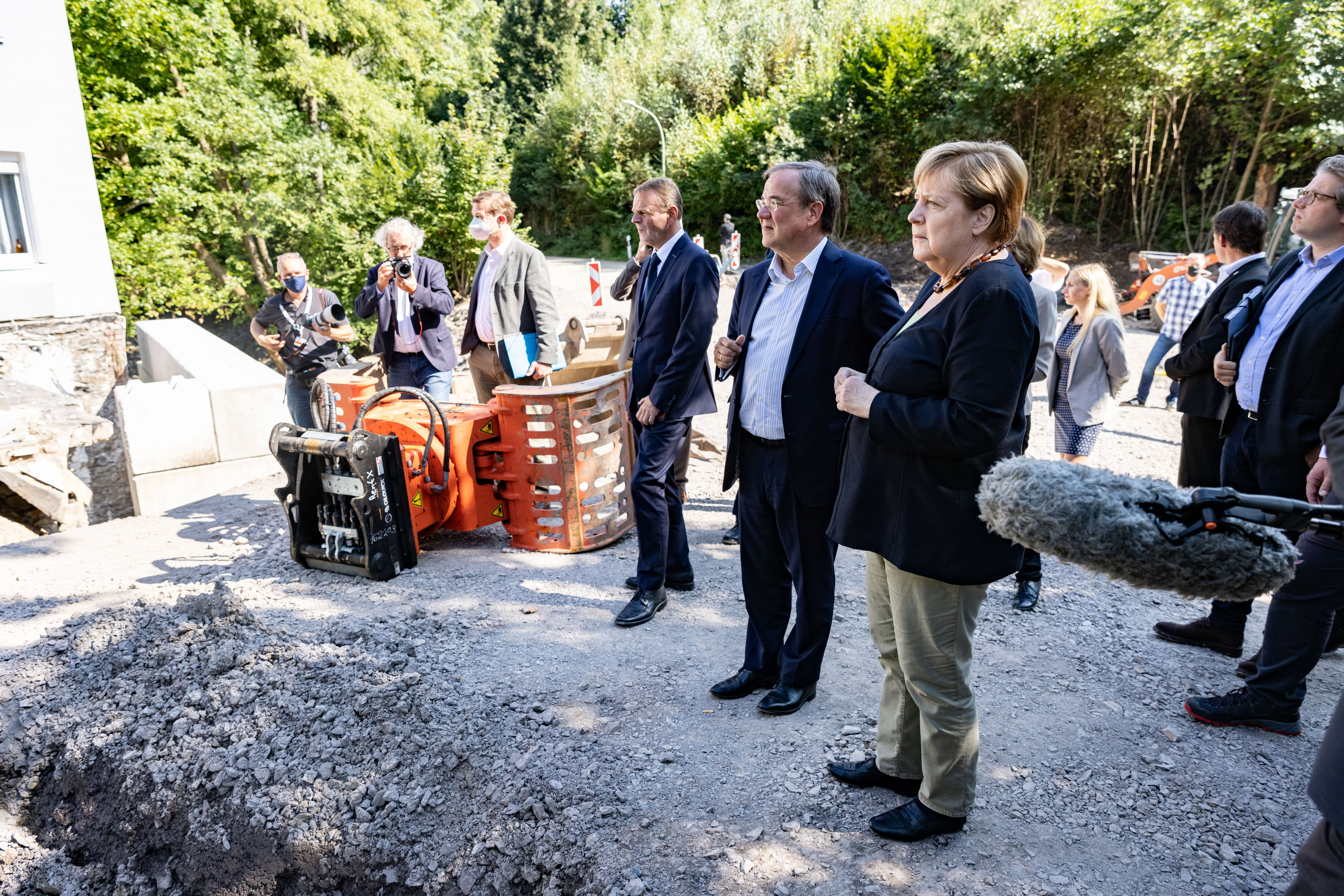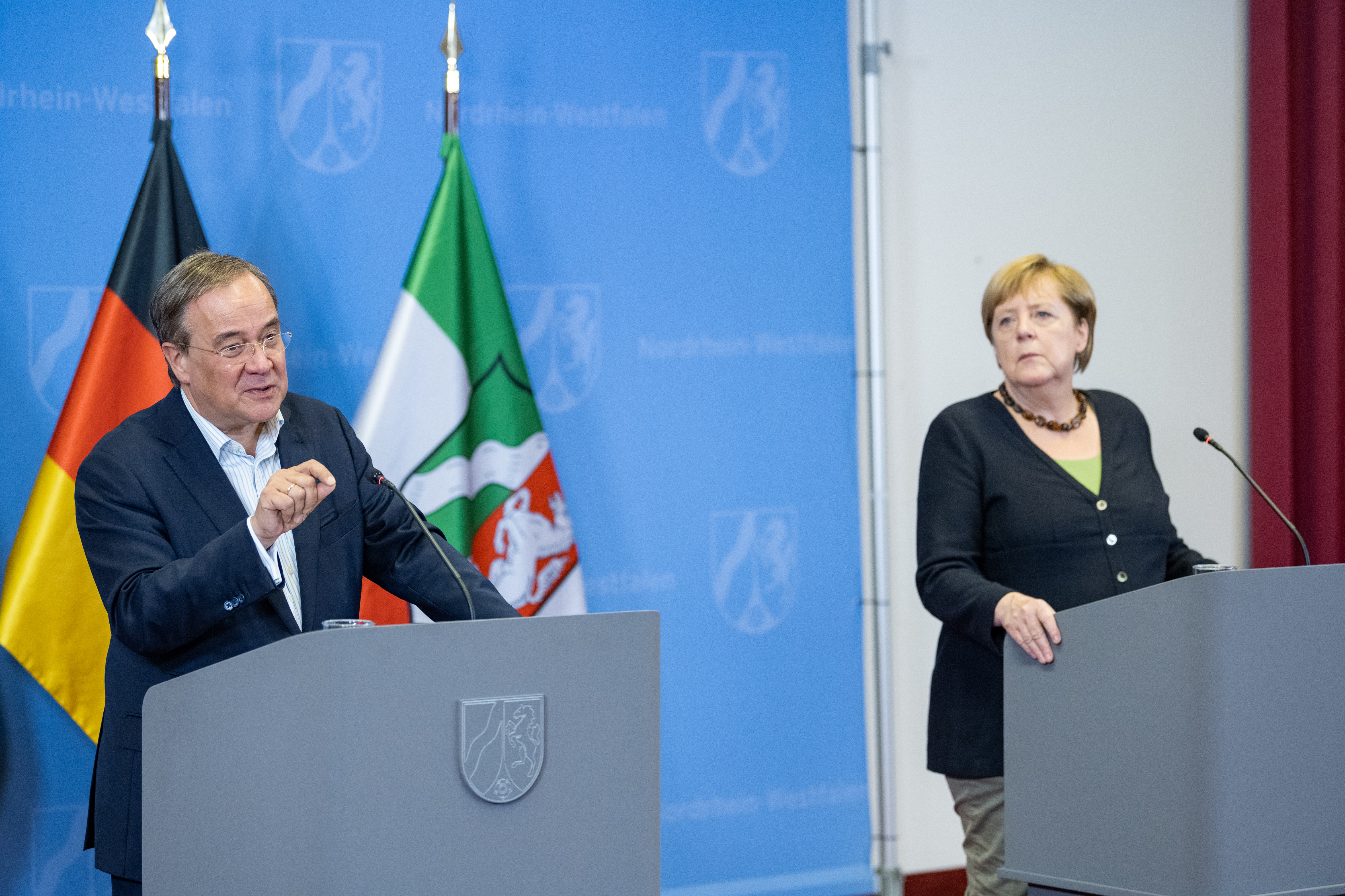 Bundeskanzlerin Angela Merkel und Ministerpräsident Armin Laschet besuchten erneut besonders von der Unwetterkatastrophe betroffene Gebiete in Nordrhein-Westfalen. Gemeinsam mit dem Wiederaufbau-Beauftragten des Landes Dr. Fritz Jaeckel reisten beide am Sonntag, 5. September 2021, ab 13.00 Uhr in den Märkischen Kreis und nach Hagen. Dort informierten sie sich über den Stand der Aufräum- und Wiederaufbauarbeiten und sprachen unter anderem mit Einsatzkräften. Anschließend nahmen die Bundeskanzlerin und der Ministerpräsident an einer Kommunalkonferenz zum Wiederaufbau in Hagen teil, zu der Vertreterinnen und Vertreter der Kommunen in den betroffenen Regionen eingeladen waren. Im Anschluss fand eine Pressekonferenz von Bundeskanzlerin und Ministerpräsident statt.