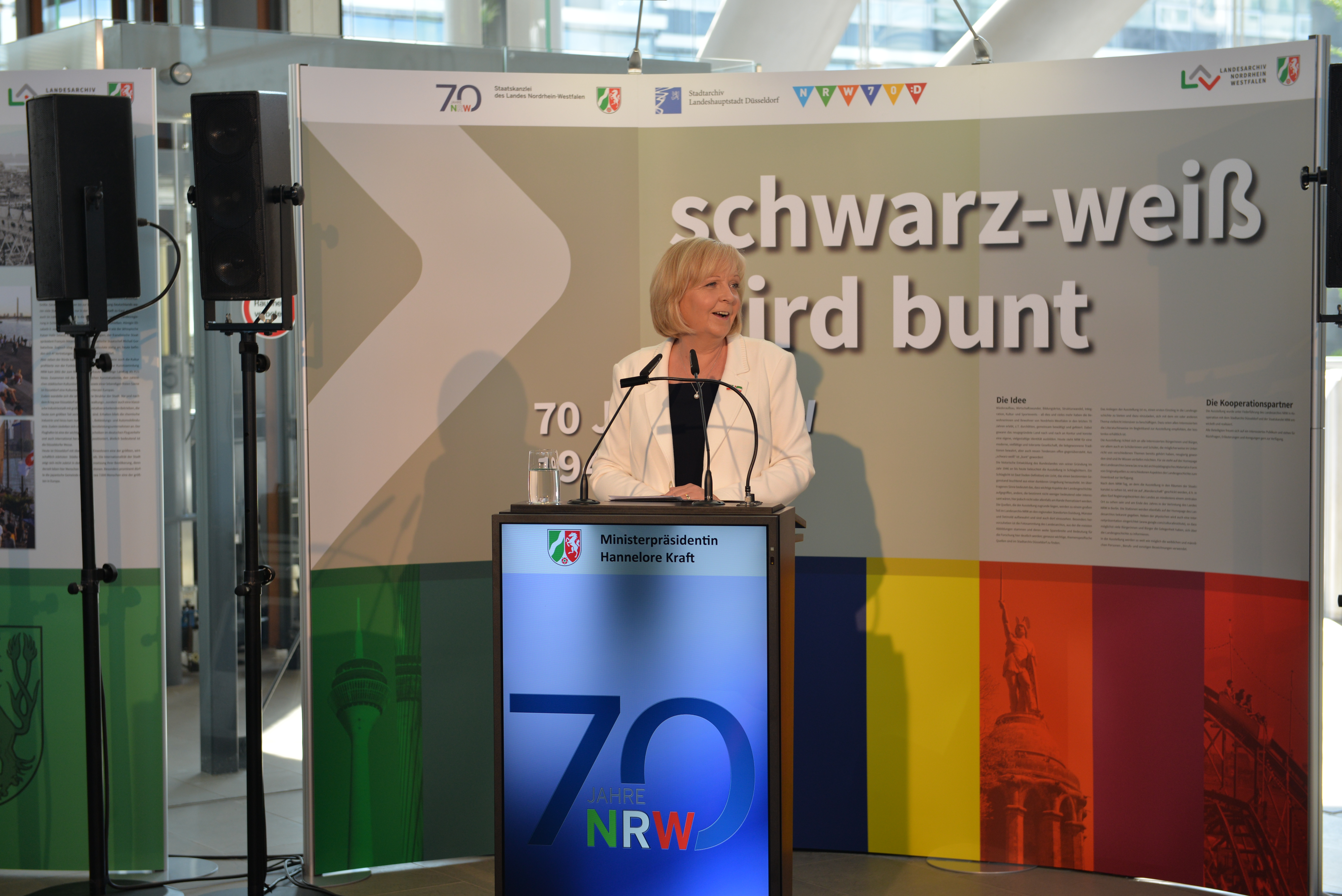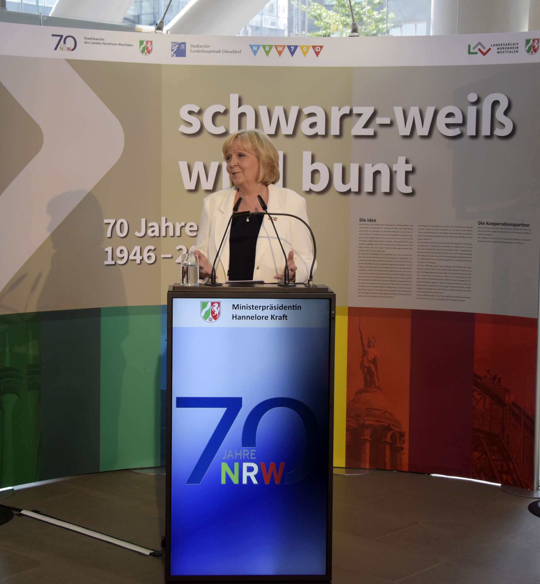 Ministerpräsidentin Hannelore Kraft hat die Ausstellung „schwarz-weiß wird bunt - 70 Jahre NRW" in der Staatskanzlei im Düsseldorfer Stadttor eröffnet. Im Fokus der Wanderausstellung steht die 70-jährige Geschichte des Landes Nordrhein-Westfalen.