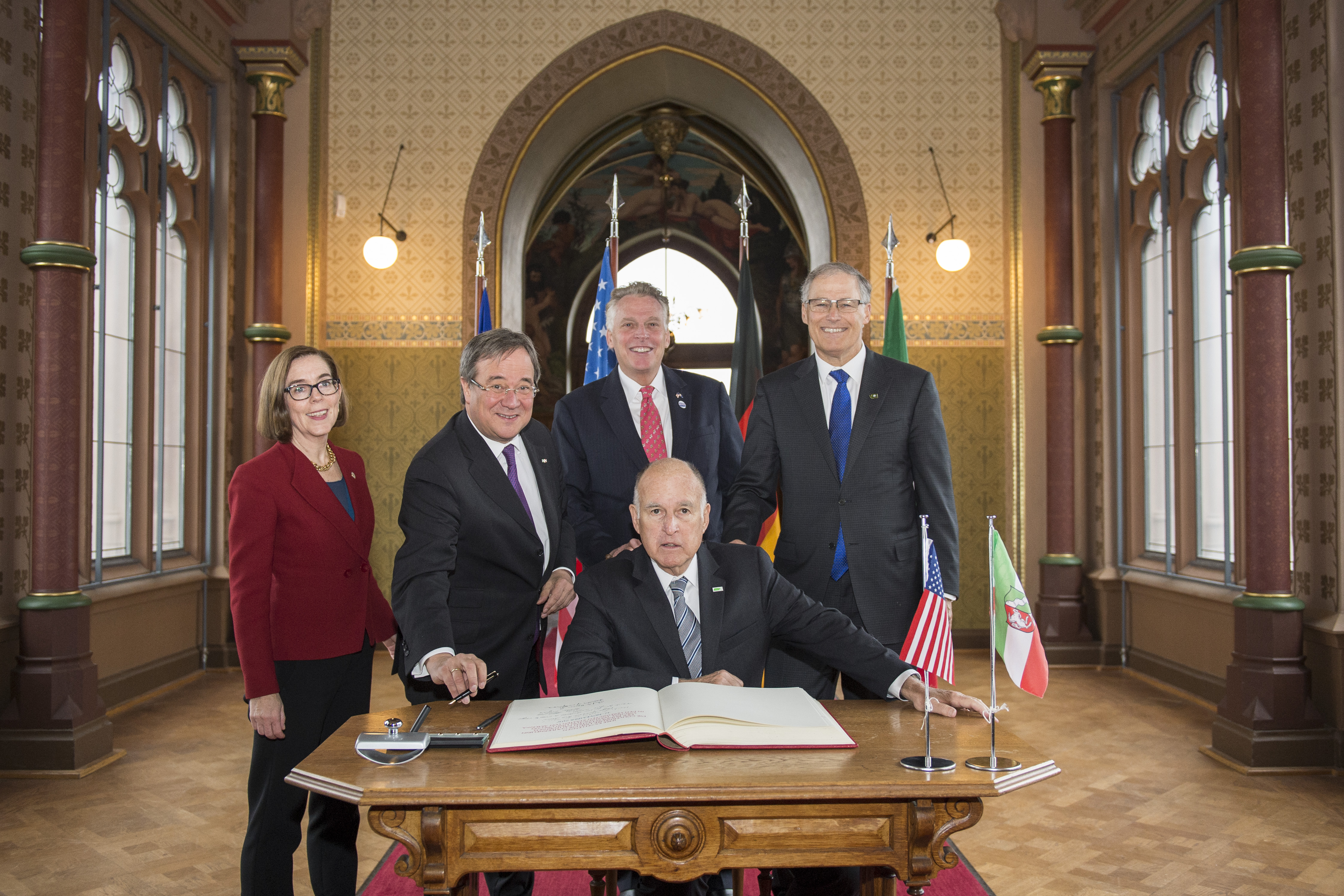 Am 12. November 2017 traf Ministerpräsident Armin Laschet auf Schloss Drachenburg die vier US-amerikanischen Gouverneure Jerry Brown (Kalifornien), Kate Brown (Oregon), Terry McAuliffe (Virginia) und Jay Inslee (Washington) zu einem Gespräch. Alle vier Staaten sind Mitglieder der vor wenigen Monaten von Michael Bloomberg (ehemaliger Bürgermeister von New York City) gegründeten Klima-Allianz der US-amerikanischen Bundesstaaten. „Sie sind in vielerlei Hinsicht beispielgebend darin, wie entschlossen sie die Herausforderungen des Klimawandels angehen. Ich freue mich sehr, dass ich diesen wichtigen Dialog heute mit den Gouverneuren vertiefen kann“, so Armin Laschet.