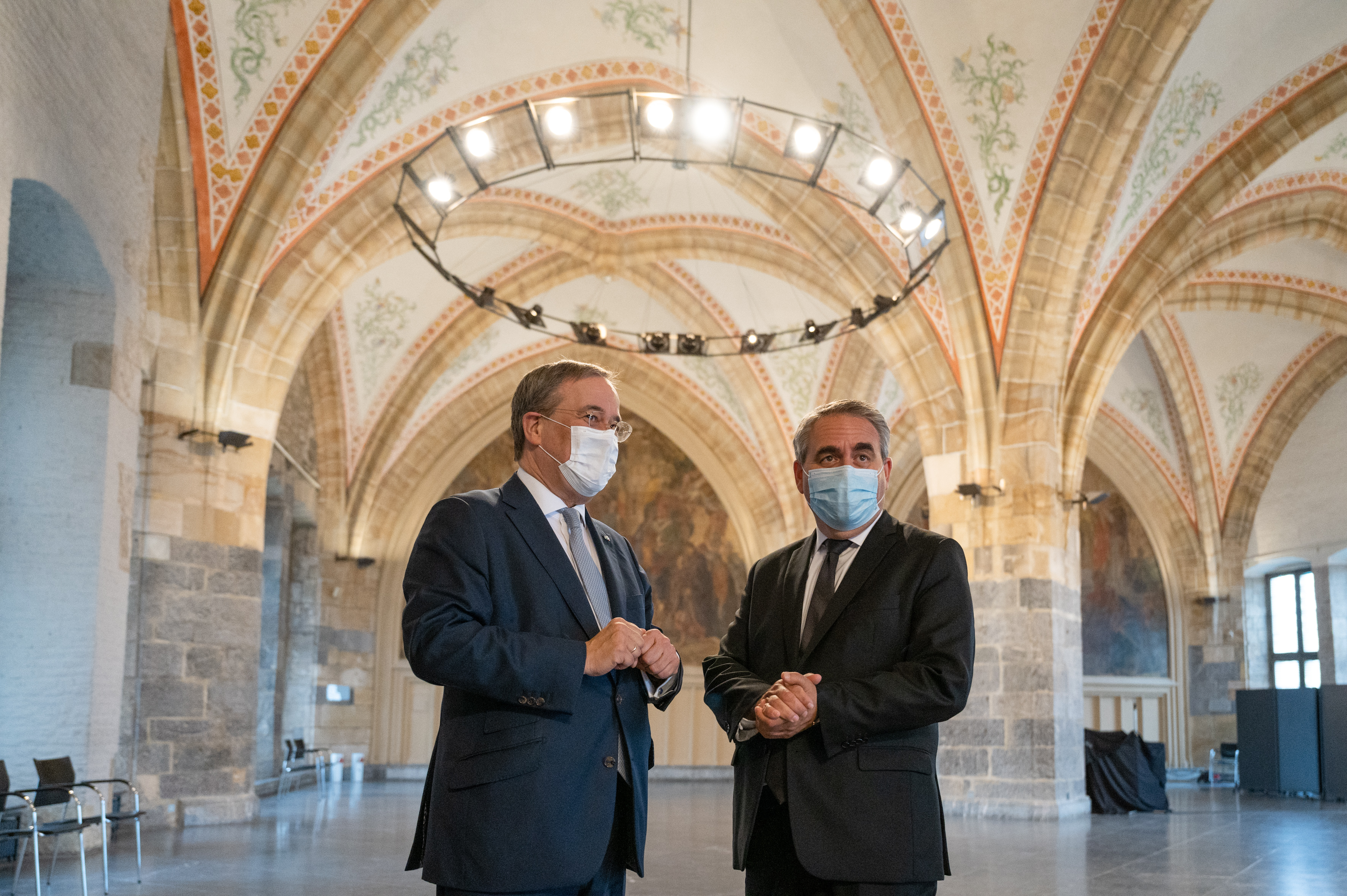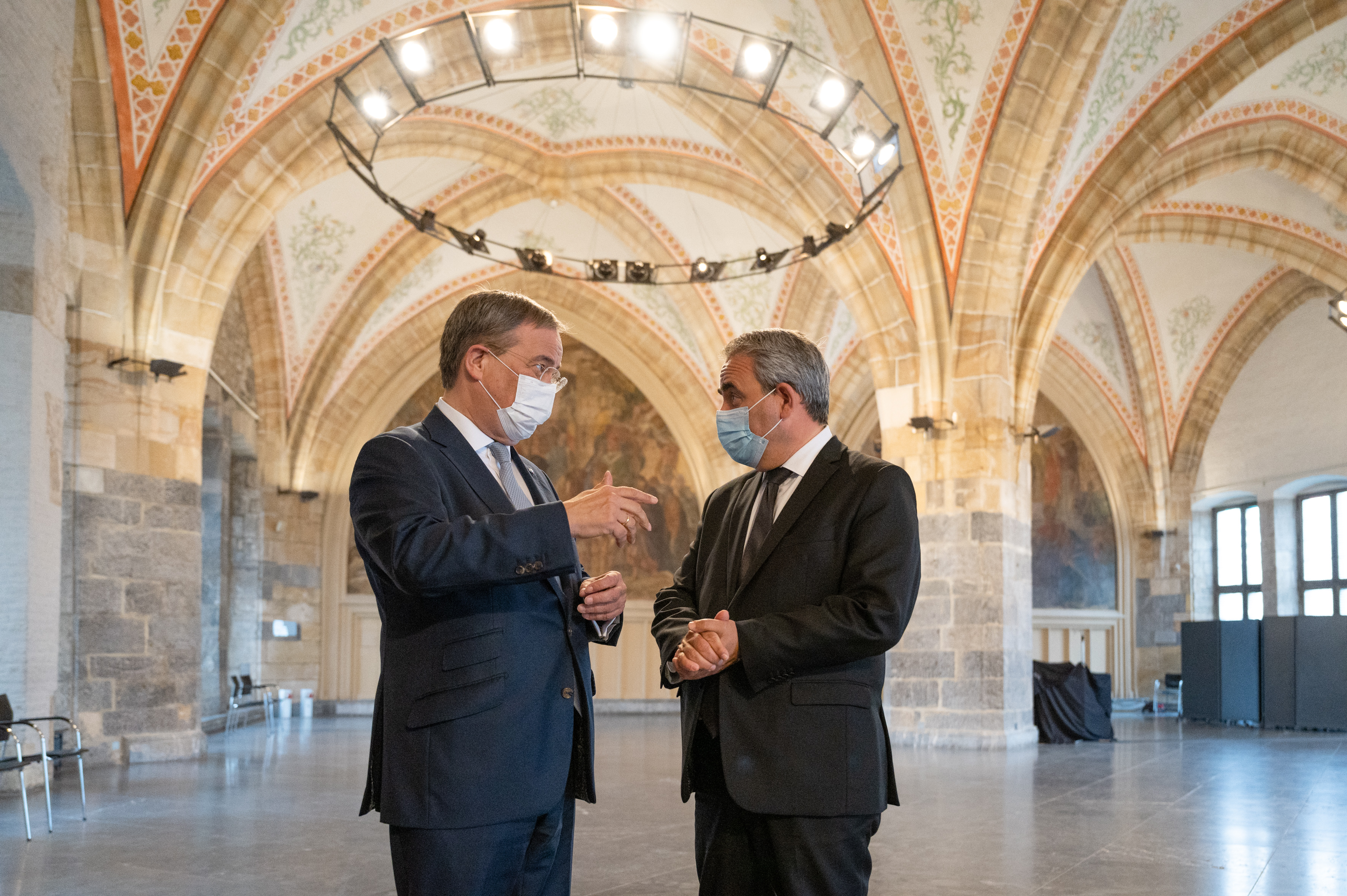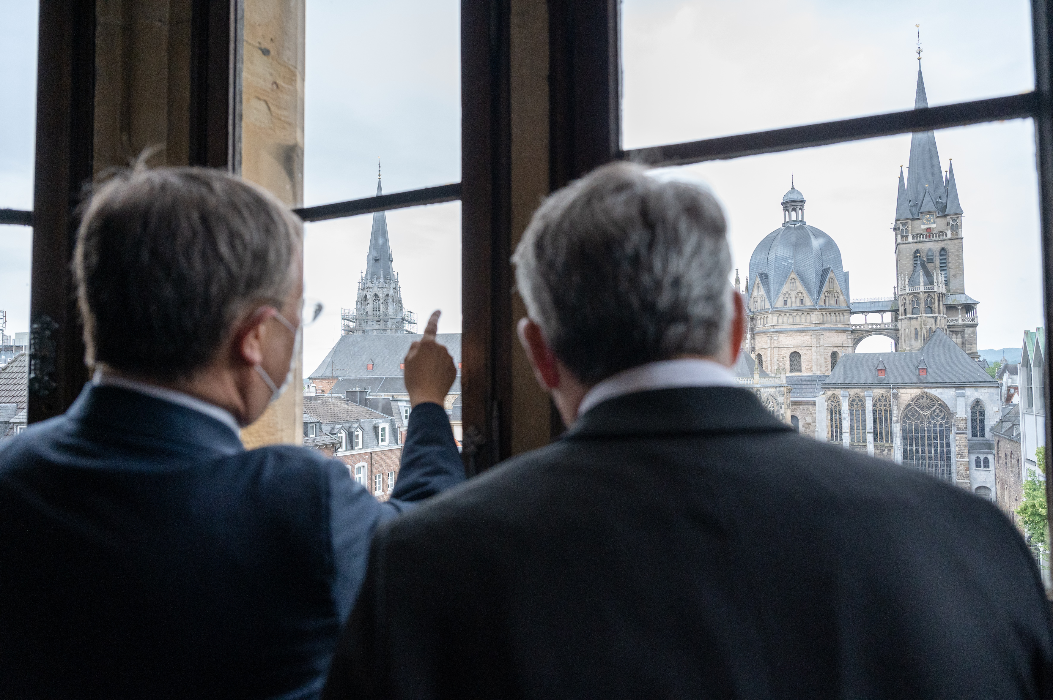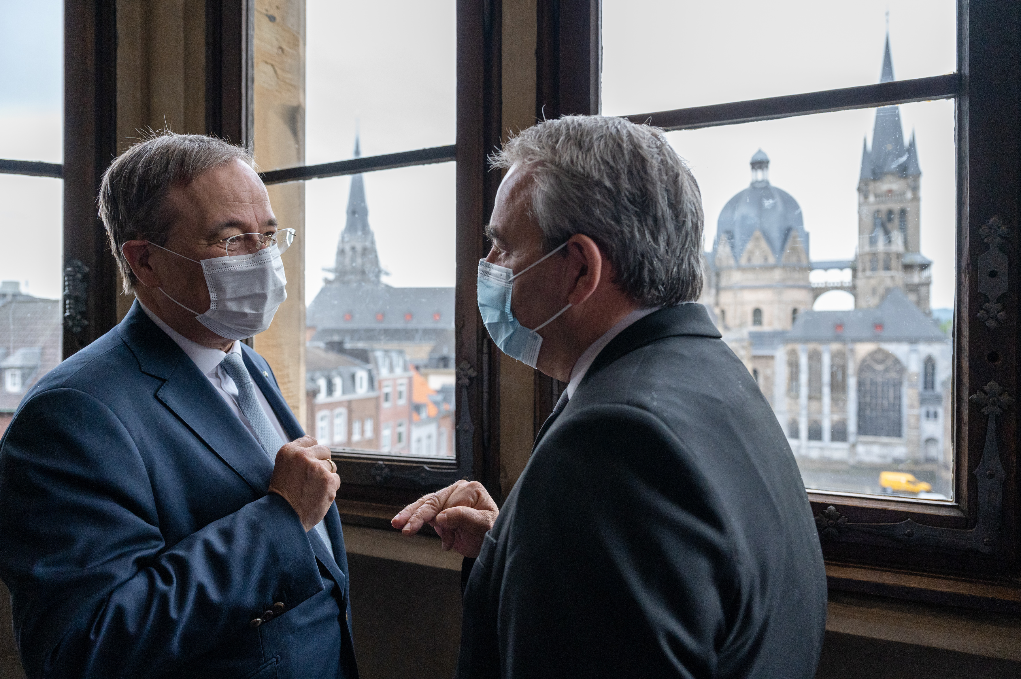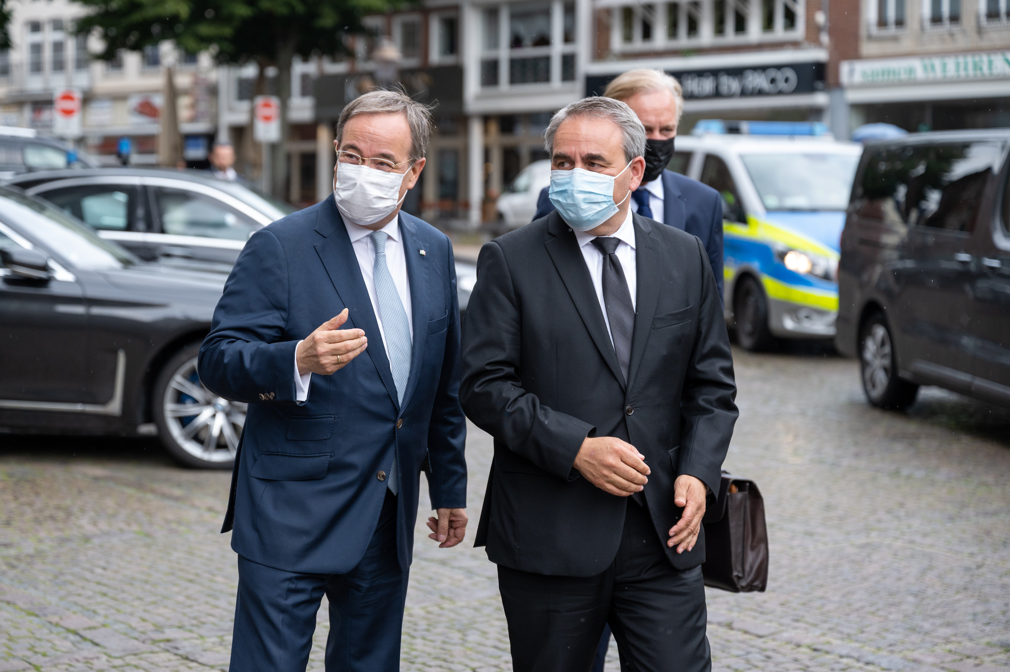 Ministerpräsident Armin Laschet hat am Freitag, 9. Juli 2021, den Präsidenten der französischen Region Hauts-de-France, Xavier Bertrand, in Aachen empfangen. Anlass des Besuchs war die Unterzeichnung einer neuen Gemeinsamen Erklärung über die Zusammenarbeit und den weiteren Ausbau der freundschaftlichen Beziehungen zwischen Nordrhein-Westfalen und der Region Hauts-de-France.