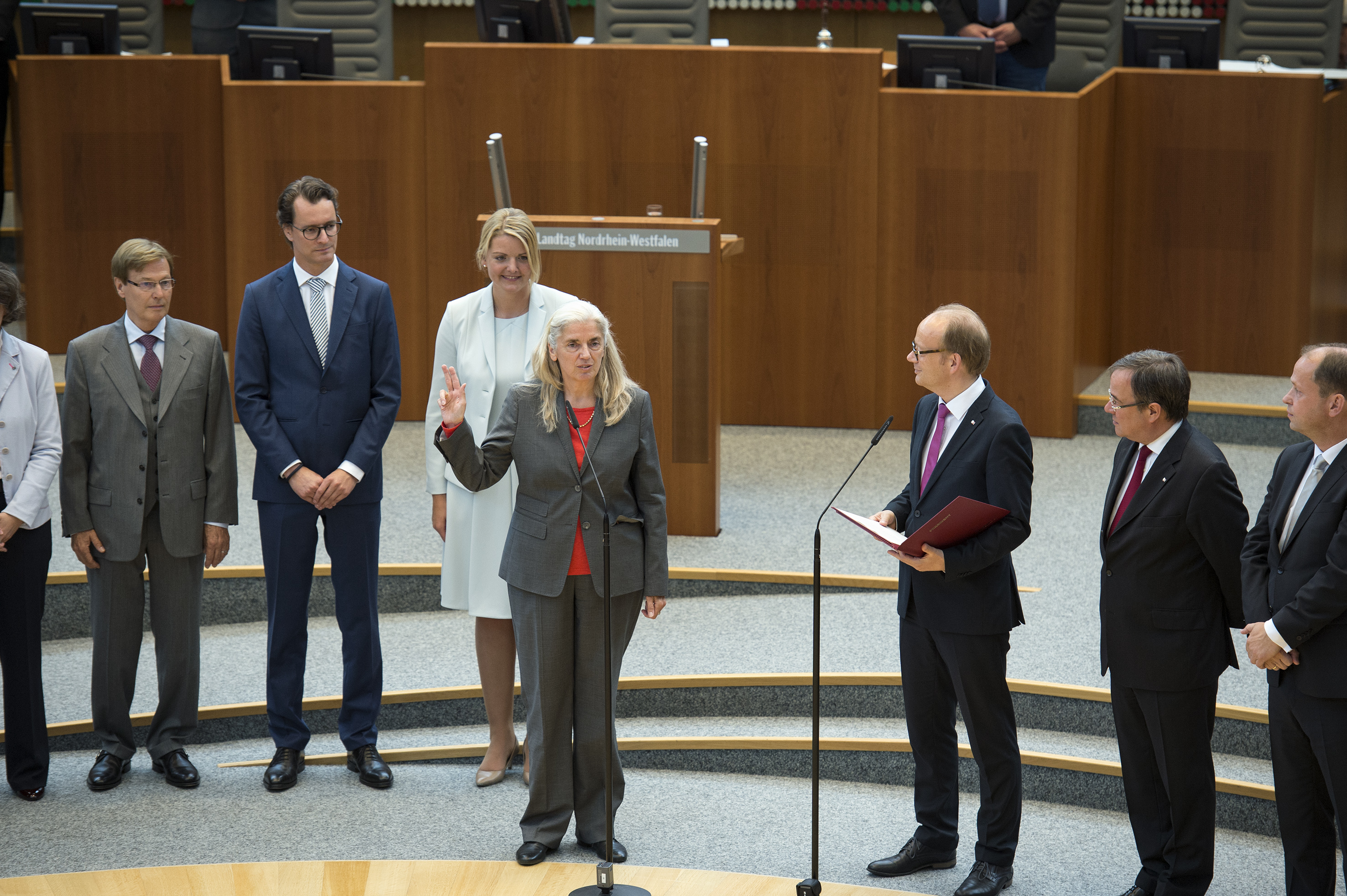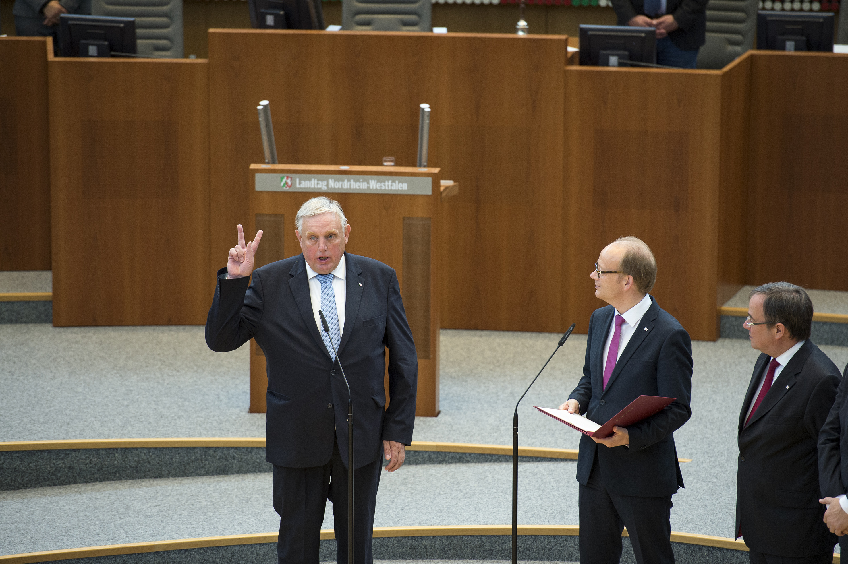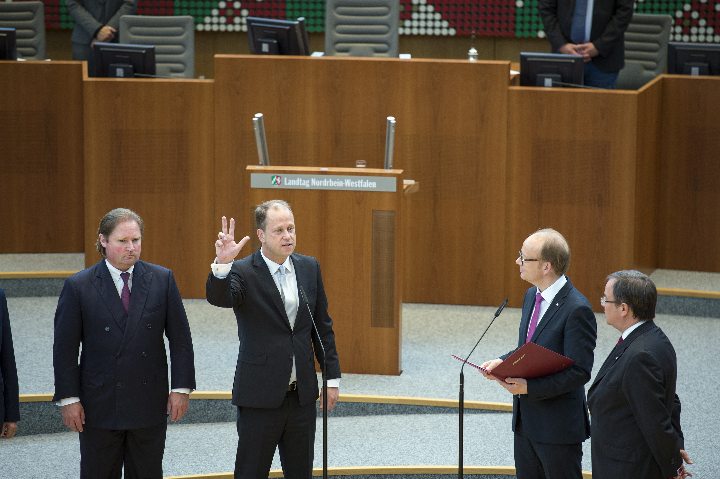 Der Landtagspräsident André Kuper hat am Freitag, 30. Juni 2017, die Mitglieder der neuen Landesregierung vereidigt. Die Ministerinnen und Minister leisteten vor den versammelten Abgeordneten den Amtseid.