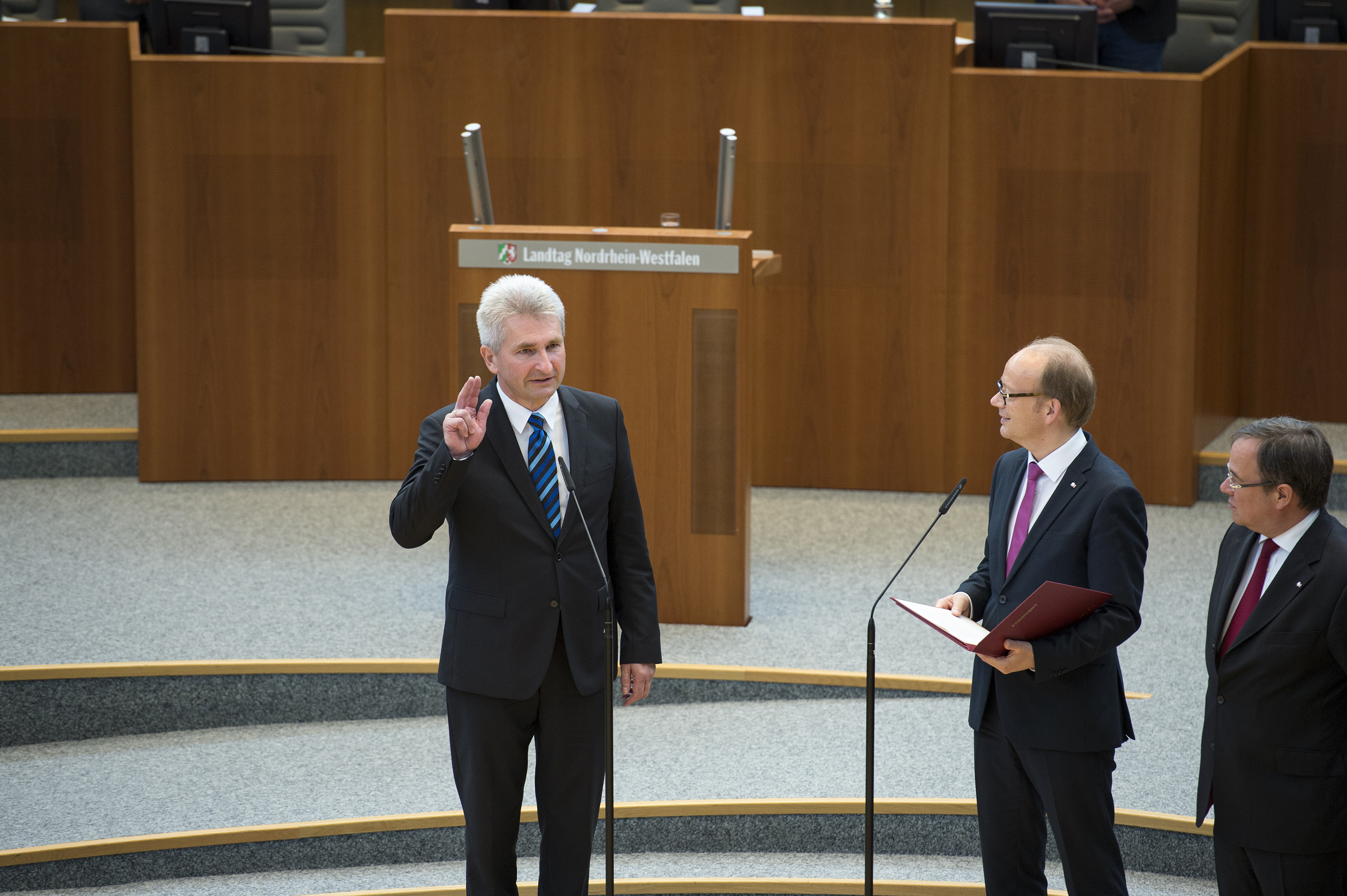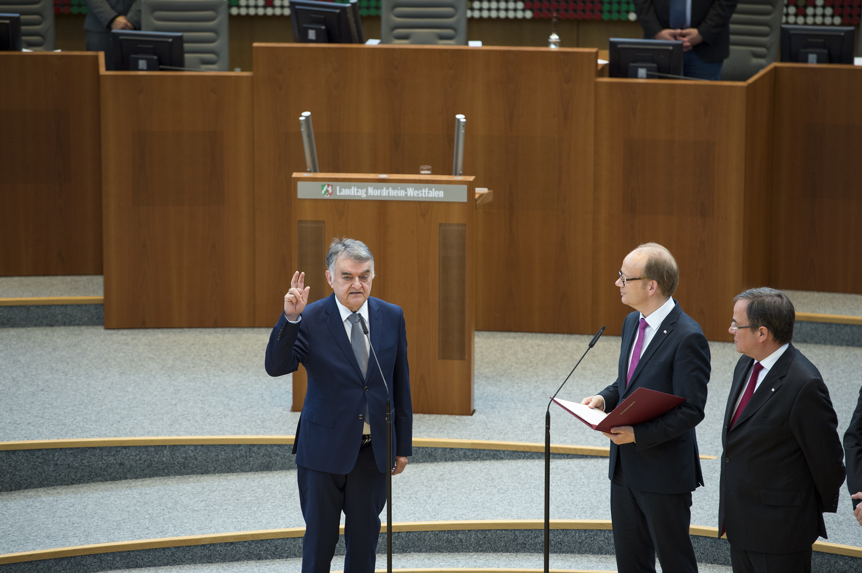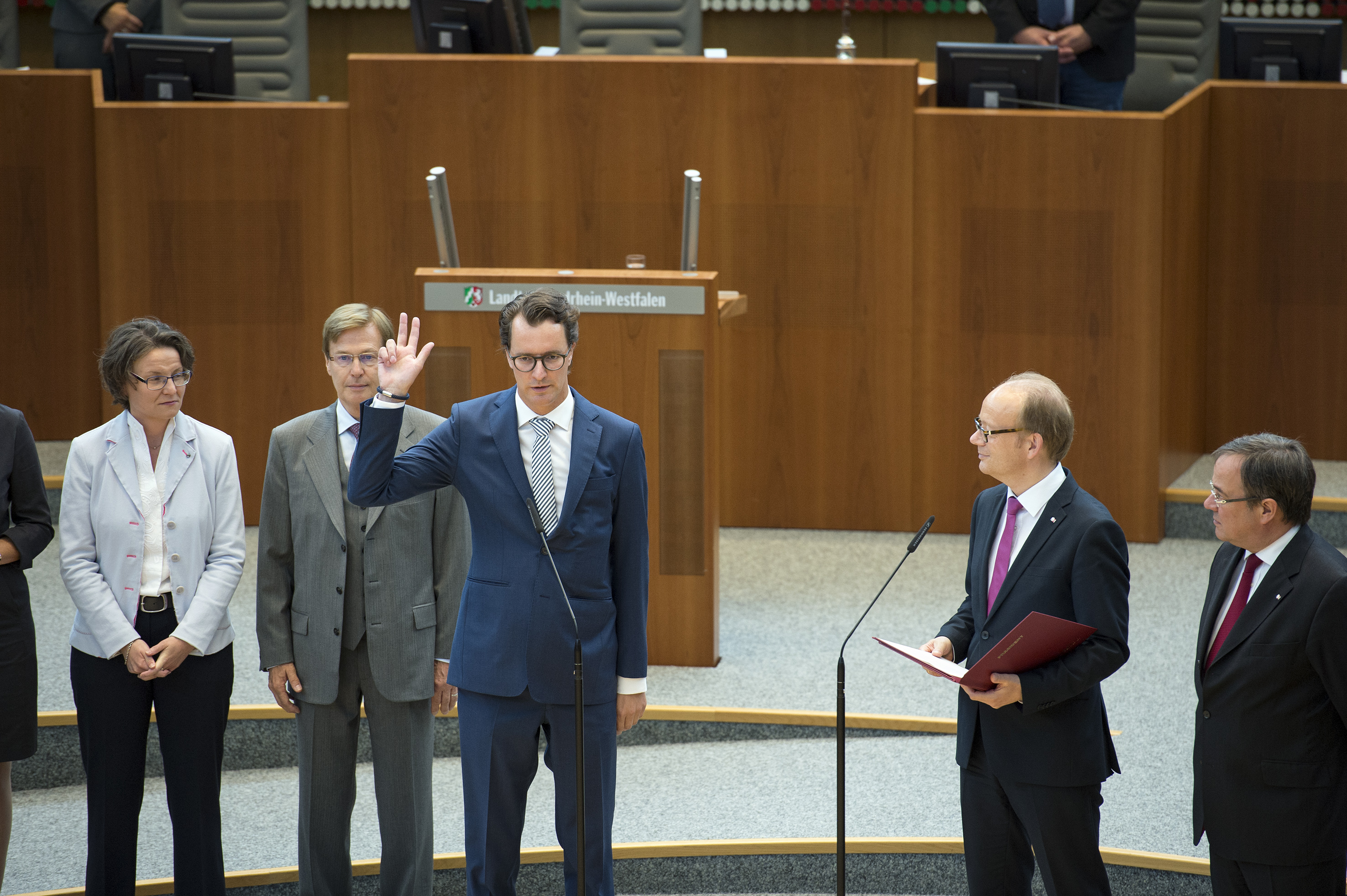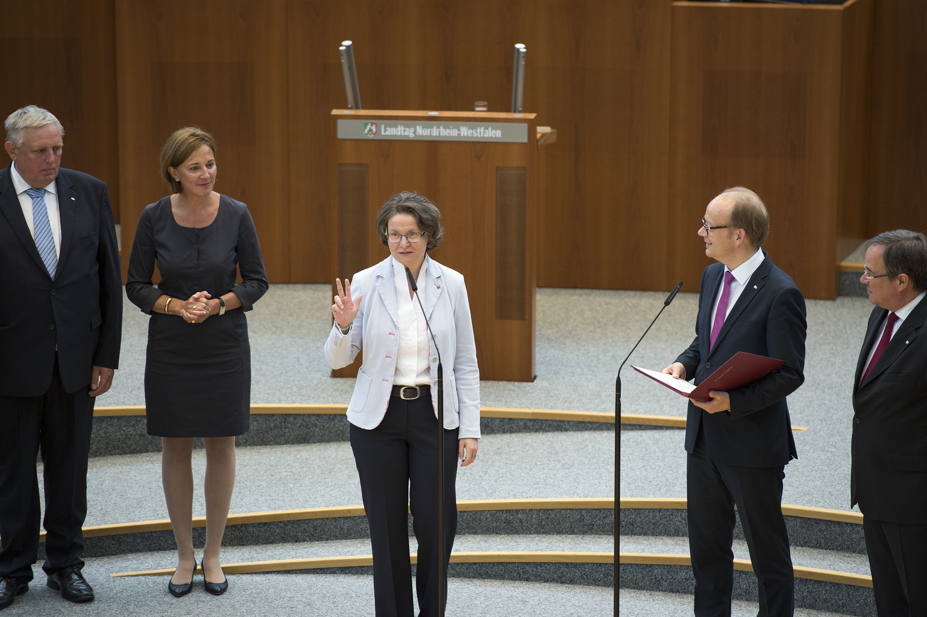 Der Landtagspräsident André Kuper hat am Freitag, 30. Juni 2017, die Mitglieder der neuen Landesregierung vereidigt. Die Ministerinnen und Minister leisteten vor den versammelten Abgeordneten den Amtseid.