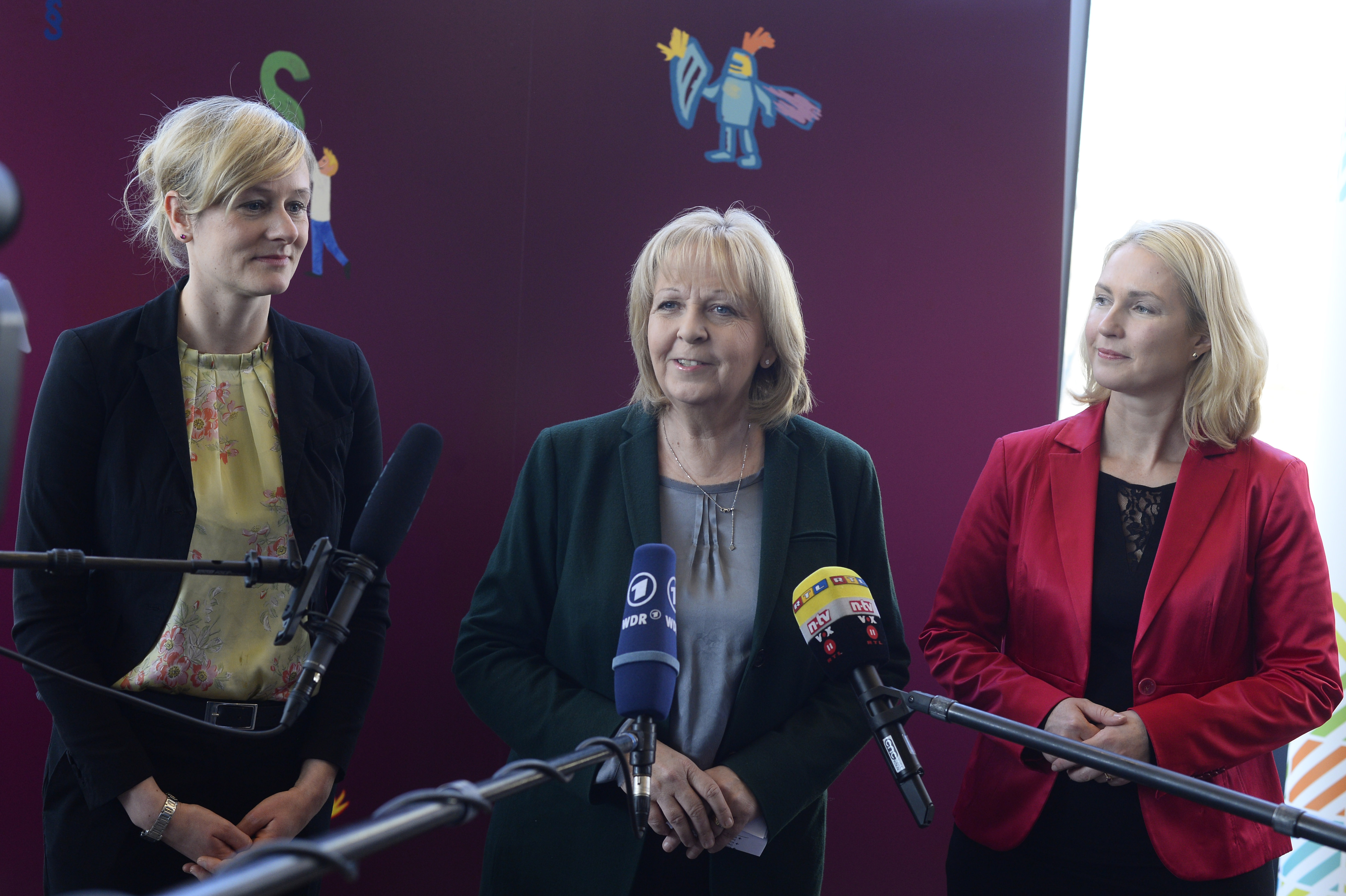 NRW-Ministerpräsidentin Hannelore Kraft, die Bundesministerin für Familie, Senioren, Frauen und Jugend, Manuela Schwesig, und die Ministerin für Familie, Kinder, Jugend, Kultur und Sport des Landes Nordrhein-Westfalen, Christina Kampmann, gaben im Rahmen des Deutschen Kinder- und Jugendhilfetages ein Pressestatement zum Thema Kinderrechte ab.
