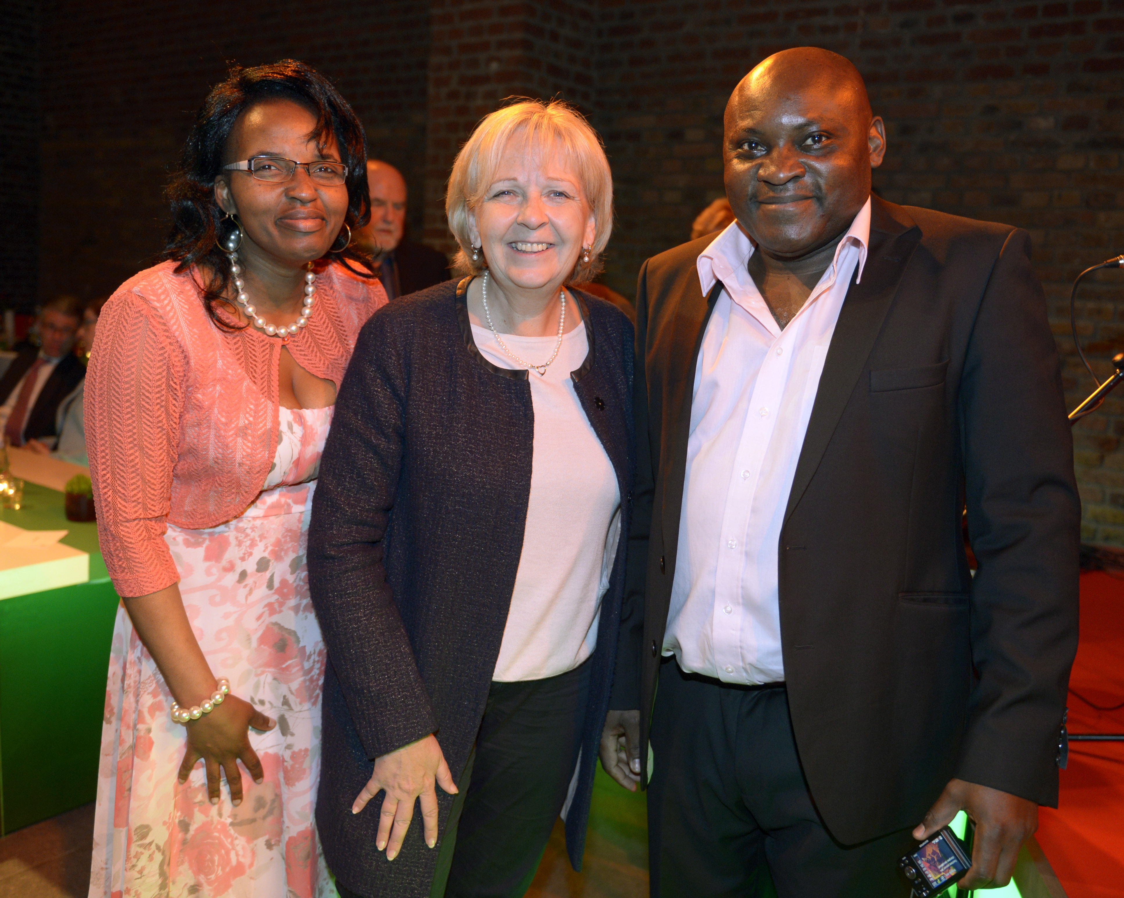 Ministerpräsidentin Hannelore Kraft umringt von Philomene Fonkou und Damas Tazanou-Wamba, IG Metall Köln-Leverkusen