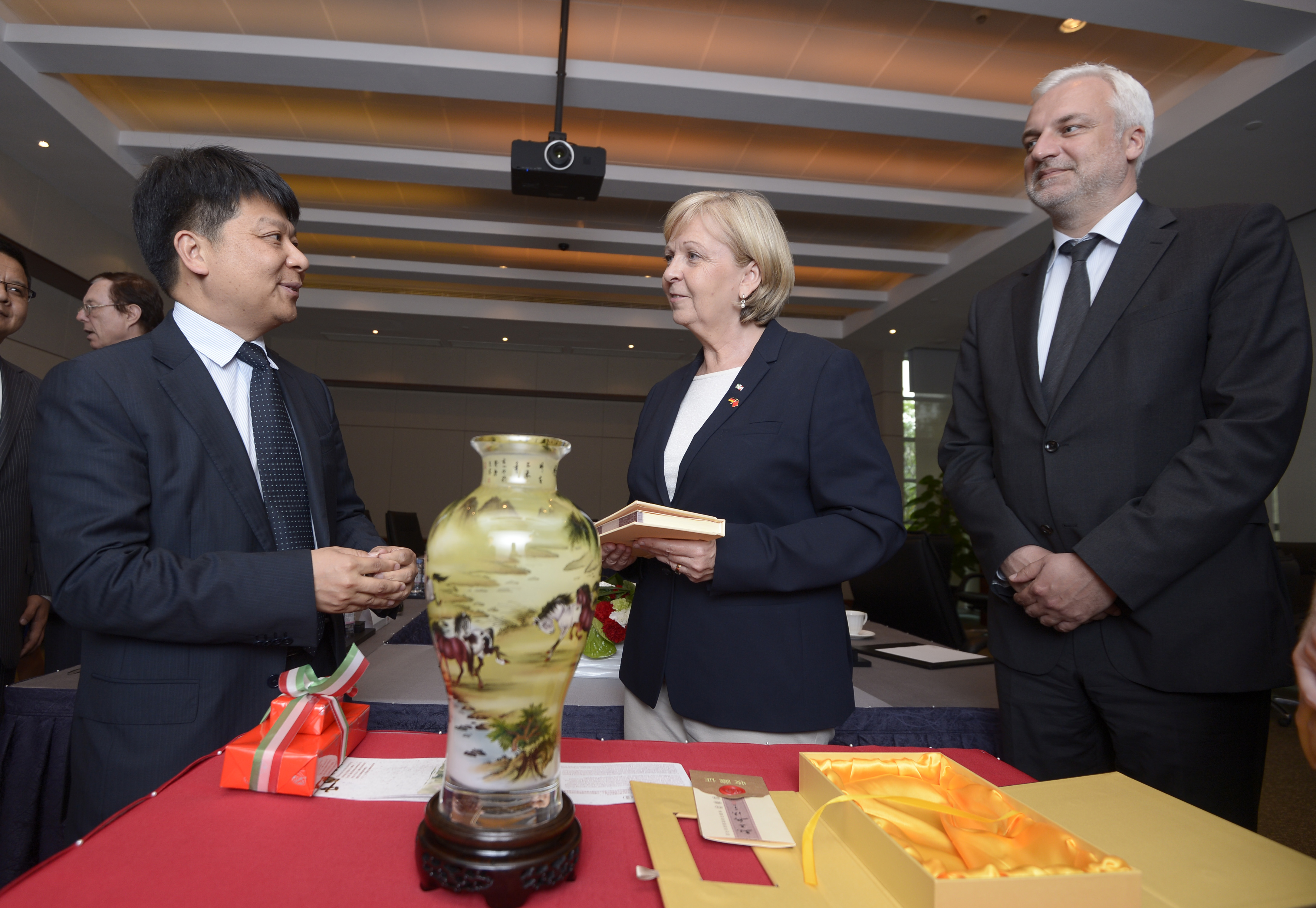 Ministerpräsidentin Hannelore Kraft und Wirtschaftsminister Garrelt Duin beim Austausch von Gastgeschenken mit CEO von Huawei, GUO Ping.