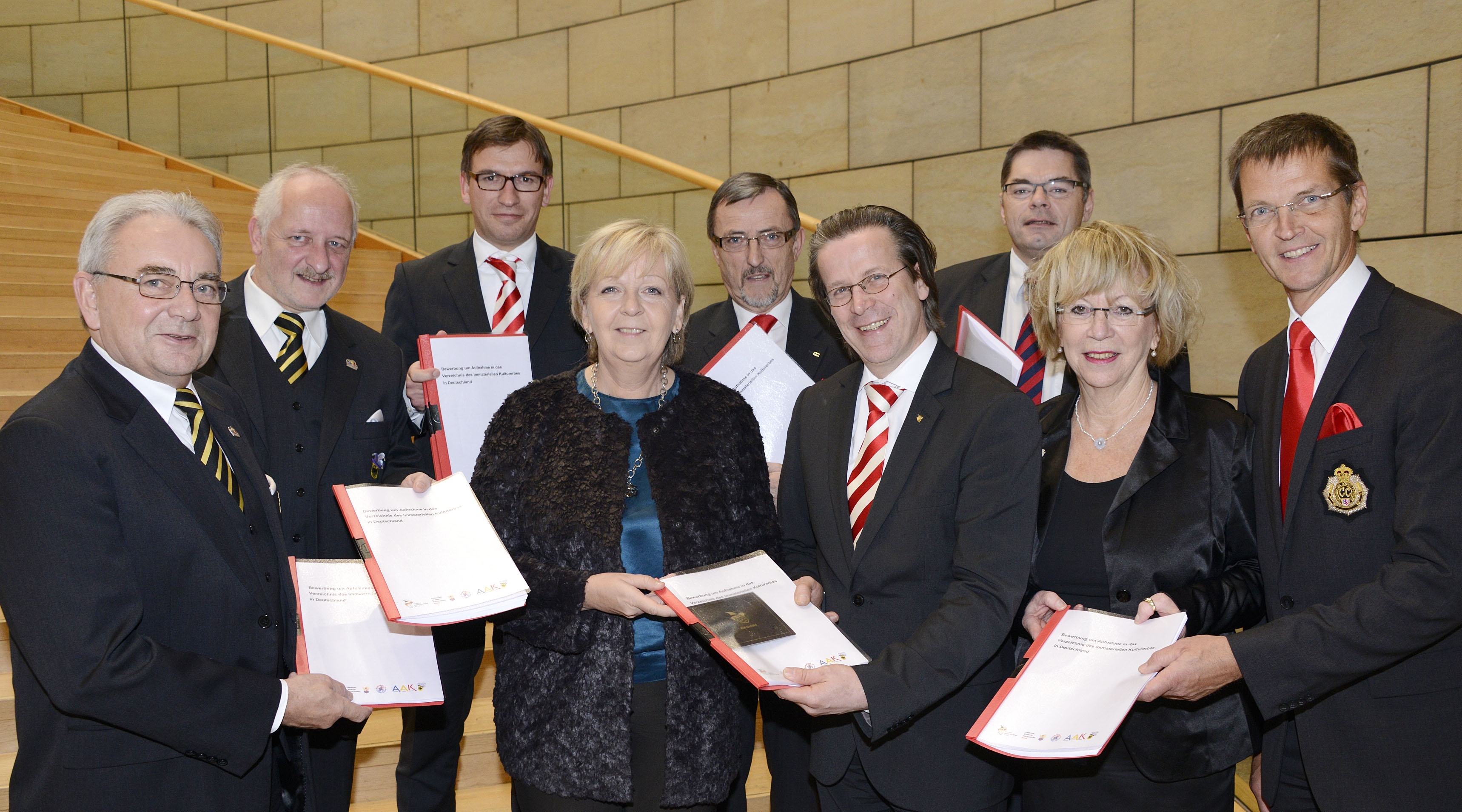 Düsseldorf, 28. November: Das Festkomitee Kölner Karneval, der Festausschuss Bonner Karneval, das Comitee Düsseldorfer Carneval und der FestAusschuss Aachener Karneval haben an Ministerpräsidentin Hannelore Kraft offiziell die Bewerbung um Aufnahme in das Verzeichnis des immateriellen Kulturerbes „Rheinischer Karneval“ überreicht. Pers. v. l. n. r.: Wilm Lürken, Peter Brust, Marcel Beyersdorf, Ministerpräsidentin Hannelore Kraft, Michael Laumen, Christoph Kuckelkorn, Ralf Birkner, Marlies Stockhorst, Josef Hinkel.