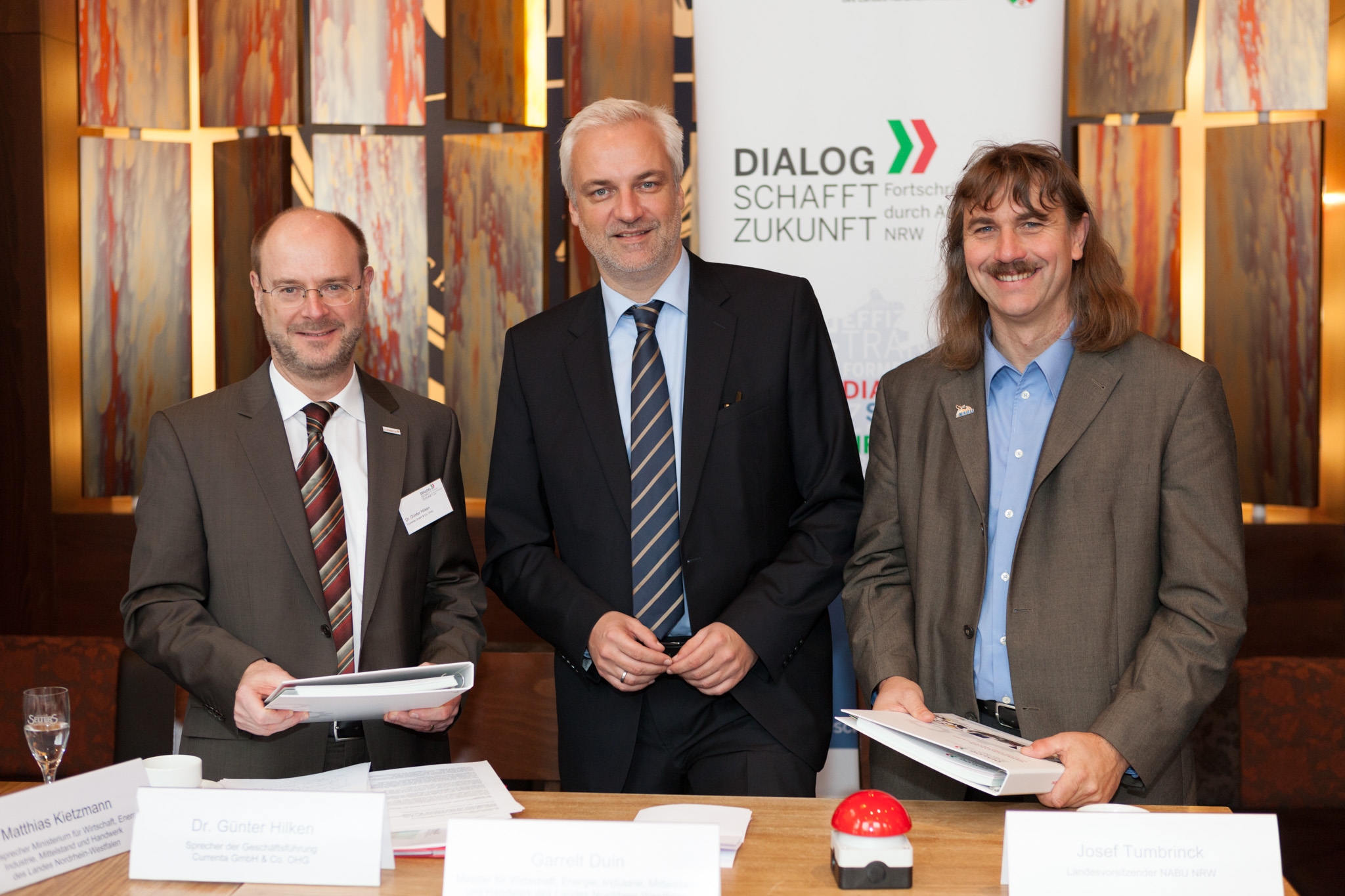 Sie sind hier:StartseiteNRW informierenMediathek Dialog schafft Zukunft, 16.11.2012 Minister Duin übergibt den Werkzeugkasten an Dr. Günter Hilken (Currenta, links) und Josef Tumbrinck (NABU, rechts). / Foto: Ministerium für Wirtschaft, Energie, Industrie, Mittelstand und Handwerk, Marc Thürbach Mediendetails Dateityp Bild Auflösung 2048 x 1365 px Download (1 MB)