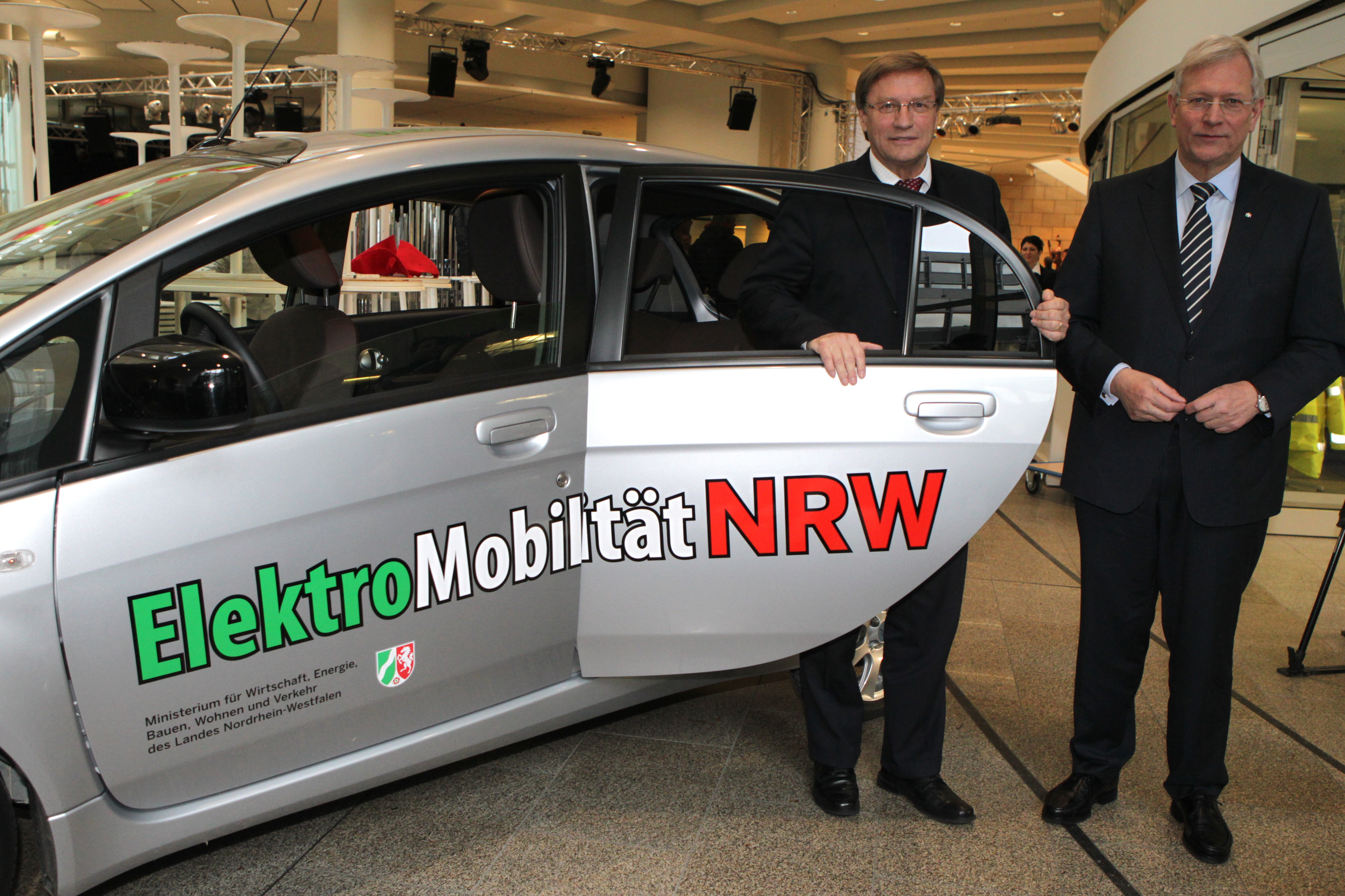 Wirtschaftsminister Voigstberger und Landtagspräsident Uhlenberg präsentierten im Landtag das neue Dienst-Elektroauto des Ministeriums.