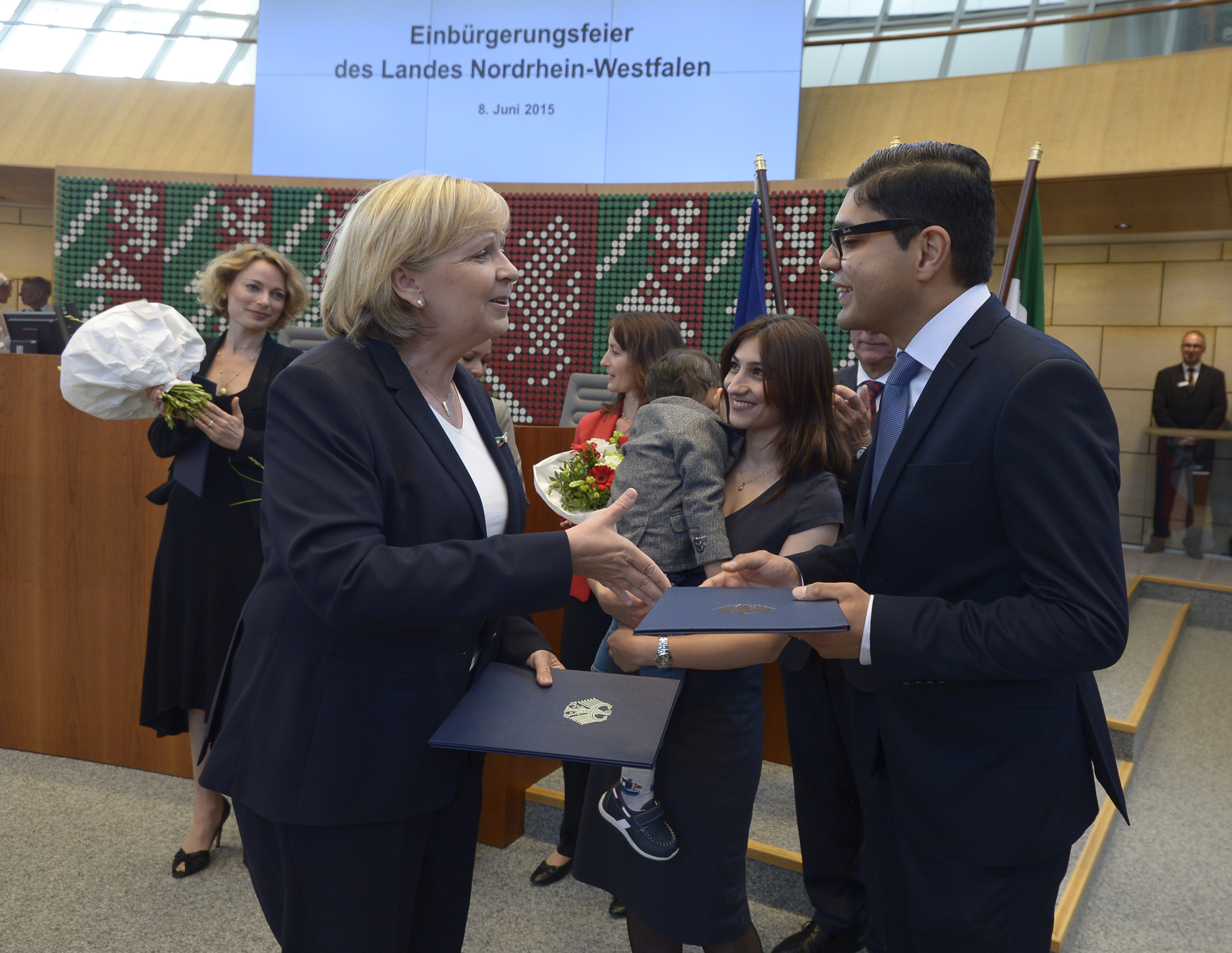 Ministerpräsidentin Kraft gratuliert Saeid Hamzehzarghani zu dessen Einbürgerung. Foto: Staatskanzlei NRW / R. Pfeil