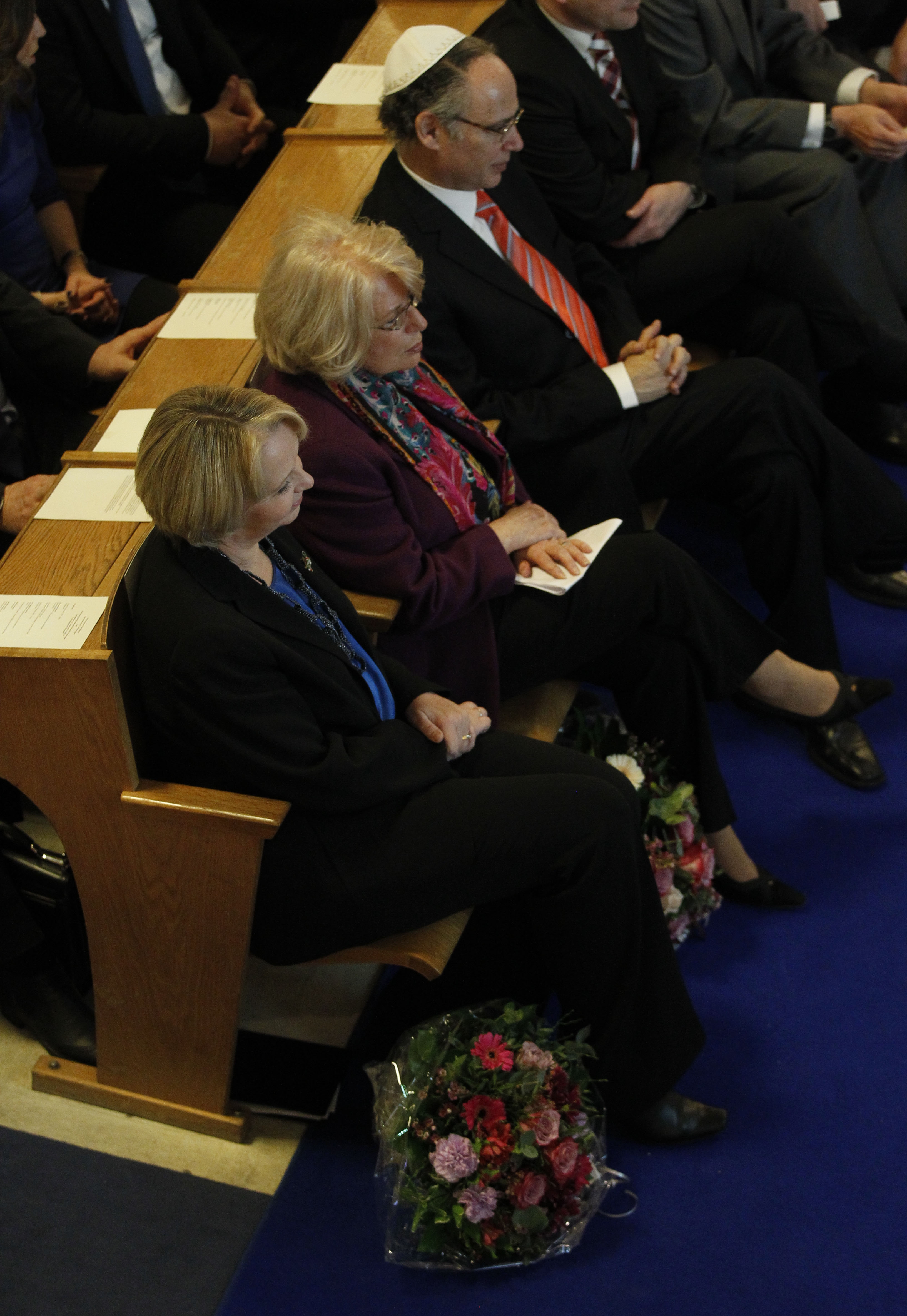 Ministerpräsidentin Hannelore Kraft während der Gedenkfeier für Paul Spiegel in der Düsseldorfer Synagoge mit der Witwe von Paul Spiegel, Gisele Spiegel (M.) und dem Präsidenten des Zentralrates der Juden in Deutschland, Dieter Graumann (r.).
