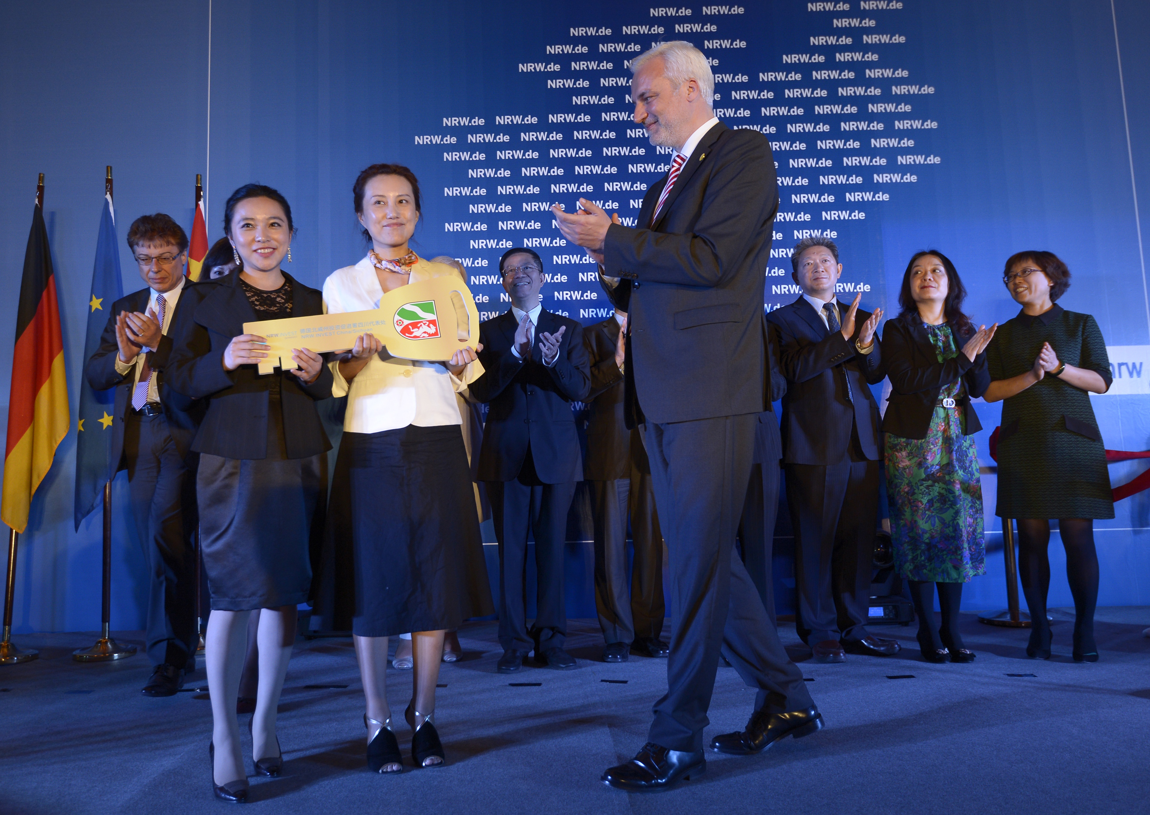 Wirtschaftsminister Garrelt Duin überreicht symbolisch einen Schlüssel and LIU Donna, der Leiterin, der neuen Repräsentanz NRW.INVEST Sichuan in Chengdu, China.