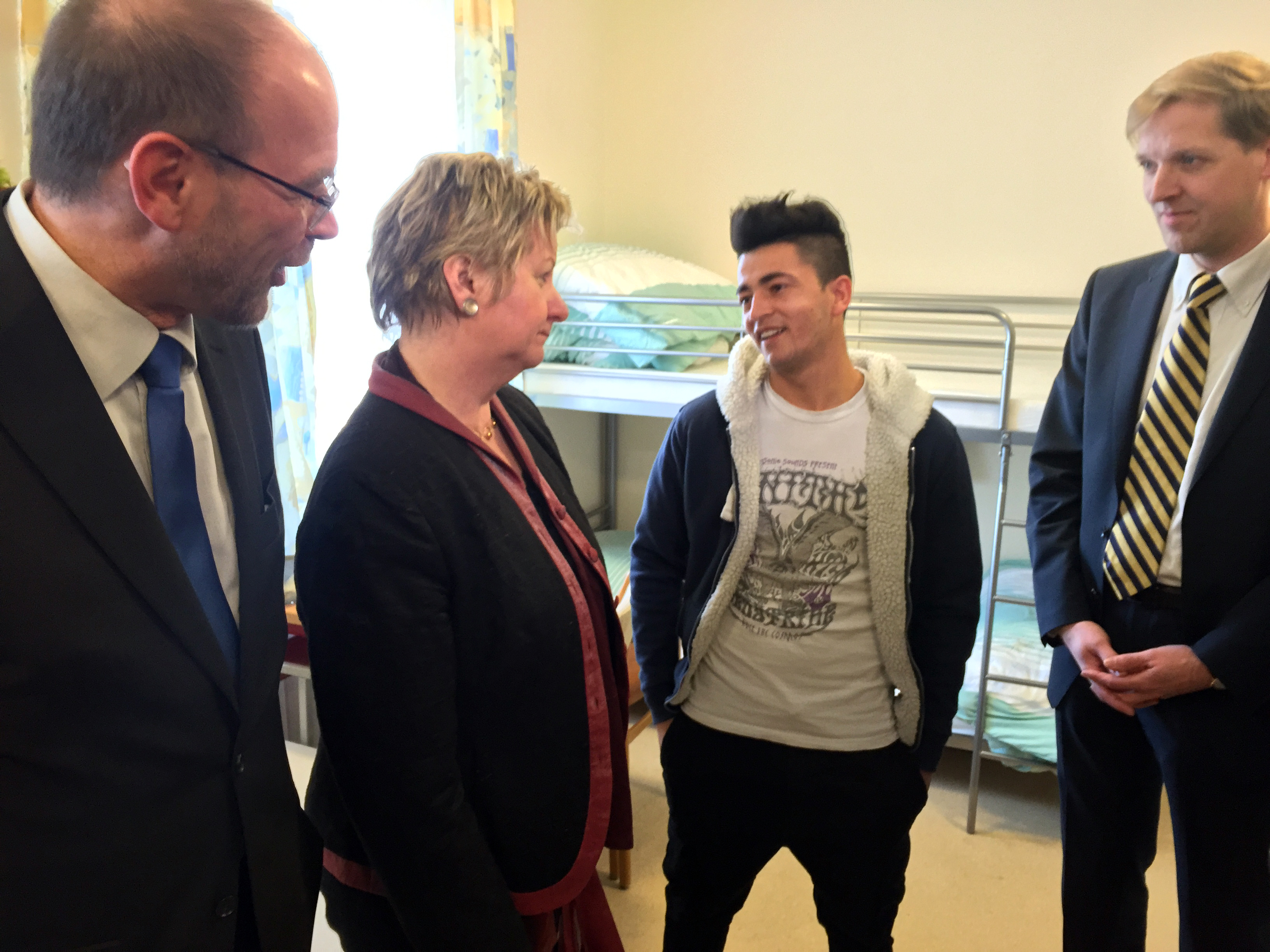 Schulministerin Sylvia Löhrmann und Integrationsminister Rainer Schmeltzer im Gespräch mit einem Zuwanderer.