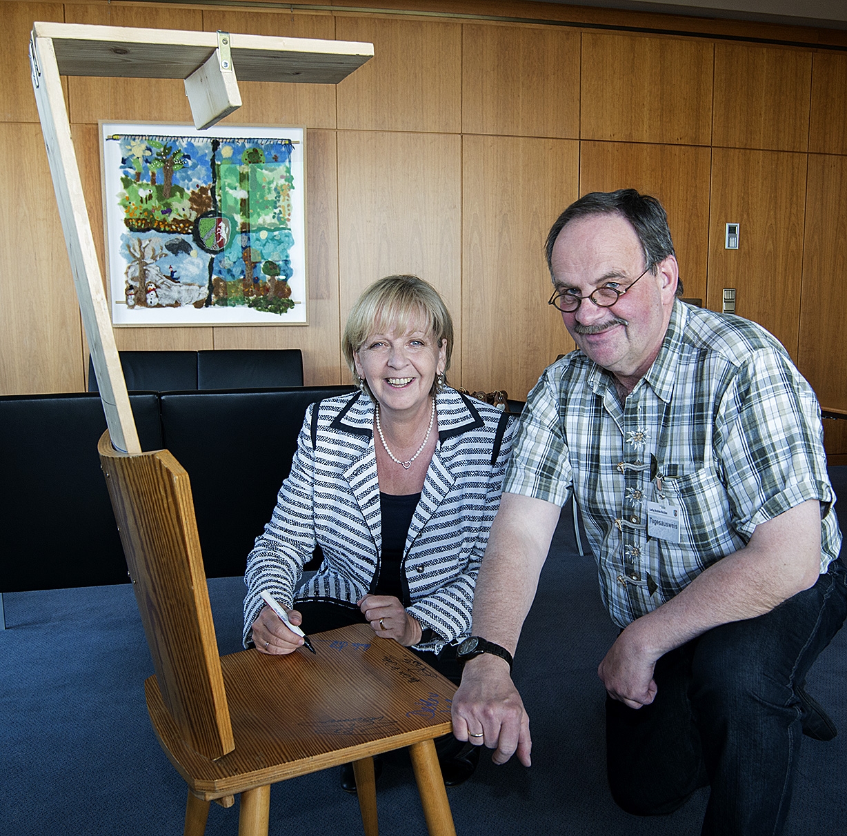 Ministerpräsidentin Hannelore Kraft hat „Wetten dass“-Teilnehmer Detlev Jarchow getroffen und einen Spezialstuhl handsigniert, der in der Ausgabe der TV-Show in Düsseldorf zum Einsatz kam. Der Stuhl ist von mehreren Prominenten signiert worden und soll versteigert werden.