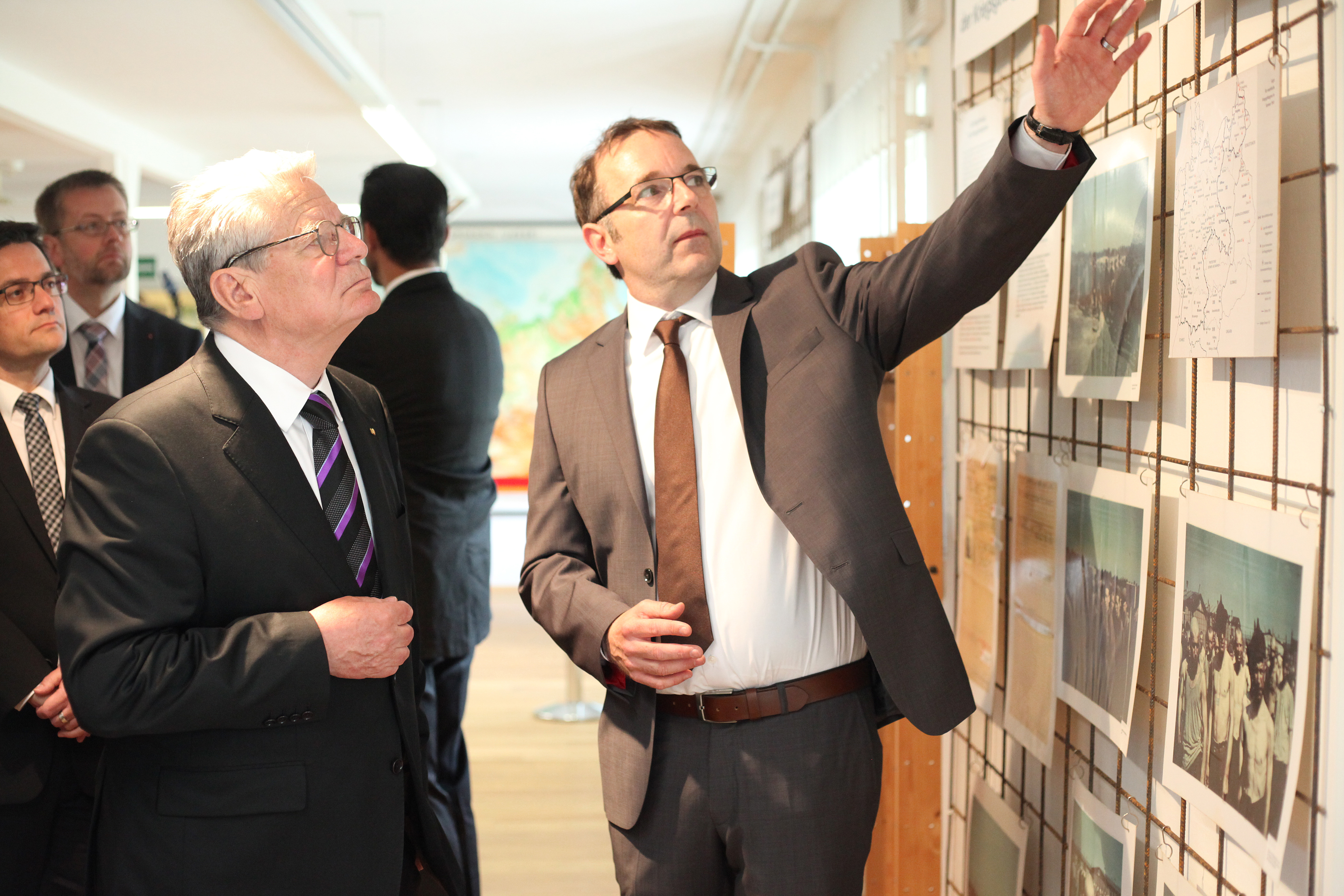 Gemeinsamer Rundgang in der Dokumentationsstätte Stalag 326 (VI K). V.l.n.r: Justizminister Thomas Kutschaty, Bundespräsident Joachim Gauck und Oliver Nickel, Geschäftsführer der Dokumentationsstätte.