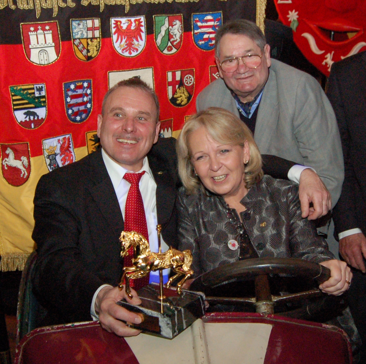 Beim Jahresempfang des Schaustellerbundes wurde Ministerpräsidentin Hannelore Kraft mit dem Goldenen Karussellpferd geehrt. Von links: Der Präsident des deutschen Schaustellerbundes Albert Ritter, Ministerpräsidentin Kraft und dahinter Schausteller Hubert Heitmann.