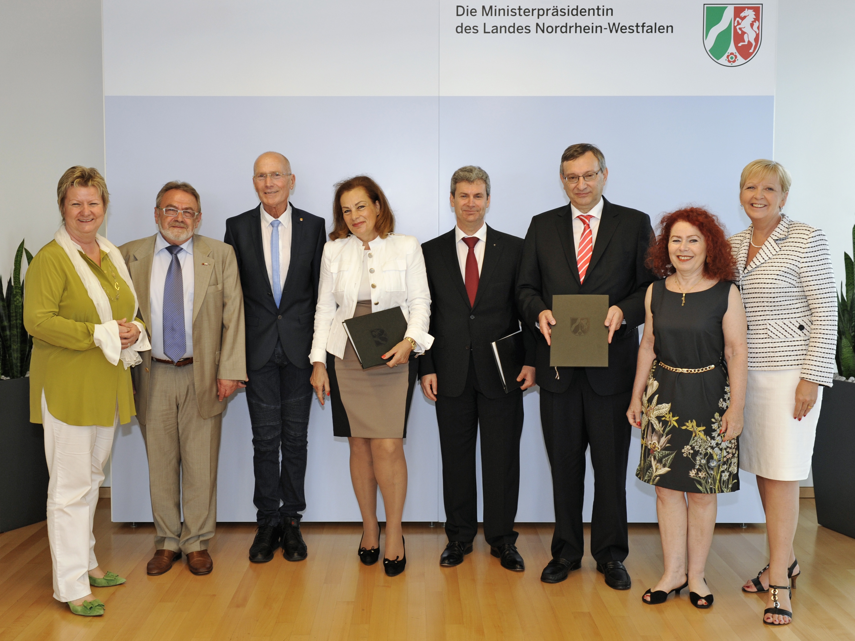 Ministerpräsidentin Hannelore Kraft und die Vertreter des Landesverbandes der jüdischen Gemeinden von Nordrhein, des Landesverbandes der jüdischen Gemeinden von Westfalen-Lippe und der Synagogen-Gemeinde Köln haben den 4. Änderungsvertrag zwischen dem Land Nordrhein-Westfalen und den jüdischen Landesverbänden in Düsseldorf unterzeichnet.