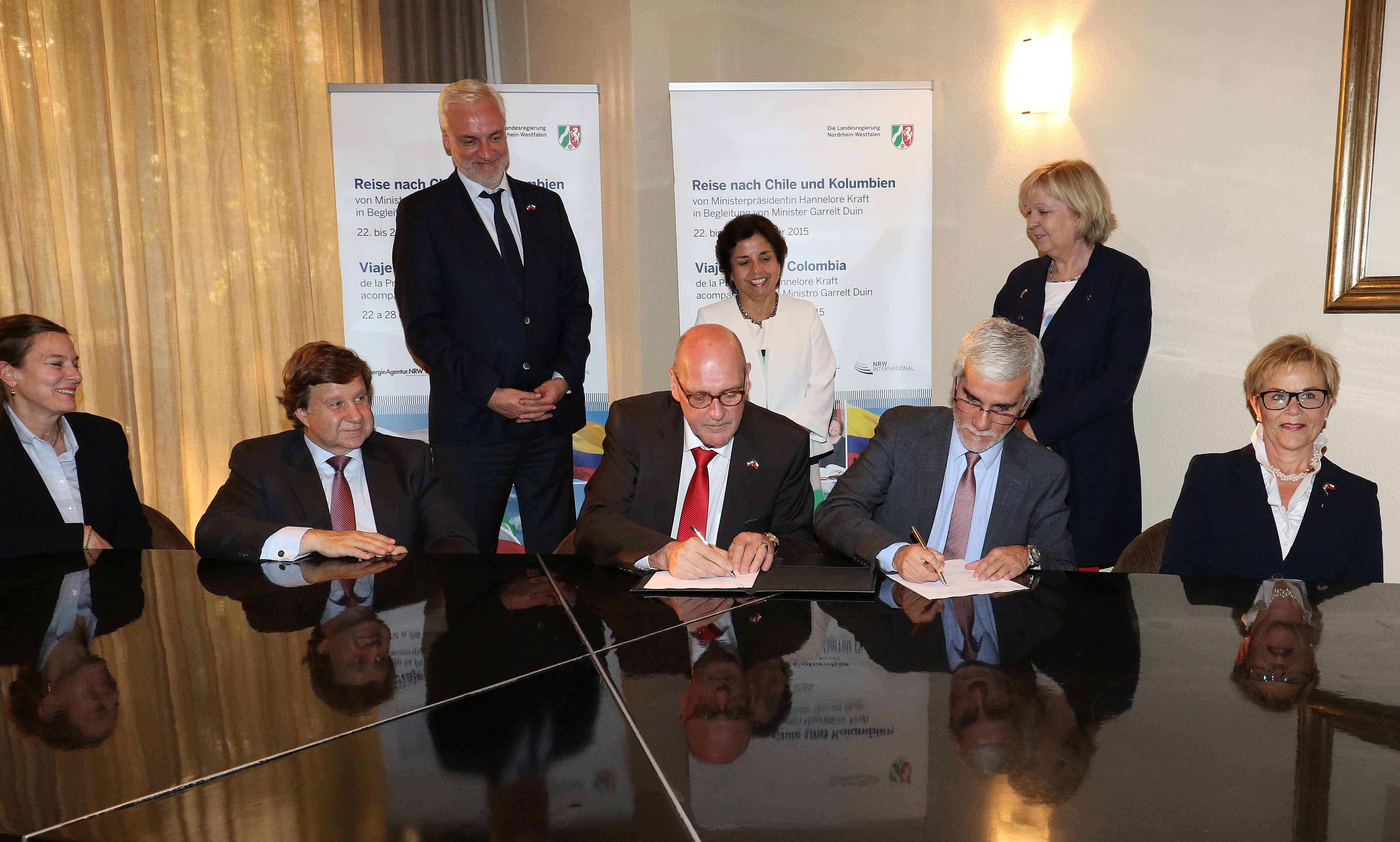 Unterzeichnung des "Letter of Intent" zwischen der EnergieAgentur.NRW und dem Industrieverband Antofagasta, am Dienstag den 24.11.2015 in Santiago de Chile. V.r.n.l.: Cornelia Sonnenberg, HGF AHK Chile, Juan Pablo Hess, Präsident AHK Chile, NRW-Wirtschaftsminister Garrelt Duin, die chilenische Bergbauministerin Aurora Williams, Peter Hartlieb Energie-Agentur NRW, Fernando Cortez, Ministerpräsidentin Hannelore Kraft, Heike Gothe