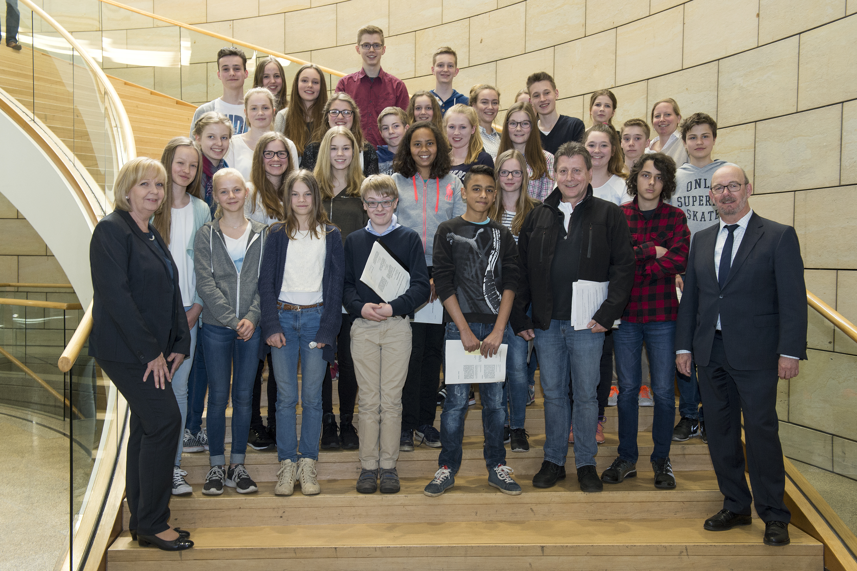 Ministerpräsidentin Hannelore Kraft hat am Donnerstag, 21. April 2016, 31 Schülerinnen und Schüler der 7. bis 10. Klasse der Israhel-van-Meckenem-Realschule aus Bocholt im Landtag NRW begrüßt. Bei den Jugendlichen handelt es sich um Teilnehmerinnen und Teilnehmer der Sowi-Kurse in ihren Jahrgangsklassen. Mit dabei waren auch zwei Flüchtlingskinder sowie betreuende Lehrer. Die Einladung der Schülergruppe in den Landtag geht auf ein Zusammentreffen mit einem Schüler der Realschule anlässlich eines Bocholt-Besuchs der Ministerpräsidentin im August 2015 zurück. Der Schüler Claas hatte die Ministerpräsidentin damals interviewt, im Gegenzug hatte Ministerpräsidentin Kraft Claas und seine Mitschülerinnen und Mitschüler nach Düsseldorf eingeladen.