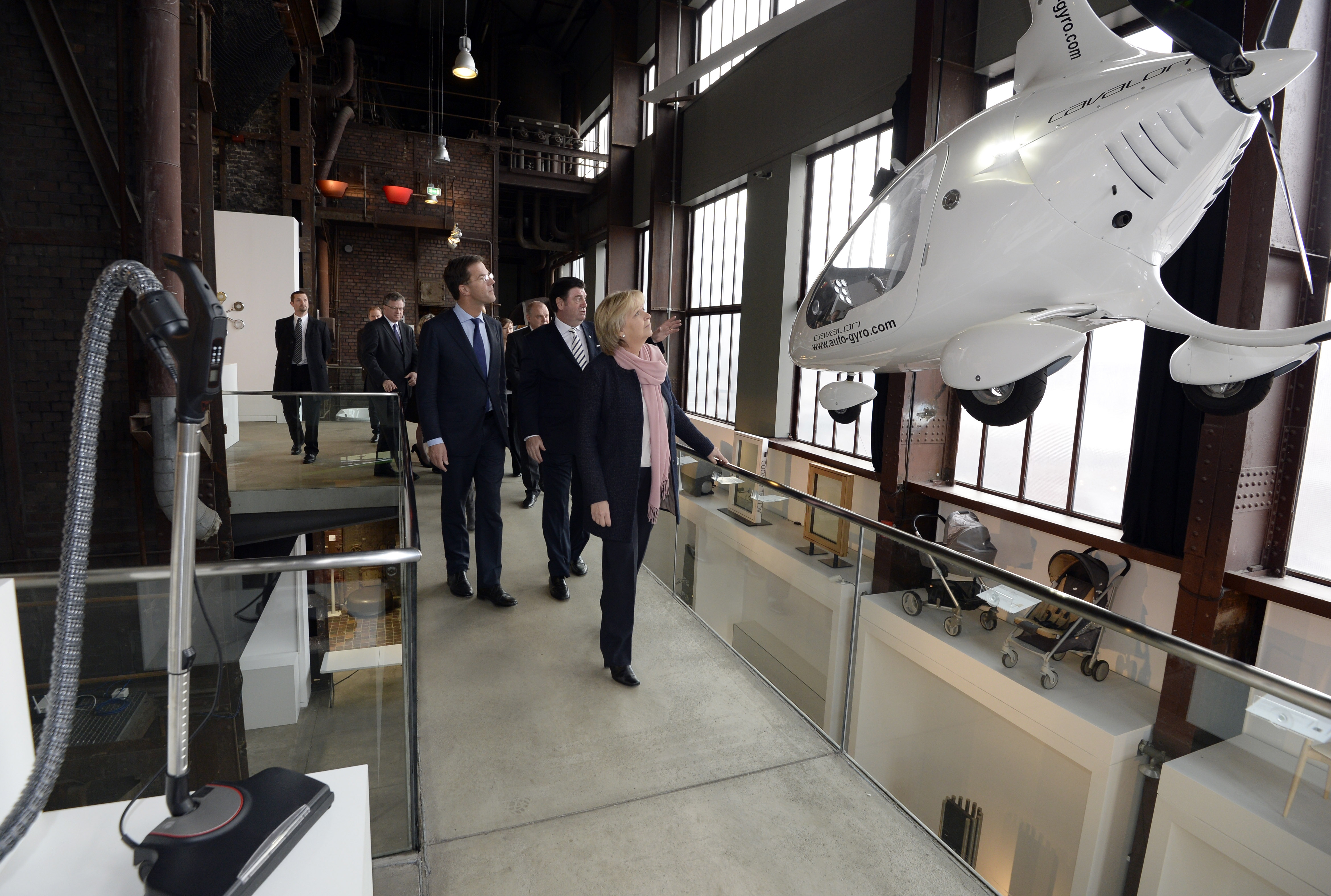 Ministerpräsidentin Hannelore Kraft und der niederländische Ministerpräsident Mark Rutte werden von Prof. Dr. Peter Zec (l), geschäftsführender Vorstand des Design Zentrums NRW, durch die Ausstellung des red dot design Museums auf dem Gelände der Zeche Zollverein in Essen geführt.