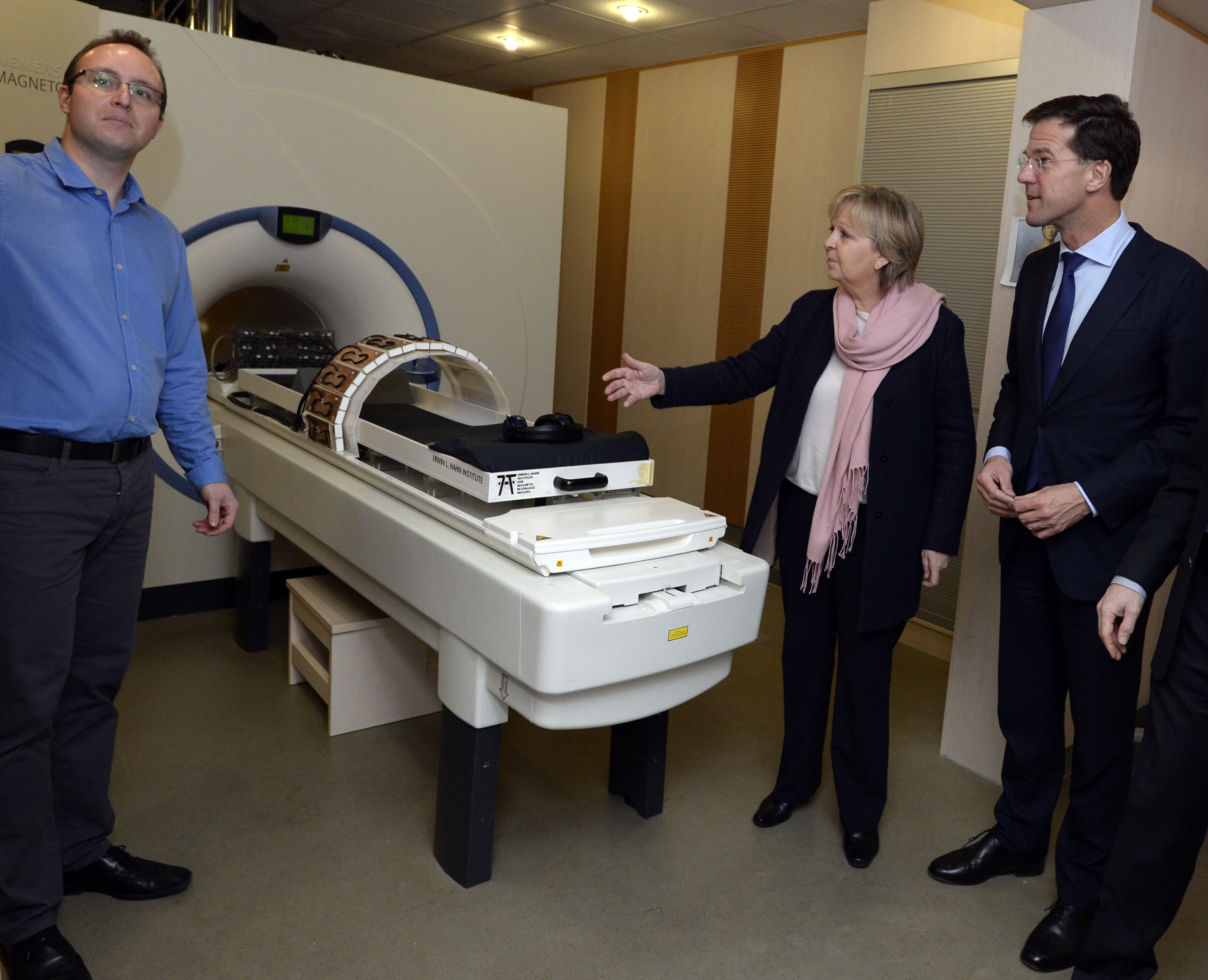 Ein Mitarbeiter (l) erklärt Ministerpräsidentin Hannelore Kraft und dem niederländischen Ministerpräsidenten Mark Rutte im Institut für Magnetresonanz die Arbeitsweise des MRT, auf dem Gelände der Zeche Zollverein in Essen.