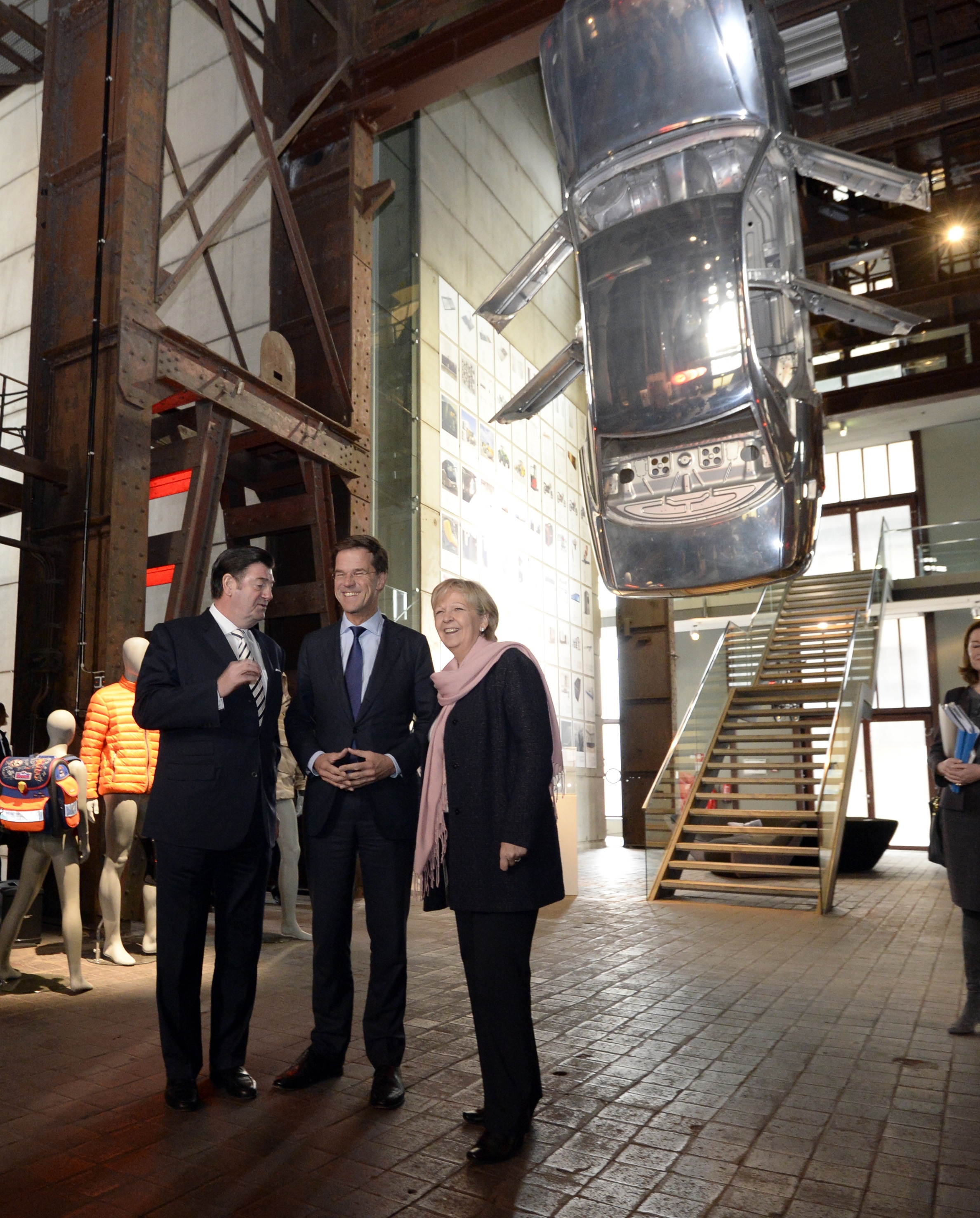 Ministerpräsidentin Hannelore Kraft und der niederländische Ministerpräsident Mark Rutte werden von Prof. Dr. Peter Zec (l), geschäftsführender Vorstand des Design Zentrums NRW, in der Ausstellung des red dot design Museums auf dem Gelände der Zeche Zollverein in Essen begrüßt.