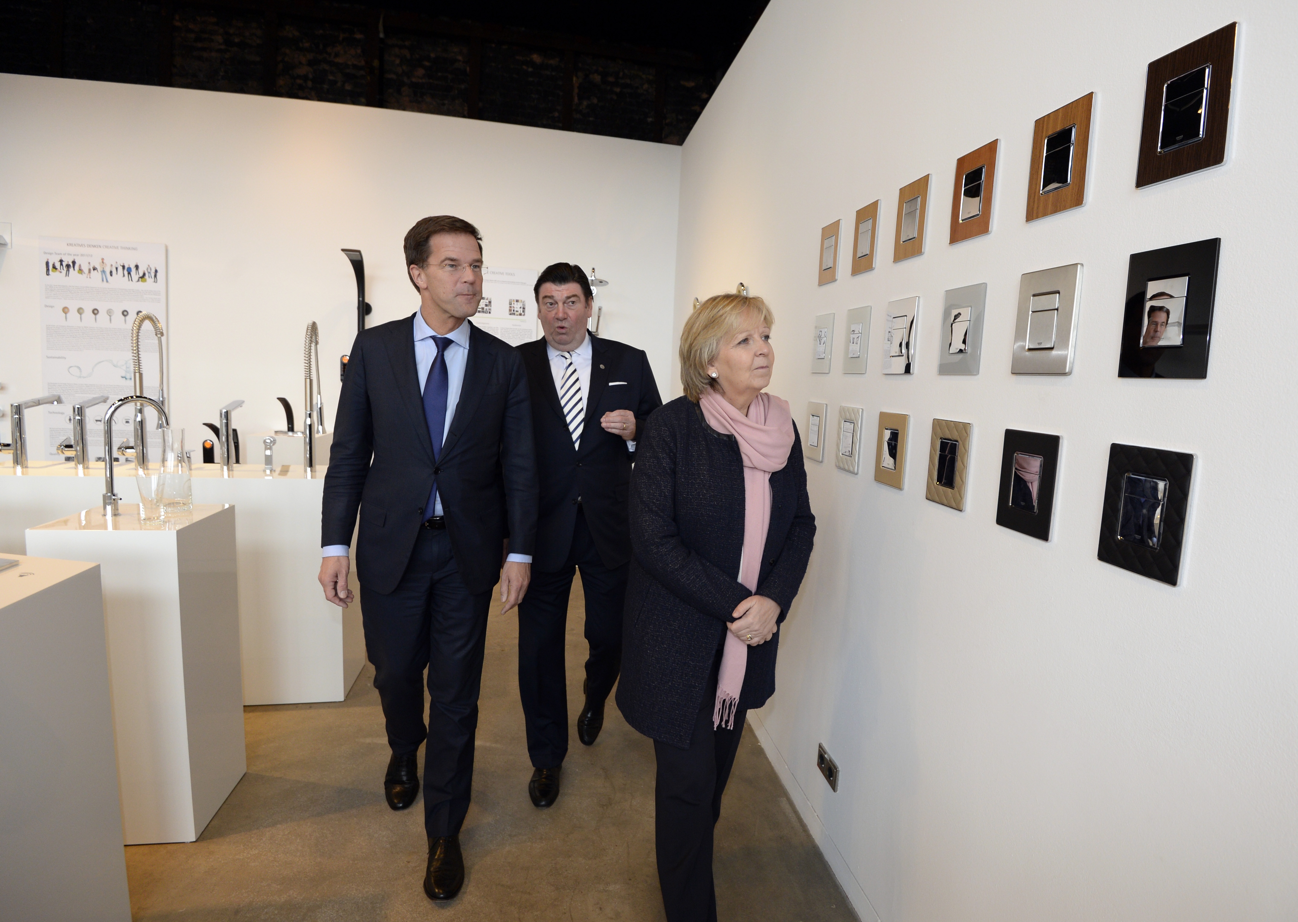 Ministerpräsidentin Hannelore Kraft und der niederländische Ministerpräsident Mark Rutte werden von Prof. Dr. Peter Zec (l), geschäftsführender Vorstand des Design Zentrums NRW, durch die Ausstellung des red dot design Museums auf dem Gelände der Zeche Zollverein in Essen geführt.