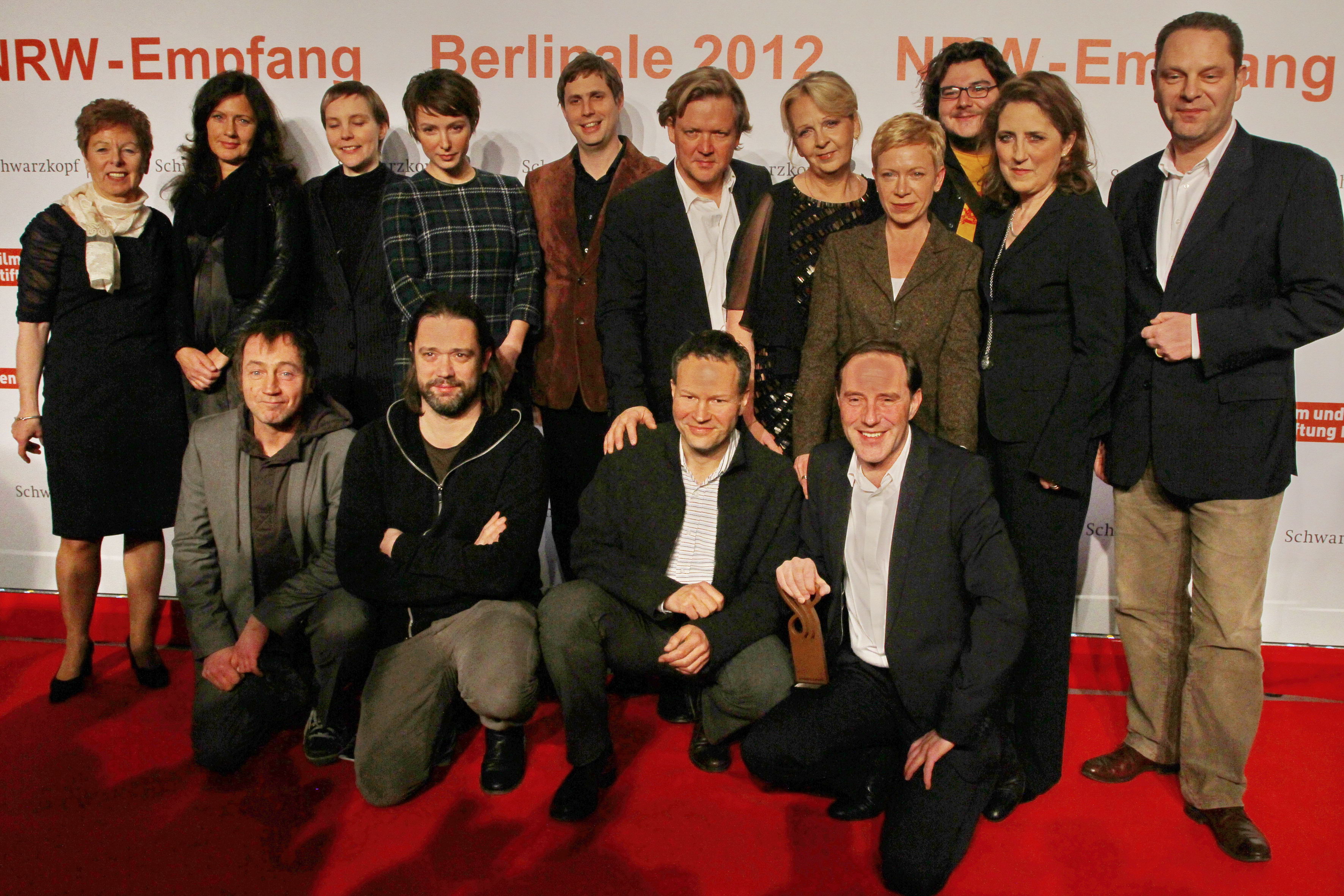 Ministerpräsidentin Hannelore Kraft und Ministerin Dr. Angelica Schwall-Düren mit dem Team "Ruhm", vorne rechts knieend: Stefan Kurt mit dem Schauspielerpreis 2012.