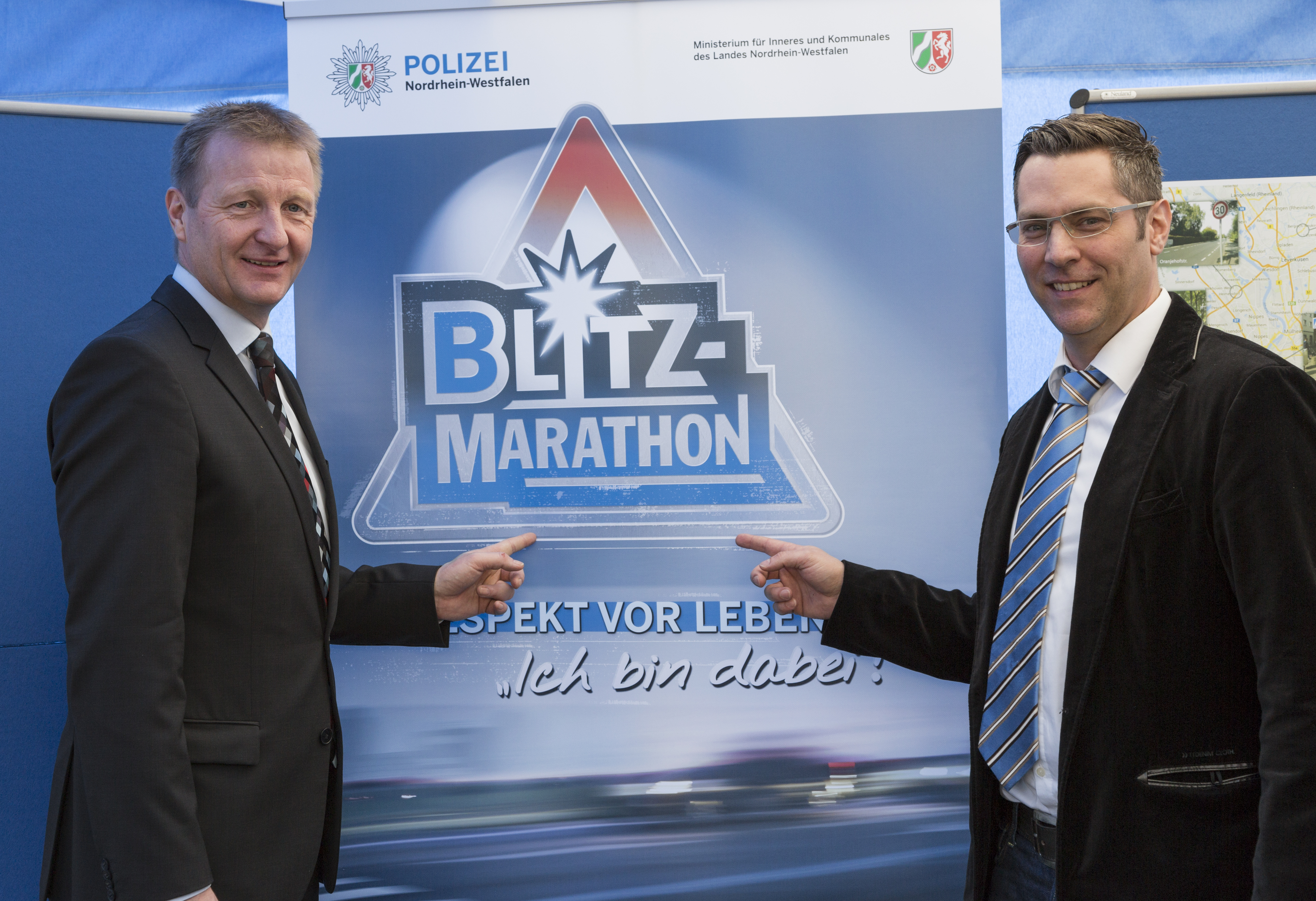 Pressekonferenz in Köln zur Ankündigung des morgigen landesweiten Blitzmarathons. Innenminister Ralf Jäger (l) und Dr. Dirk Kemper vom Institut für Straßenwesen der RWTH Aachen (r).