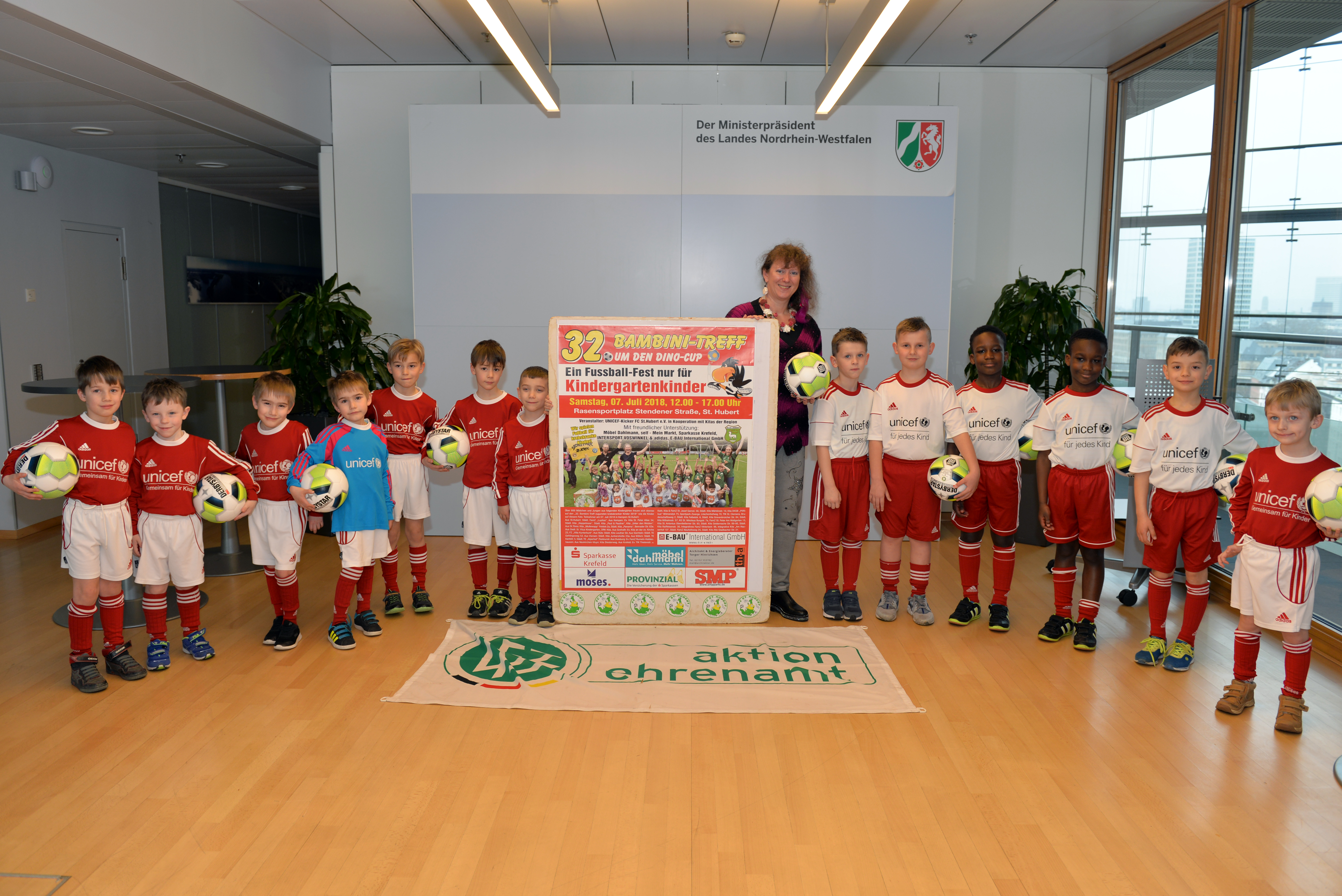 13 Jungen von den UNICEF-Kickern des FC St. Hubert e.V. waren zu Gast in der Staatskanzlei, um das Ankündigungsplakat zu ihrem Bambini-Treff für krebskranke Kinder der Sport-Staatssekretärin Andrea Milz zu präsentieren.