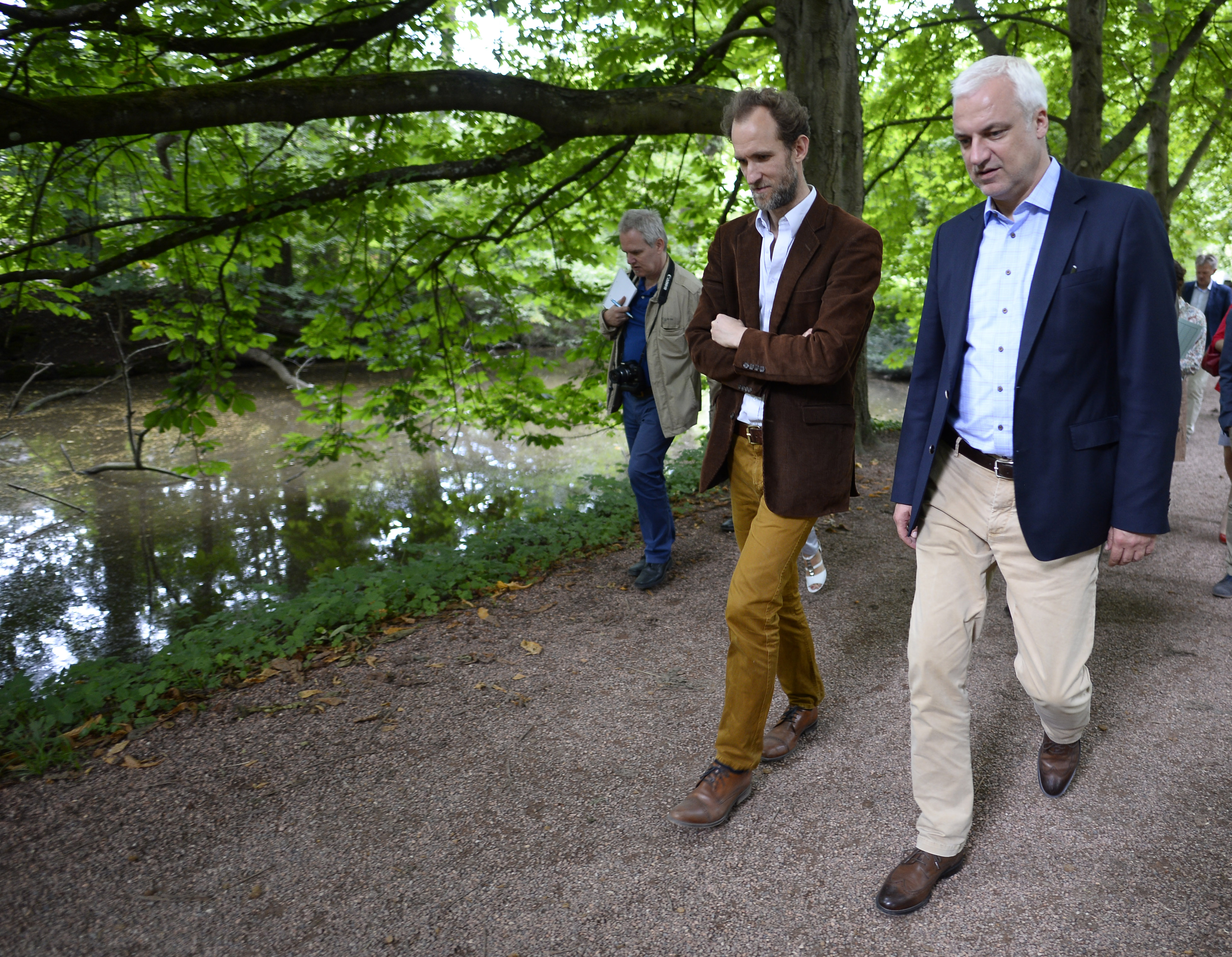 Wirtschaftsminister Garrelt Duin beim gemeinsamen Rundgang der Außenanlagen des Schlosses Türnich im Rhein-Erft-Kreis mit Graf Severin von und zu Hoensbroeck (l.).