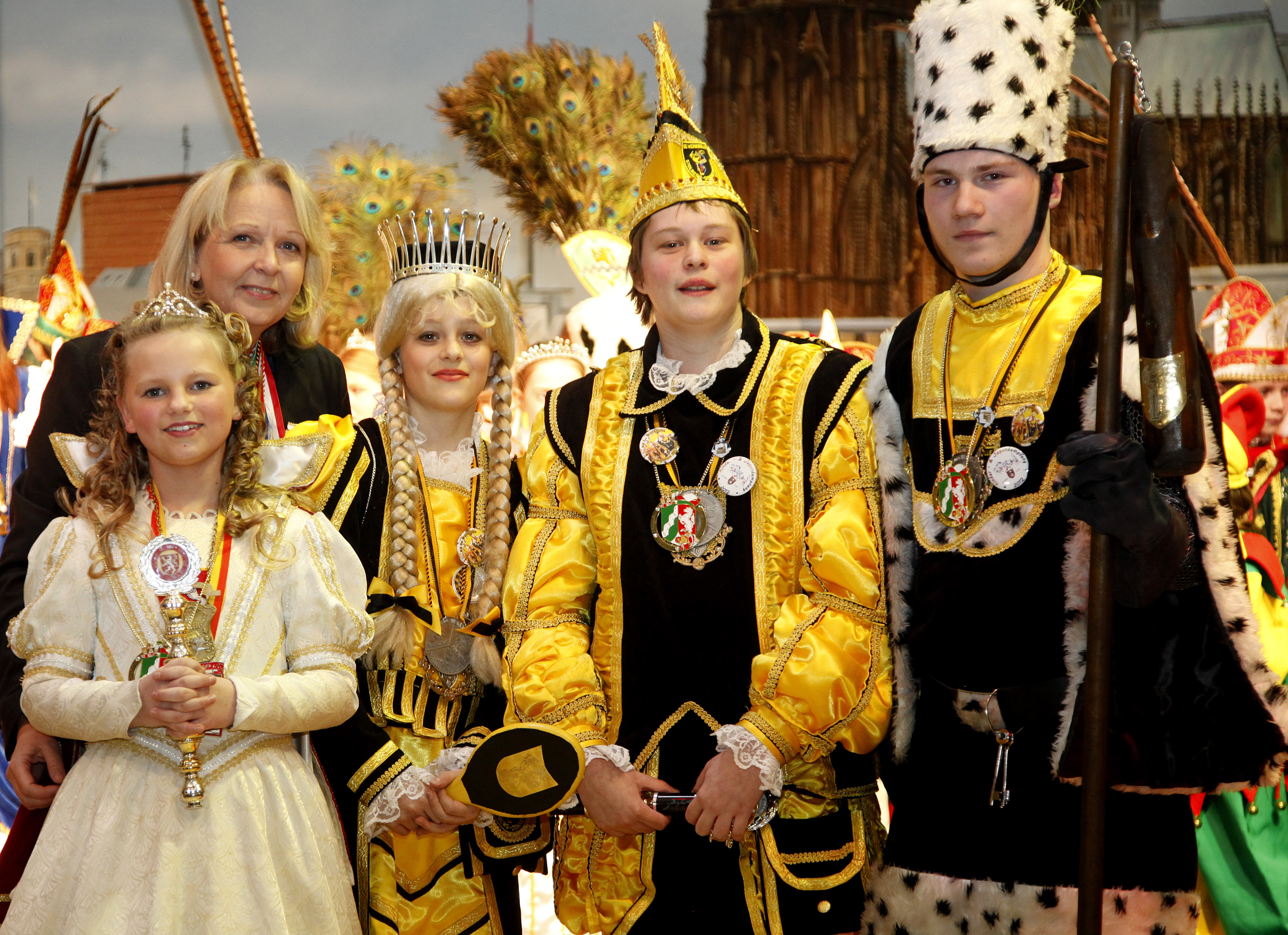 Die Prinzessin Jacqueline aus Stolberg (l) und das Dreigestirn aus Stolberg. v.l.n.r. Prinzessin Luci, Prinz Tobias und Bauer Martin.