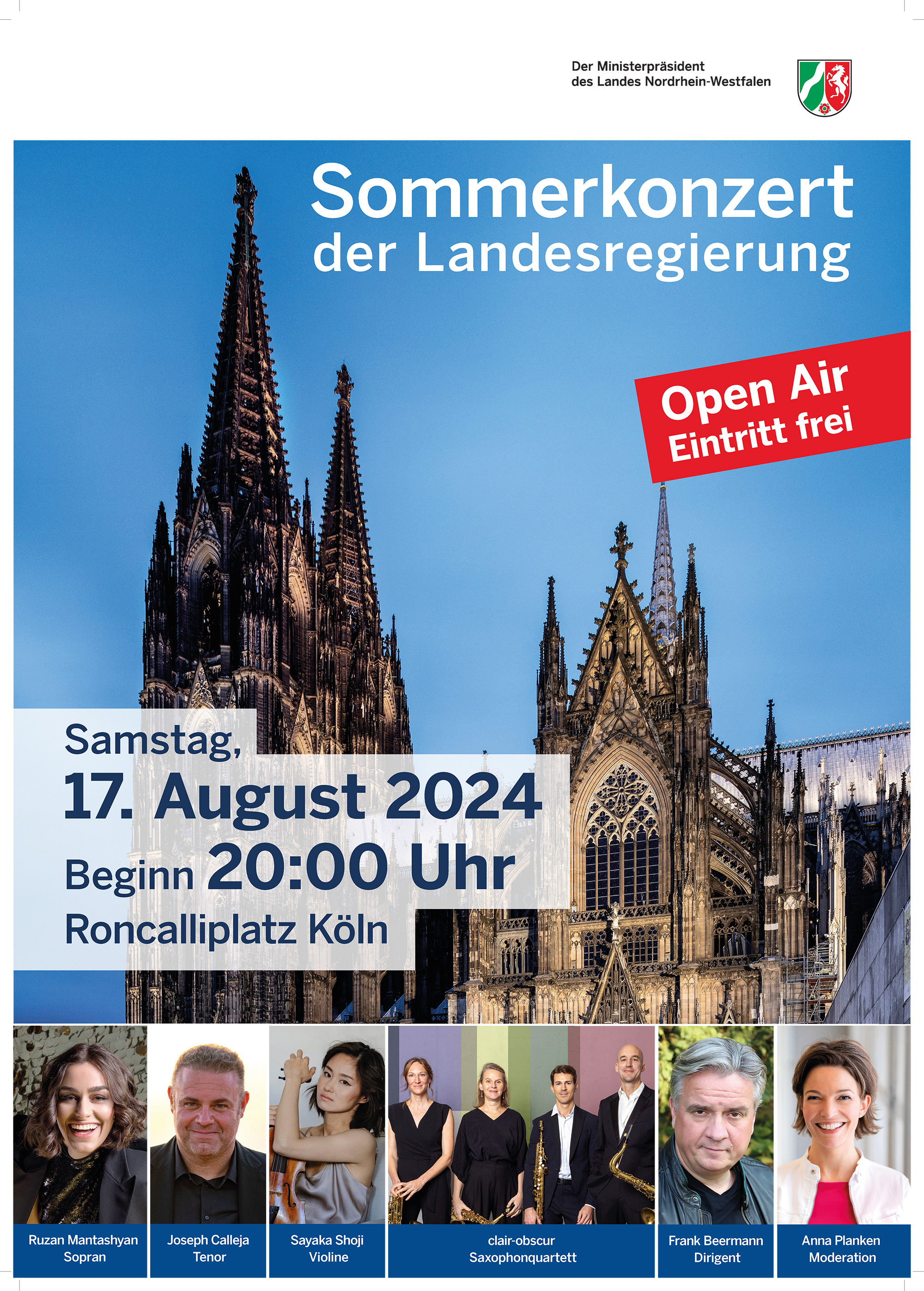 Das traditionelle Sommerkonzert der Landesregierung wird in diesem Jahr erstmalig in die Feierlichkeit rund um den Nordrhein-Westfalen-Tag integriert und findet traditionell unter dem Motto „Umsonst und draußen“ am 17. August 2024 auf dem Roncalli-Platz in Köln statt. Von 20:00 bis ca. 22:00 Uhr spielt dann die Nordwestdeutsche Philharmonie unter Leitung von Frank Beermann. Der Eintritt ist frei; eine Anmeldung ist nicht erforderlich. Das Konzert wird live im WDR-Fernsehen sowie im Radio auf WDR 3 übertragen.