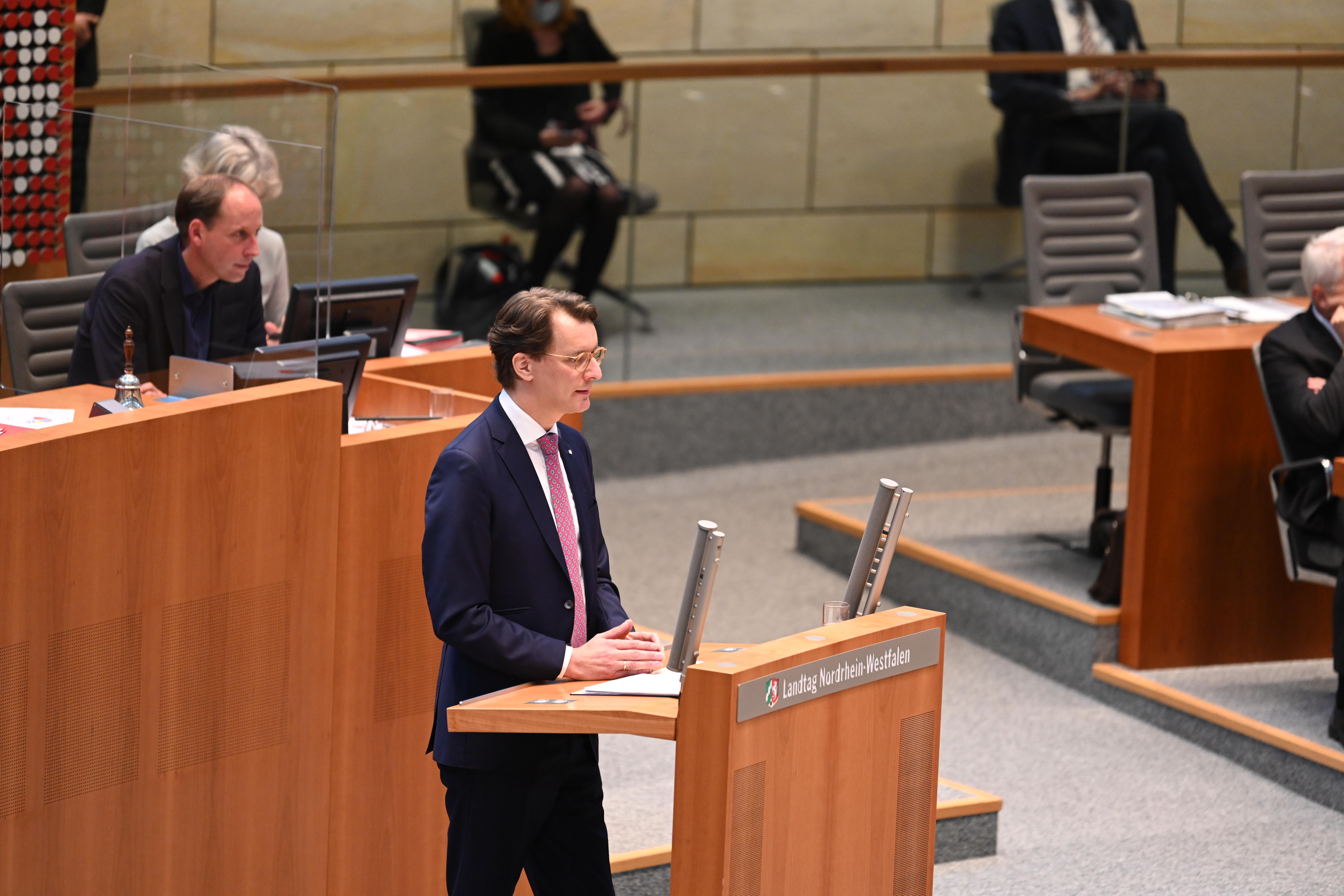 Ministerpräsident Hendrik Wüst hat am 3. November 2021 seine erste Regierungserklärung im Landtag Nordrhein-Westfalen abgegeben. Nach der Vereidigung der Mitglieder der Landesregierung durch Landtagspräsident André Kuper umriss der Ministerpräsident in seiner Rede an die Abgeordneten die Schwerpunkte seiner Politik.