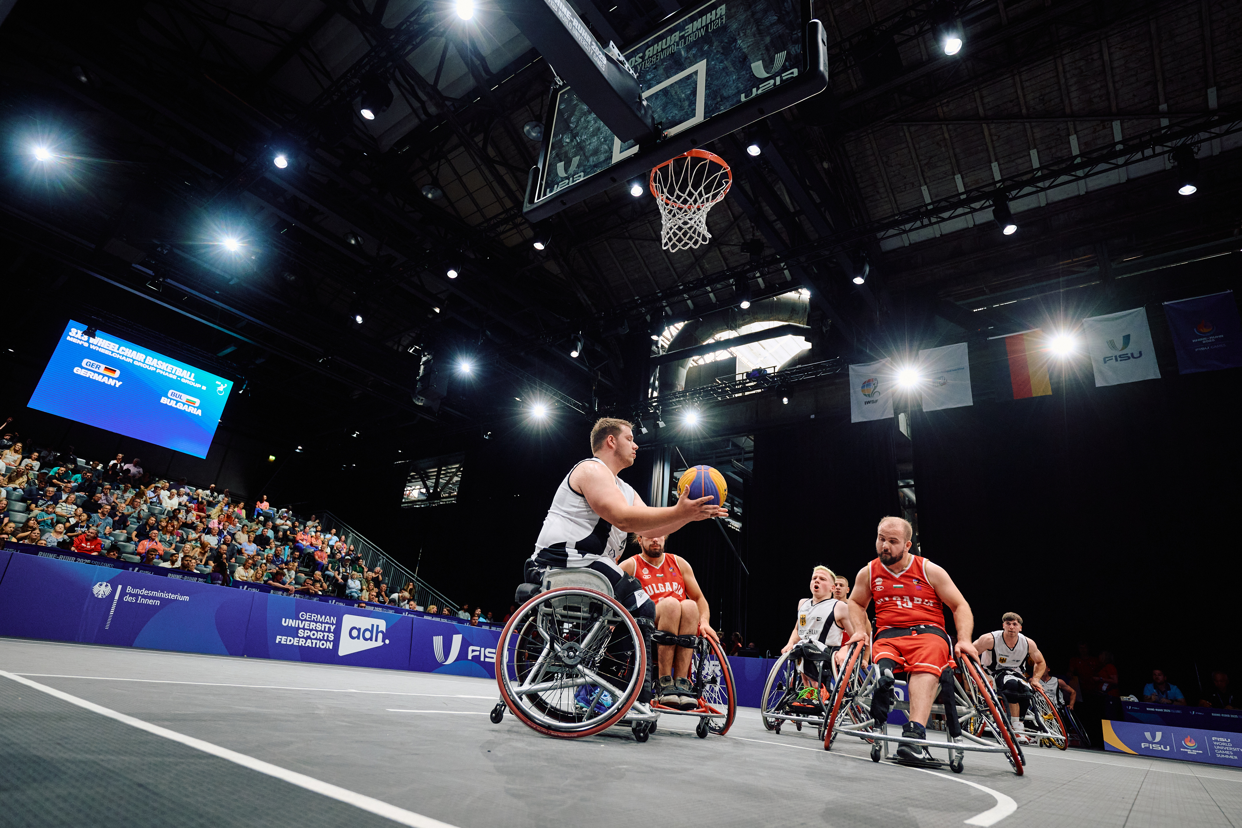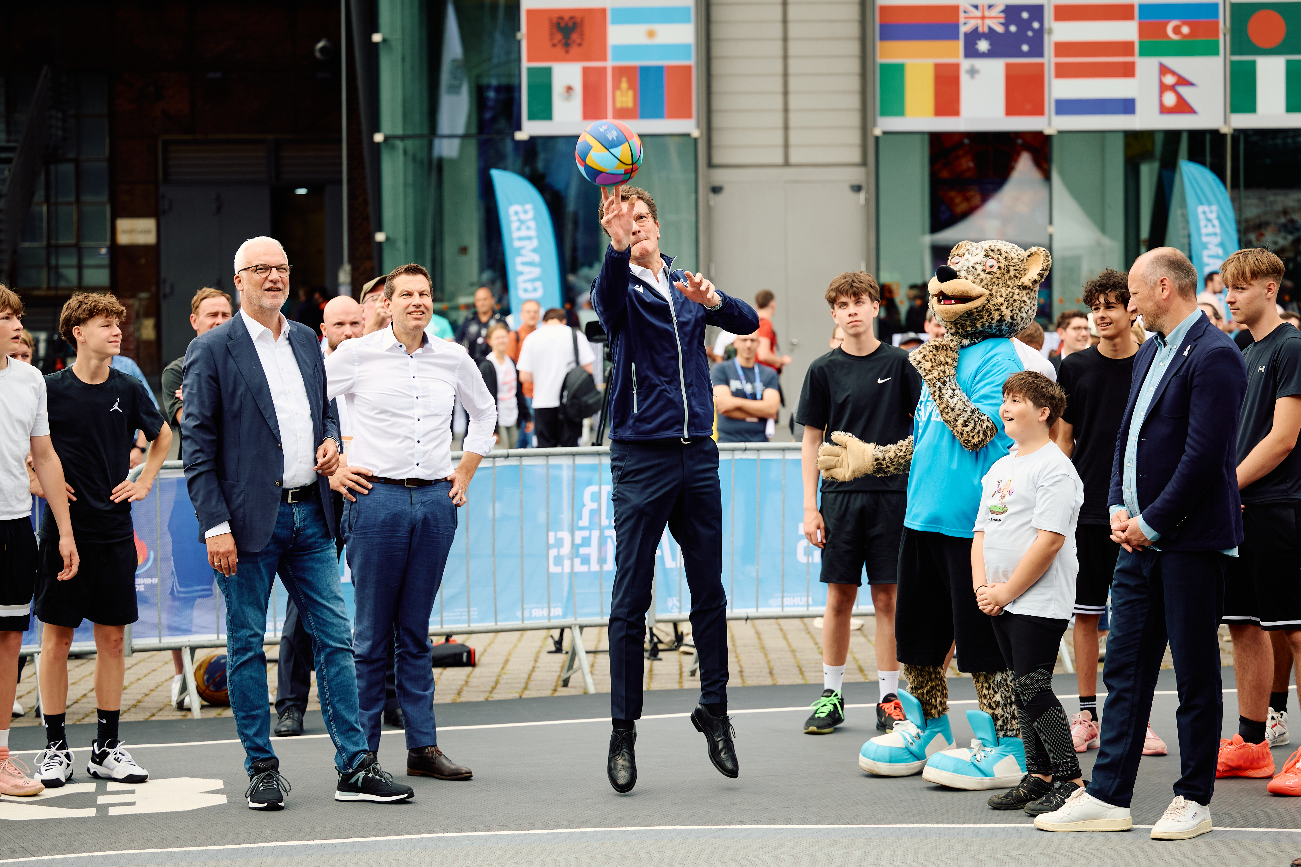 Tempo trifft Teamgeist: beim Anpfiff für die 3×3 Basketball Wettkämpfe der FISU World University Games in Bochum. 140 Athletinnen & Athleten aus 20 Nationen treten an. Das Format: 3 gegen 3, nur ein Korb auf halbem Spielfeld, maximal 10 Minuten Spielzeit oder 21 Punkte. Und die Sportart feiert eine besondere Premiere in #NRW: Mit Rollstuhlbasketball ist zum ersten Mal eine Para Sportart bei den FISU World University Games Summer mit dabei. Ministerpräsident Hendrik Wüst war beim Start der Wettkämpfe dabei und hat die Teams bei den ersten Gruppenspielen am Donnerstag, 17. Juli, angefeuert – und ist bei einem Rundgang über das Gelände tief in die Olympia-reife Atmosphäre der Weltspiele der Studierenden eingetaucht.