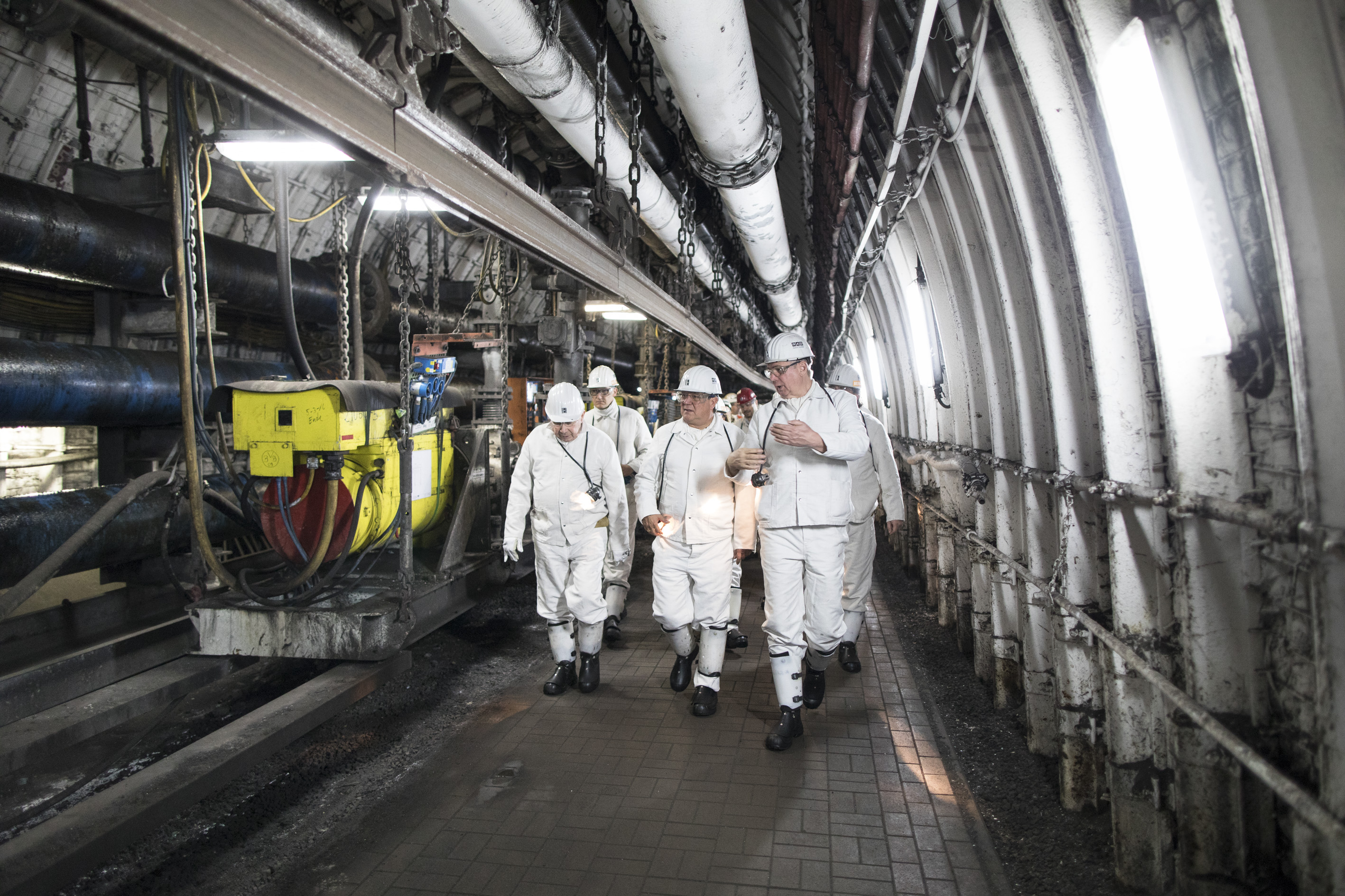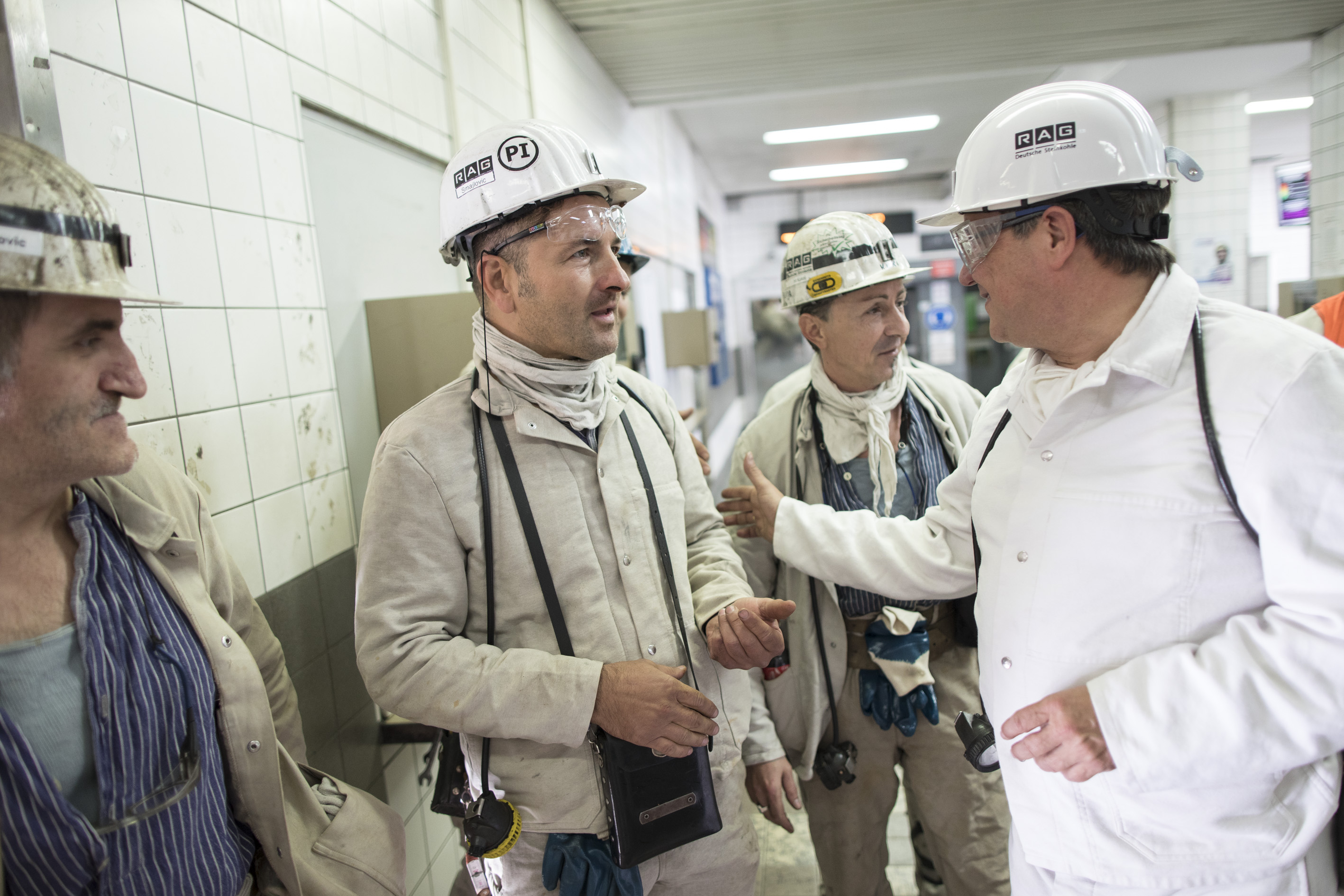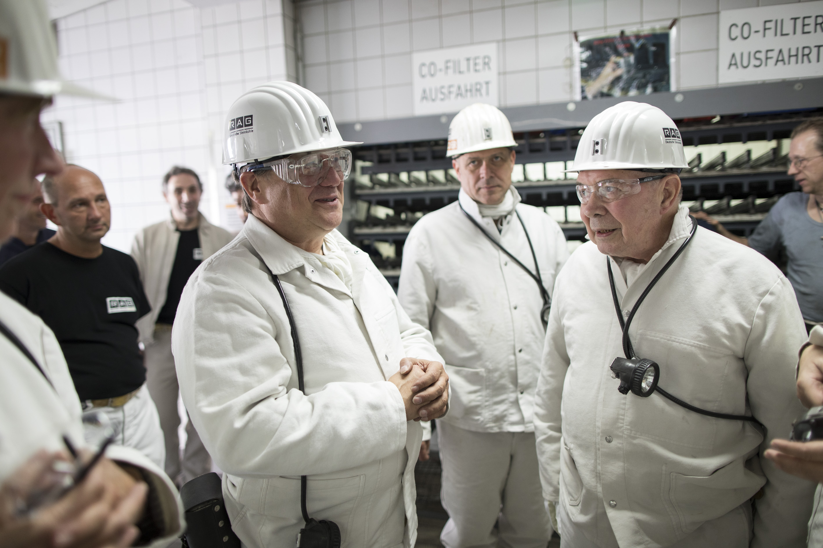 Bei der Grubenfahrt wurden Ministerpräsident Armin Laschet und die weiteren Teilnehmern per Förderkorb innerhalb von rund anderthalb Minuten auf die 1.200 Meter tiefe siebte Hauptsohle des Bergwerks Prosper-Haniel geführt. Zu Fuß und per so genannter „Dieselkatze“-Bahn fand bei rund 30 Grad Lufttemperatur eine Erkundung des noch laufenden Produktionsbetriebs im Flöz Zollverein unter Tage statt. Unter anderem konnte sich der Ministerpräsident über die Förderarbeit mithilfe eines Schrämwalzenladers informieren, der zu den modernsten Kohleabbau-Maschinen der Welt gehört.