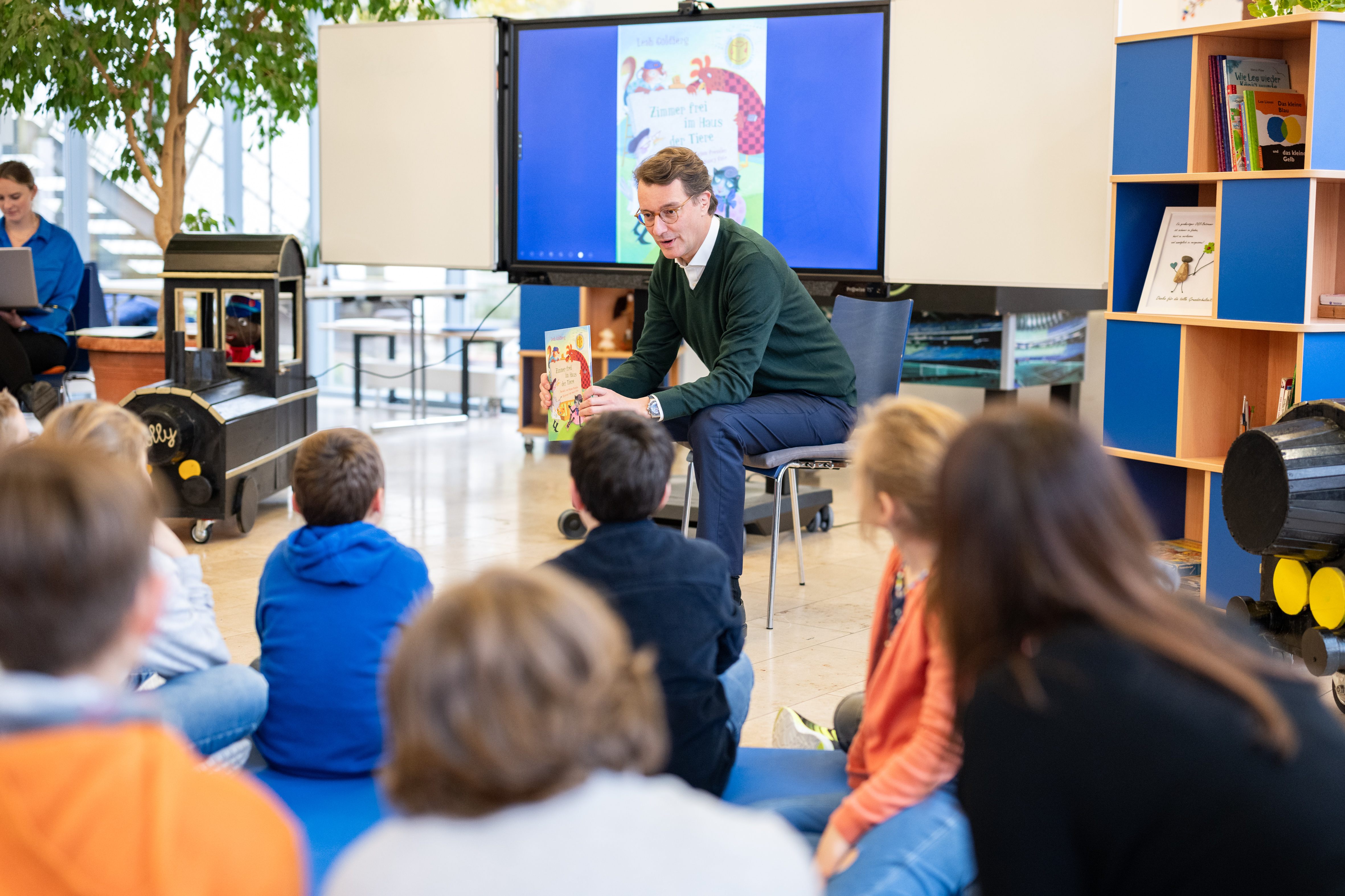 Ministerpräsident Hendrik Wüst besucht gemeinsam mit Henning Krautmacher, stellvertretender Vorsitzender des gemeinnützigen Vereins „Run & Ride for Reading“, den „Leseclub“ an der Michael-Ende-Schule in Neuss und liest aus dem Kinderbuch „Zimmer frei im Haus der Tiere“ der israelischen Schriftstellerin Leah Goldberg vor.