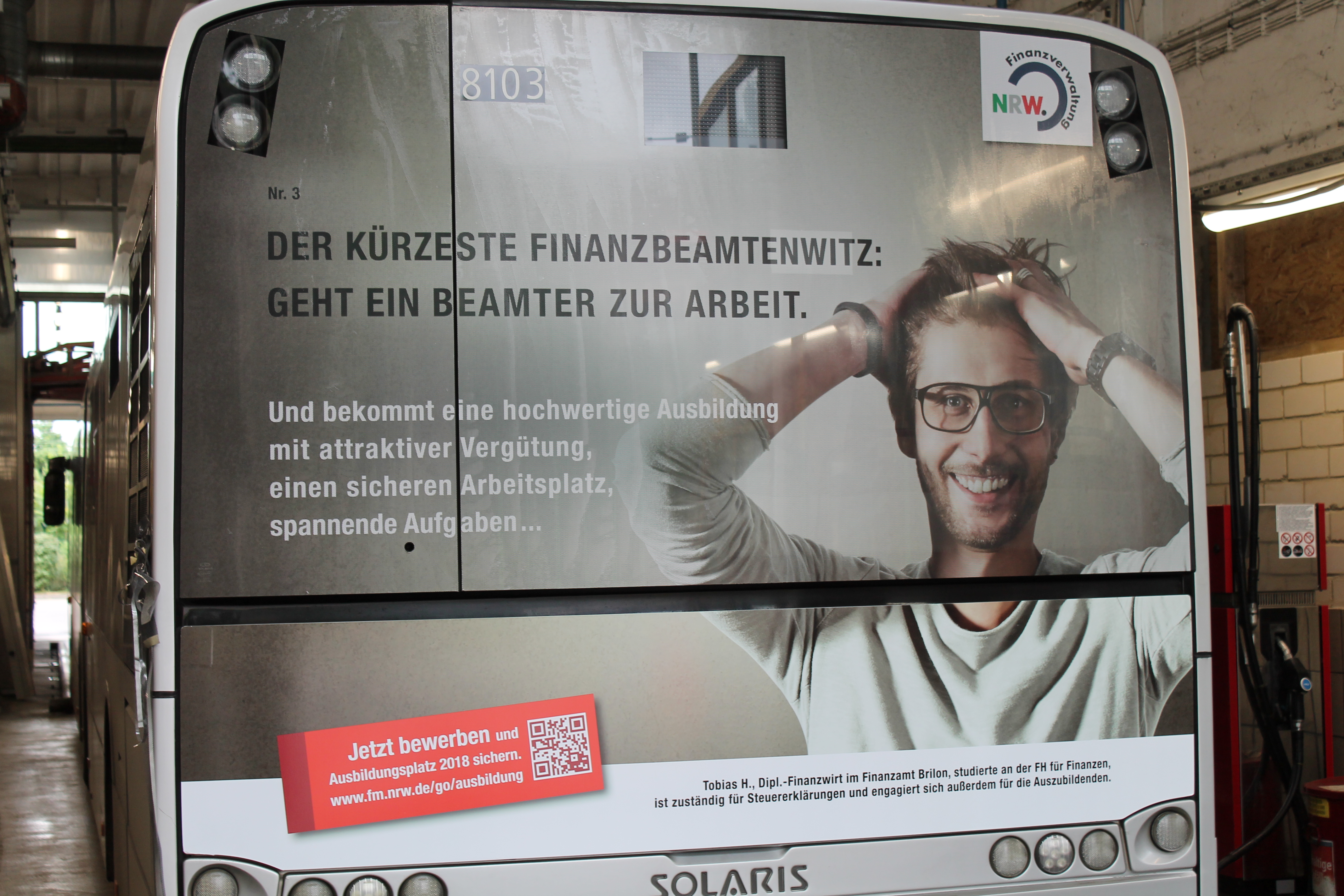 Mit einem neuen Motiv und einem weiteren Beamtenwitz startet die Finanzverwaltung NRW die dritte Runde der landesweiten Ausbildungs- und Imagekampagne „So sind wir“. Die viel beachtete Serie rund um Beamtenklischees setzt sich mit Dipl. Finanzwirt Tobias H. fort, der mit seinem Finanzbeamtenwitz buchstäblich auf Tour geht. Denn diesmal ist er großflächig auf der Rückseite von Bussen zu sehen. Bis zum 31. Juli 2017 sind die Fahrzeuge von örtlichen Verkehrsgesellschaften, auf denen Tobias H. seinen Witz erzählt, in neun Städten in ganz NRW unterwegs. Dem Beamtenwitz: „Der kürzeste Finanzbeamtenwitz: Geht ein Beamter zur Arbeit“ pariert er mit einem Hinweis auf die Motivation der Kolleginnen und Kollegen: „Und bekommt eine hochwertige Ausbildung mit attraktiver Vergütung, einen sicheren Arbeitsplatz und spannende Aufgaben.“