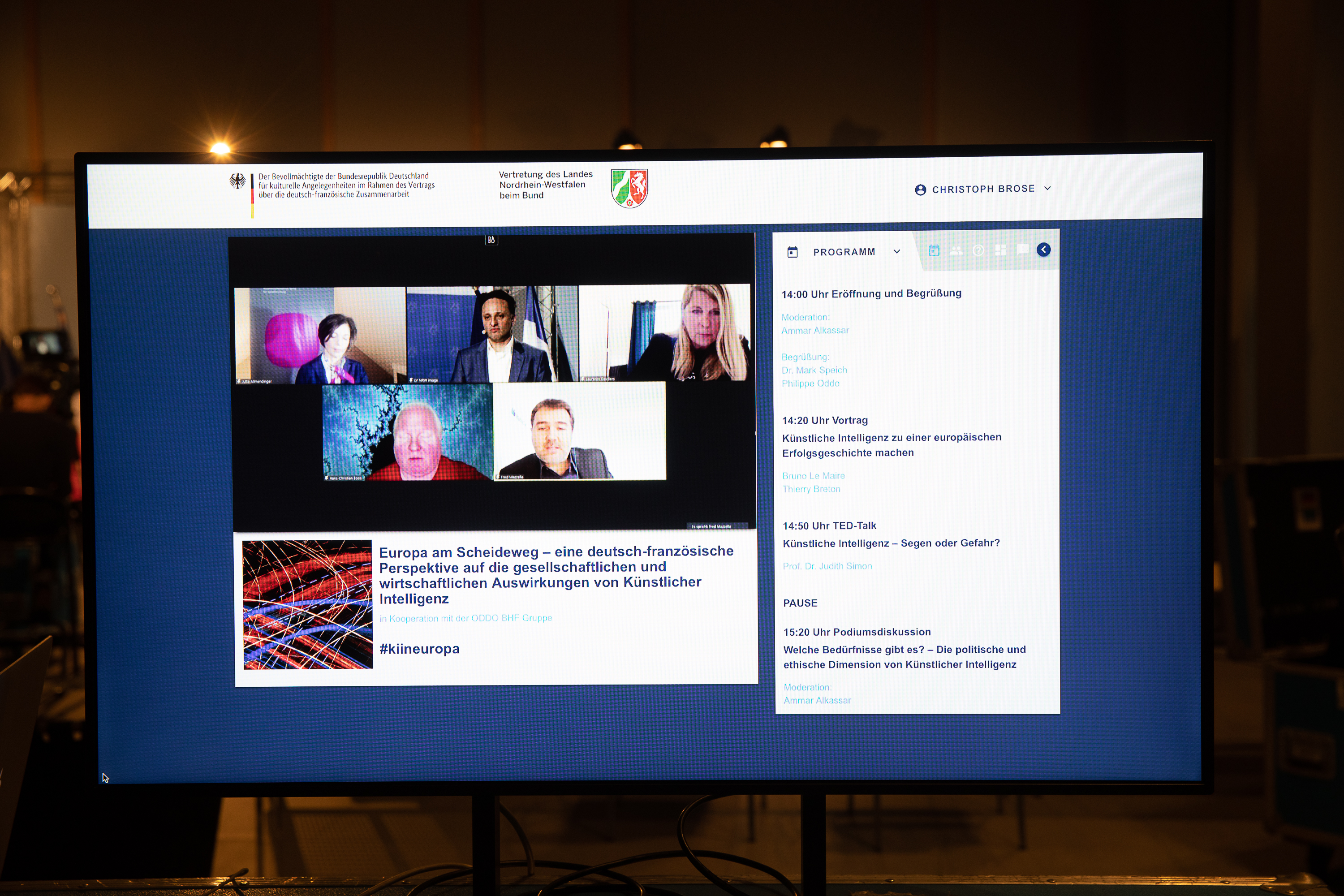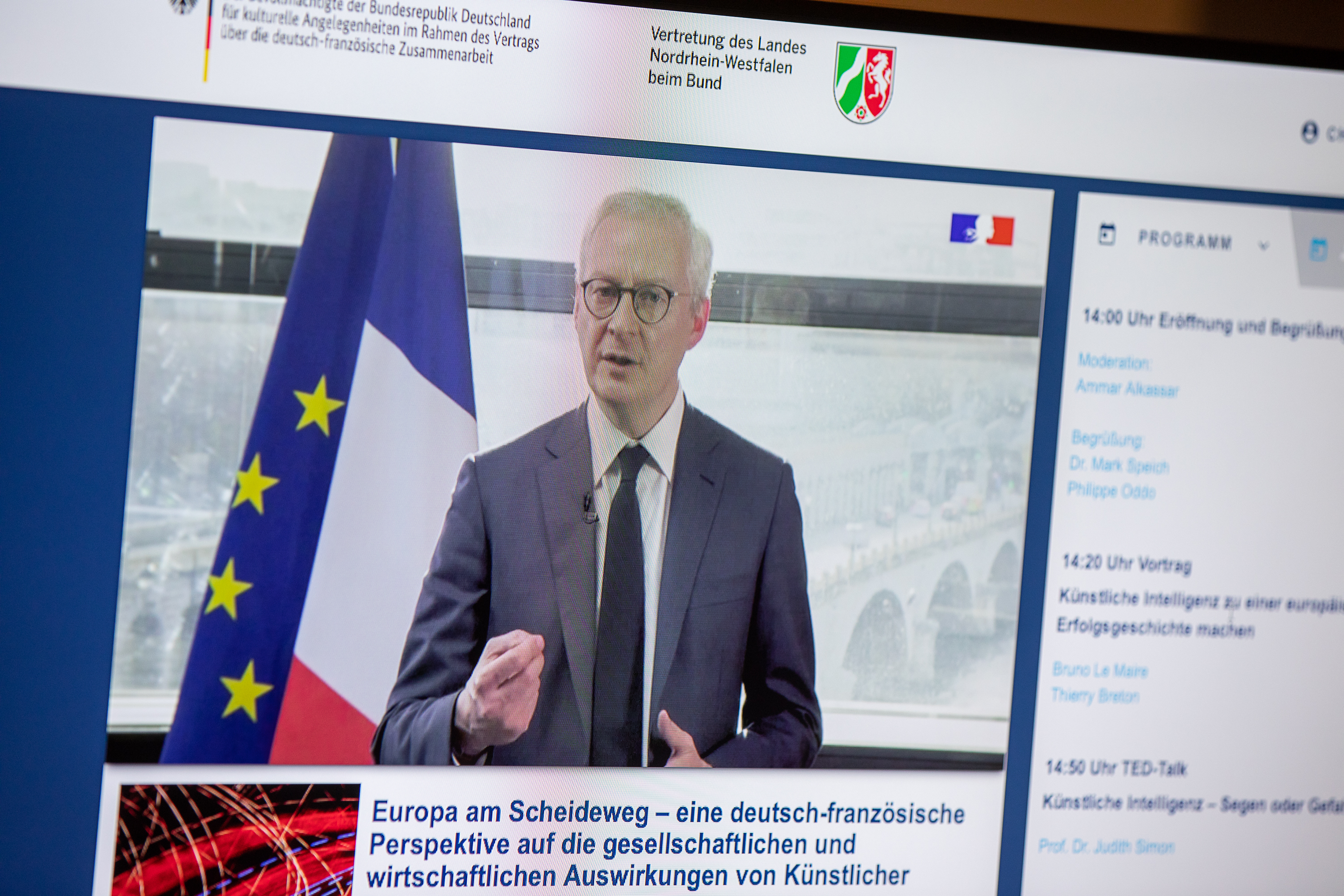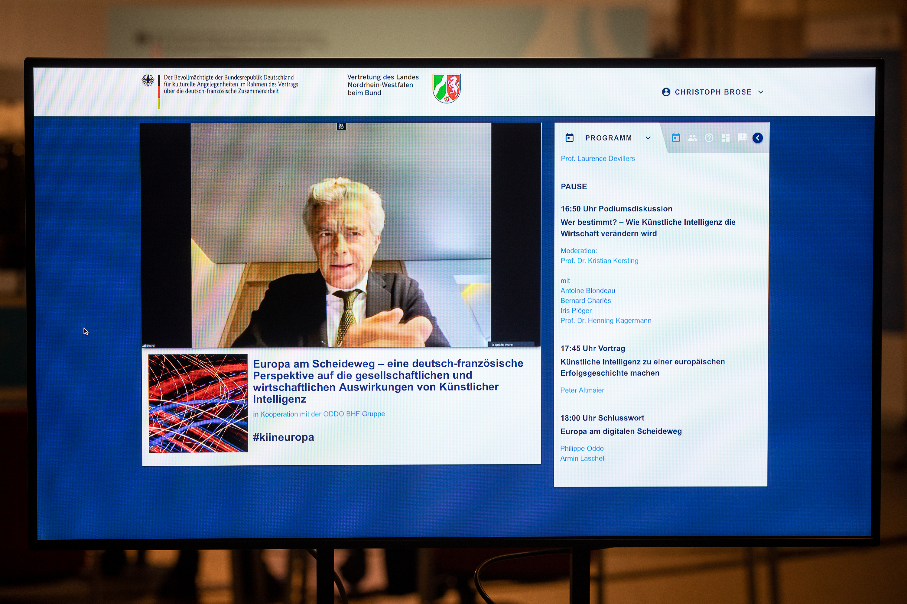 Bei der deutsch-französischen KI-Konferenz „Europa am Scheideweg - eine deutsch-französische Perspektive auf die gesellschaftlichen und wirtschaftlichen Auswirkungen von Künstlicher Intelligenz“ kamen Expertinnen aus Politik, Forschung und Wirtschaft digital zusammen. Mit dabei waren unter anderem die Soziologin Jutta Allmendinger, Bundeswirtschaftsminister Peter Altmaier, Antoine Blondeau, Gründer und Managing Partner von Alpha Intelligence Capital, Thierry Breton, EU-Kommissar für Binnenmarkt und Dienstleistungen, Bruno Le Maire, Minister für Wirtschaft und Finanzen, Frankreich, Frédéric Mazzella, Vorsitzender und Gründer von BlaBlaCar, Co-Präsident von France Digitale, Henning Kagermann, Vorsitzender des acatech Kuratoriums und ehemaliger SAP-Vorstandssprecher, sowie die Philosophin Judith Simon. Gastgeber war der Deutsch-Französische Kulturbevollmächtigte, Ministerpräsident Armin Laschet; Kooperationspartner war Philippe Oddo, Geschäftsführender Gesellschafter und Vorstandsvorsitzender der Oddo BHF Gruppe.
