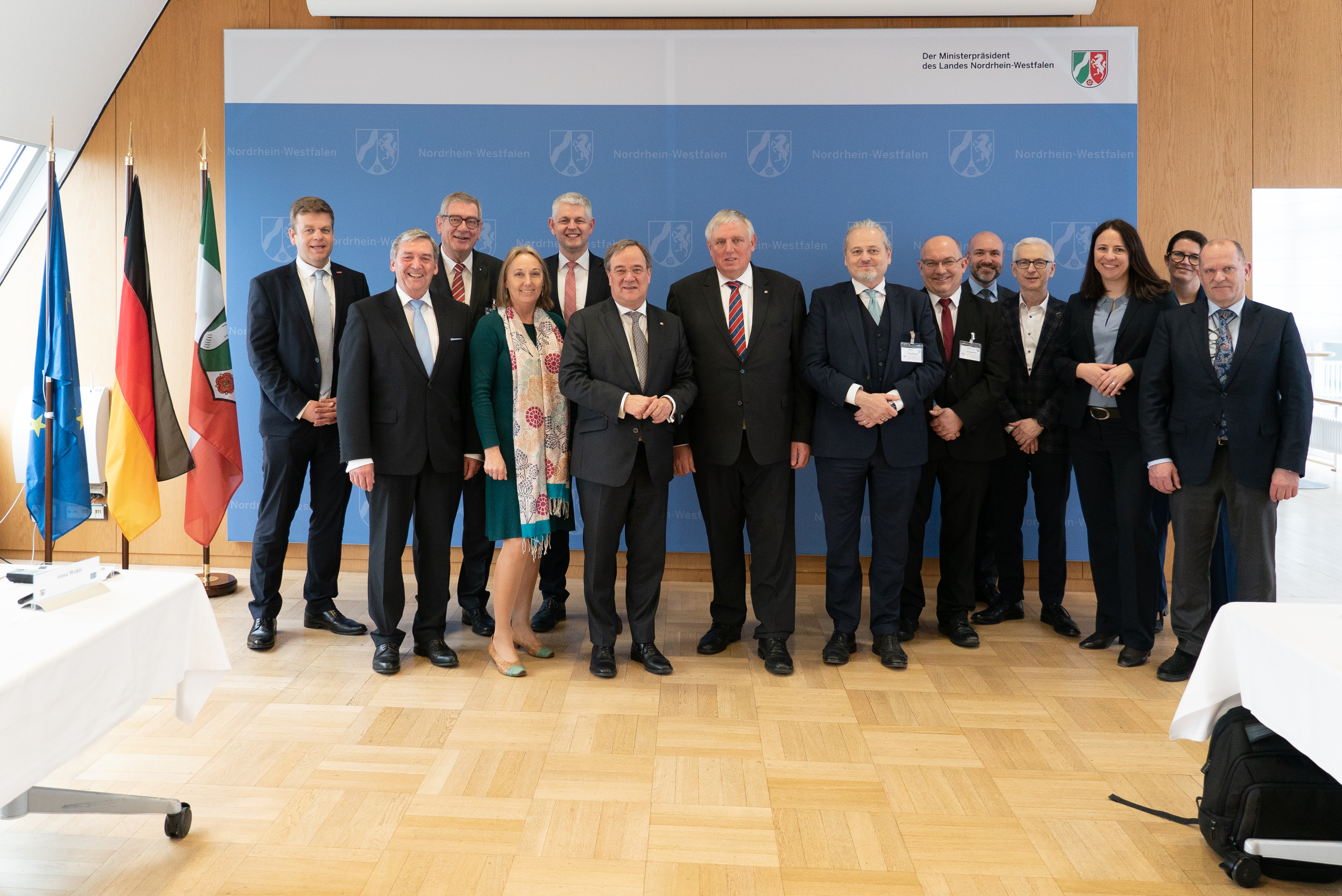 Die Partner des Ausbildungskonsenses Nordrhein-Westfalen, dem Spitzengremium von Landesregierung, Wirtschaft, Gewerkschaften, Kammern und dem Verband Freier Berufe Nordrhein-Westfalen, der Bundesagentur für Arbeit und den Kommunalen Spitzenverbänden, sind am Dienstag, 10. März 2020, auf Einladung von Arbeits- und Sozialminister Karl-Josef Laumann zu einem Spitzengespräch in der Staatskanzlei in Düsseldorf zusammengekommen. Im Mittelpunkt des Austausches, an dem auch Ministerpräsident Armin Laschet teilnahm, standen gemeinsame Aktivitäten zur Sicherung des Fachkräftenachwuchses.